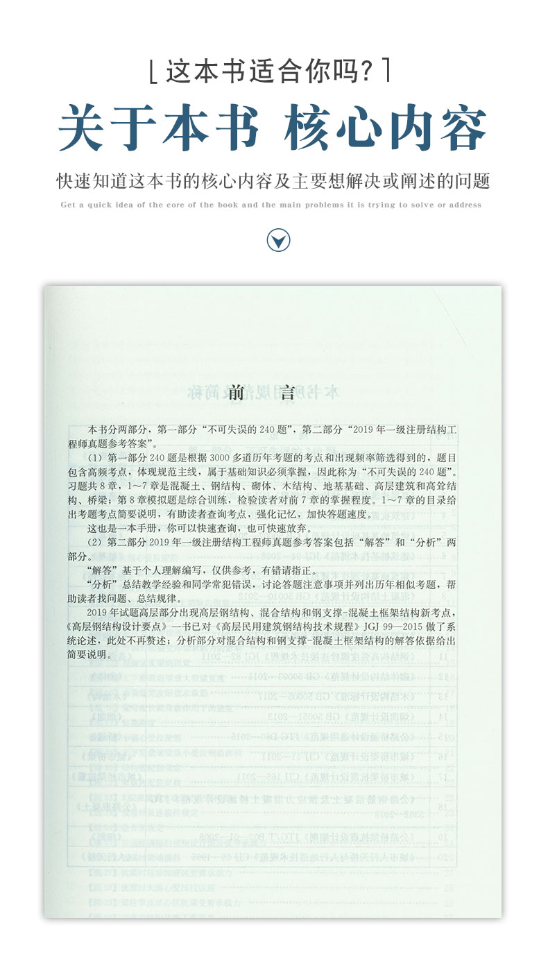 本书分两部分,第一部分“不可失误的240题”,第二部分“2019年一级注册结构工程师真题参考答案”。