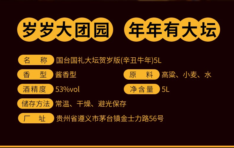 【推荐】国台 国礼坛酒辛丑牛年纪念版 53度 5000ml坛子装酒5L箱装 贵州国台酒 酱香型白酒