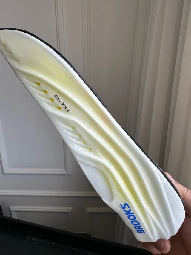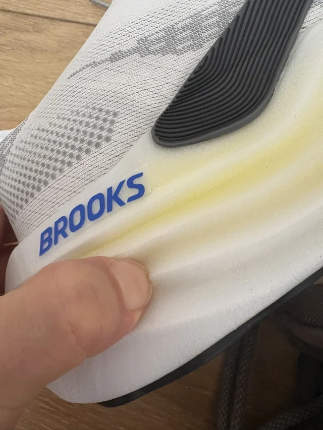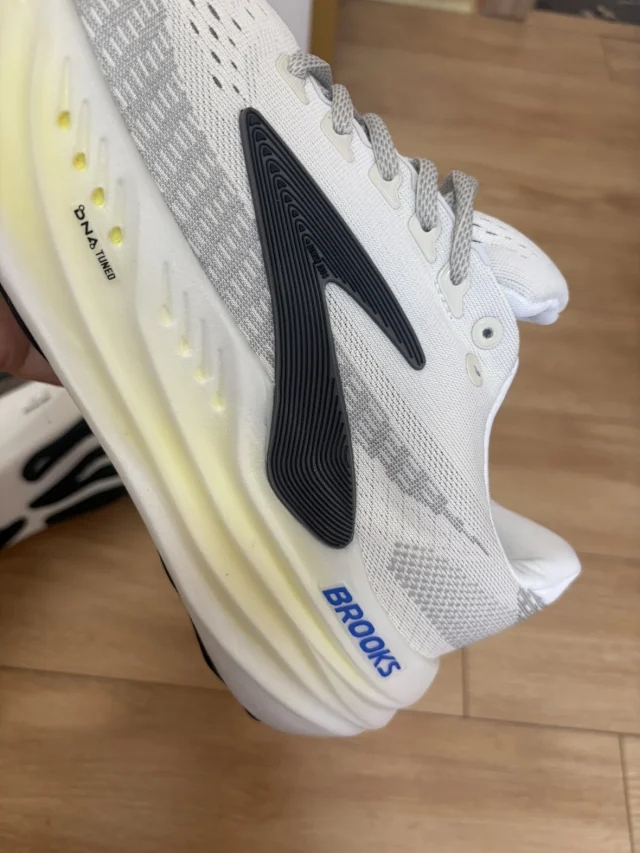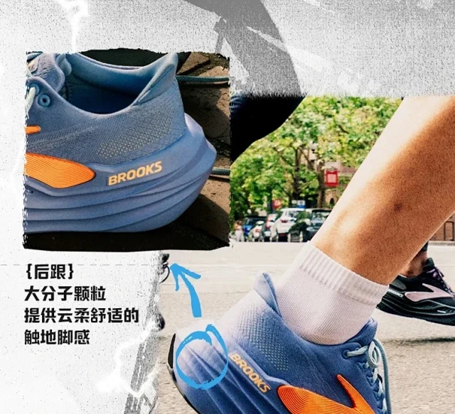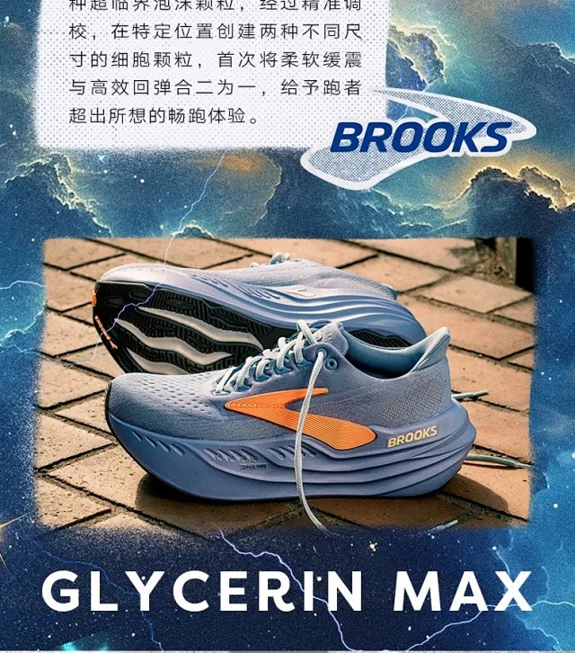 Brooks Glycerin Max超级甘油是一双主打“缓震”的跑鞋,超级甘油上脚的第一感觉就是“软弹”、“踩屎感”很强。这种“软弹”来自超厚的中底,以及两种不同尺寸的超临界泡沫颗粒。