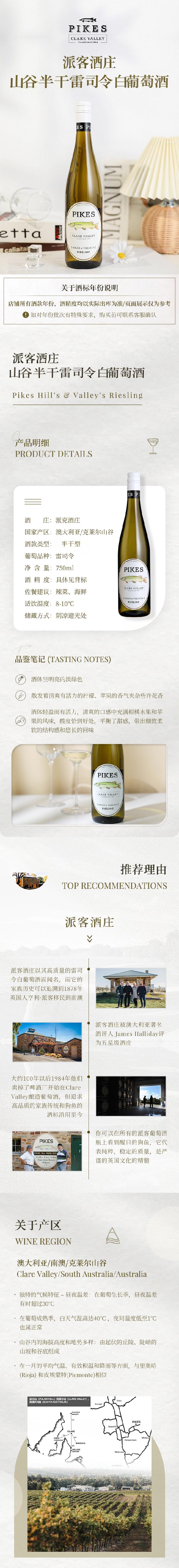 派客酒庄山谷【半甜】雷司令白葡萄酒 澳大利亚 Pikes Hill’s & Valley’s Riesling
