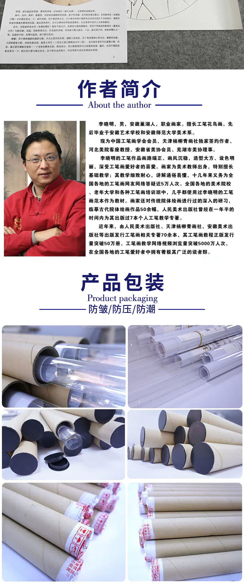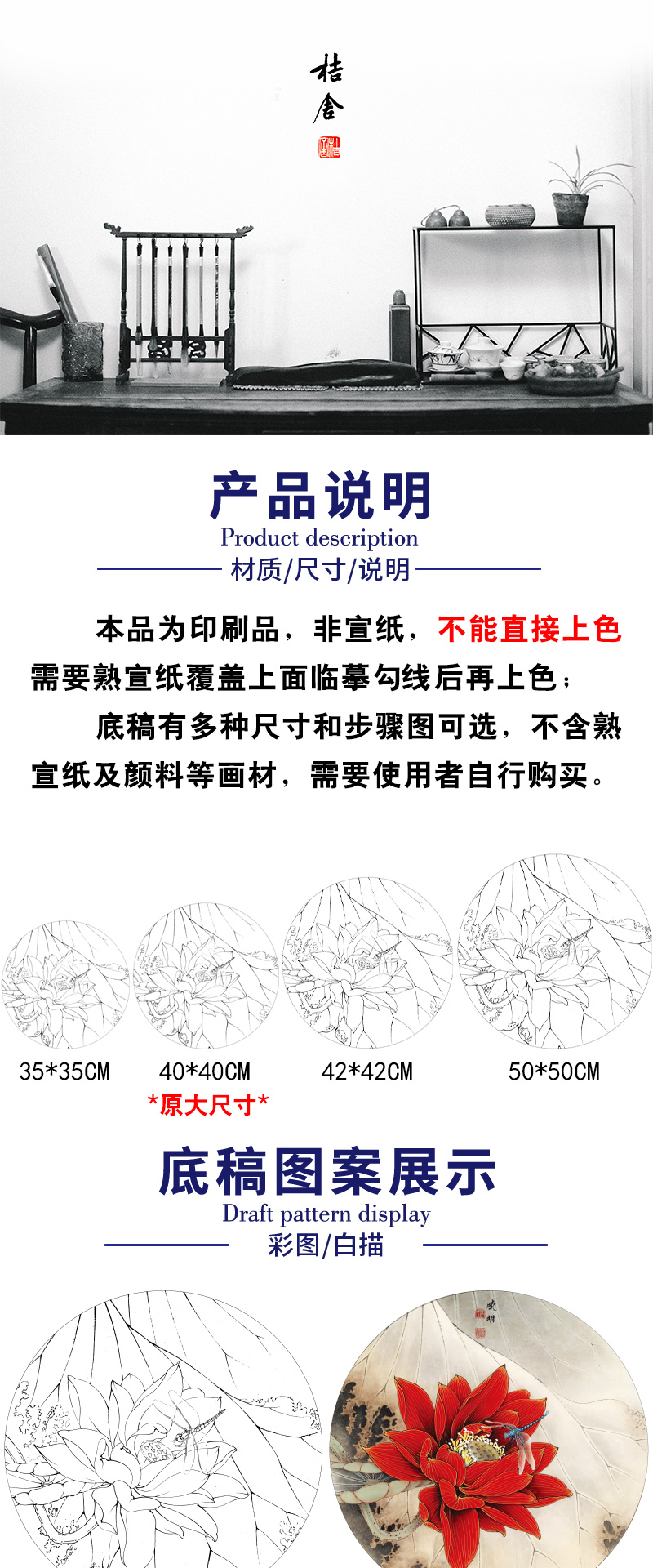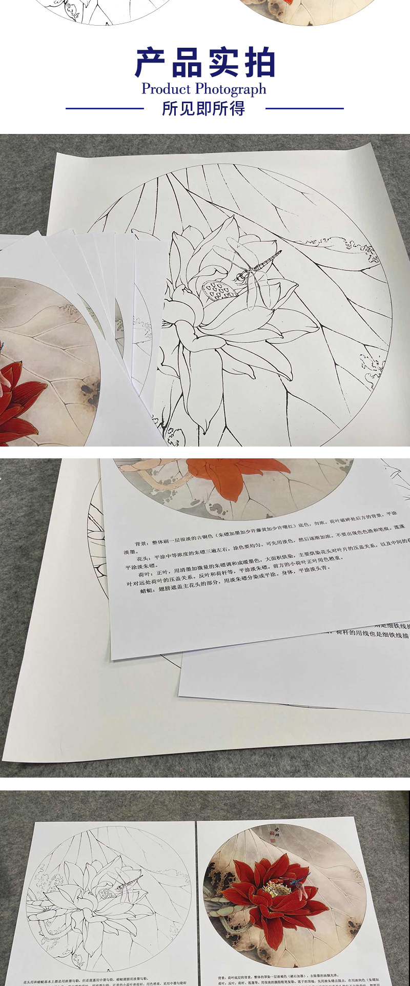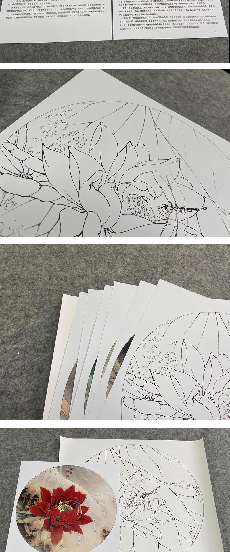 【有步骤、大彩图】李晓明工笔画白描底稿圆形小品《朱砂荷》荷花临摹勾线花鸟线稿KB06