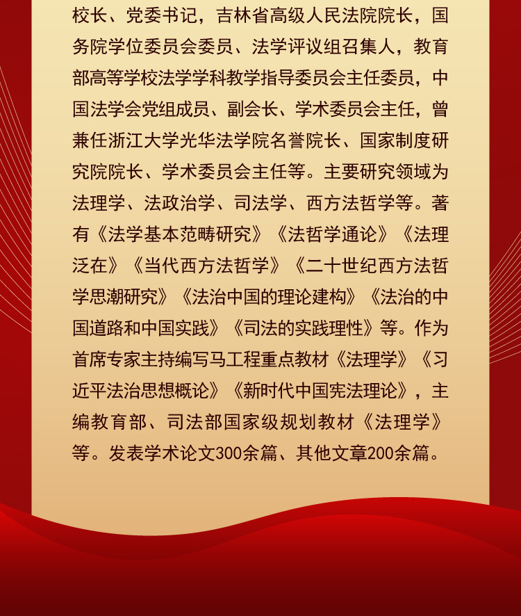 张文显,高校哲学社会科学资深教授,国家二ji大法官。zhongyang马克思主义理论研究和建设工程咨询委员会委员,国家教材委员会委员,国家“双一流”建设专家委员会委员,教yu部社会科学委员会委员、法学学部召集人,国wu院学位委员会学科发展战略咨询委员会委员,教yu部习近平法治思想研究重大专项和建构中国法学自主知识体系重大专项总召集人,中国法学会法学教育研究会会长、法学期刊研究会会长。曾任吉林大学法学院院长、副校长、dangwei书记,吉林省高级人民法院院长,国wu院学位委员会委员、法学评议组召集人,教yu部高等学校法学学科教学指导委员会主任委员,中国法学会党组成员、副会长、学术委员会主任,曾兼任浙江大学光华法学院名誉院长、国家制度研究院院长、学术委员会主任等。主要研究领域为法理学、法政治学、司法学、西方法哲学等。著有《法学基本范畴研究》《法哲学通论》《法理泛在》《当代西方法哲学》《二十世纪西方法哲学思潮研究》《法治中国的理论建构》《法治的中国道路和中国实践》《司法的实践理性》等。作为shouxi专家主持编写马工程重点教材《法理学》《xijp法治思想概论》《新时代中国宪法理论》,主编教yu部、司法部国jia级规划教材《法理学》等。发表学术论文300余篇、其他文章200余篇。