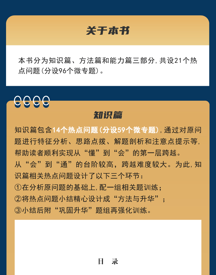 本书是面向中上层次学生的二轮复习阶段用书,立足于经典原题,以解题思想和解题策略为导向,深入分析高考中的热点问题,总结一整套行之有效的方法,旨在提升读者认识的水平,形成自洽的知识体系。本书设置若干个高考热点问题,每个热点问题下数个微课堂,每个微课堂有1道经典或新颖的典型例题,从问题特征出发,构建方法,建立策略,典型例题后设置举一反三,习题与例题内容、方法双相关,让学生学会迁移,巩固策略,将其详解详析附书后便于使用。