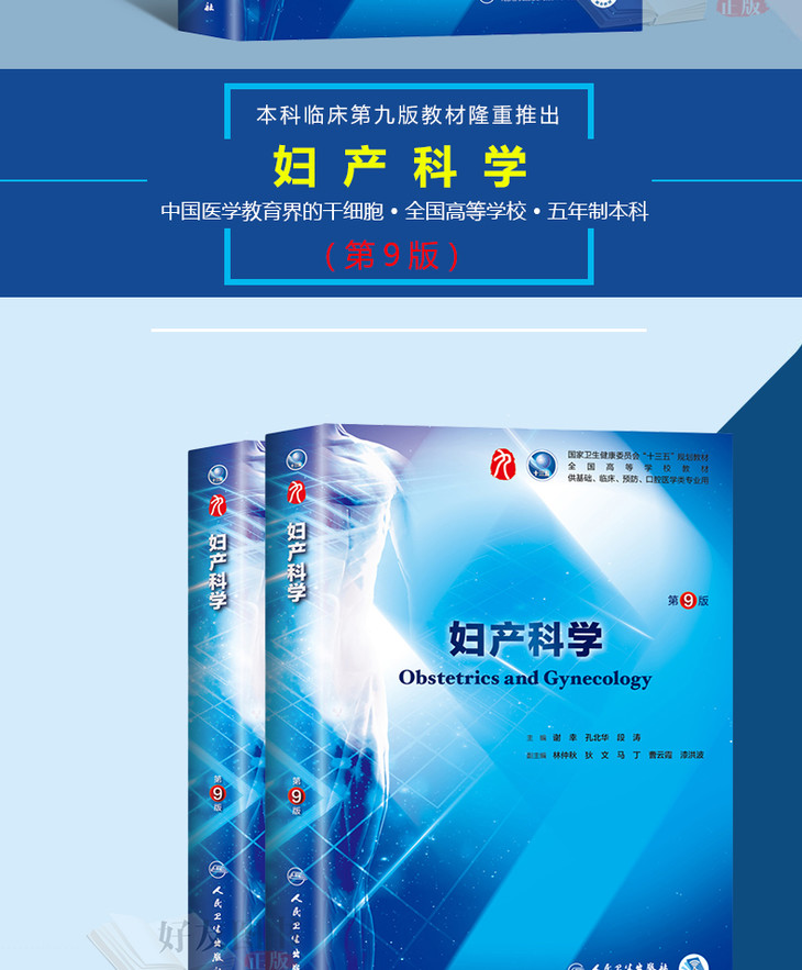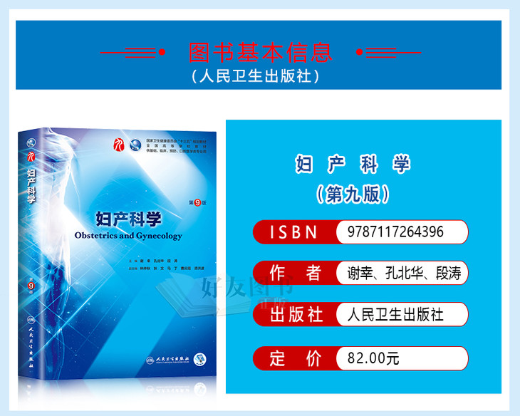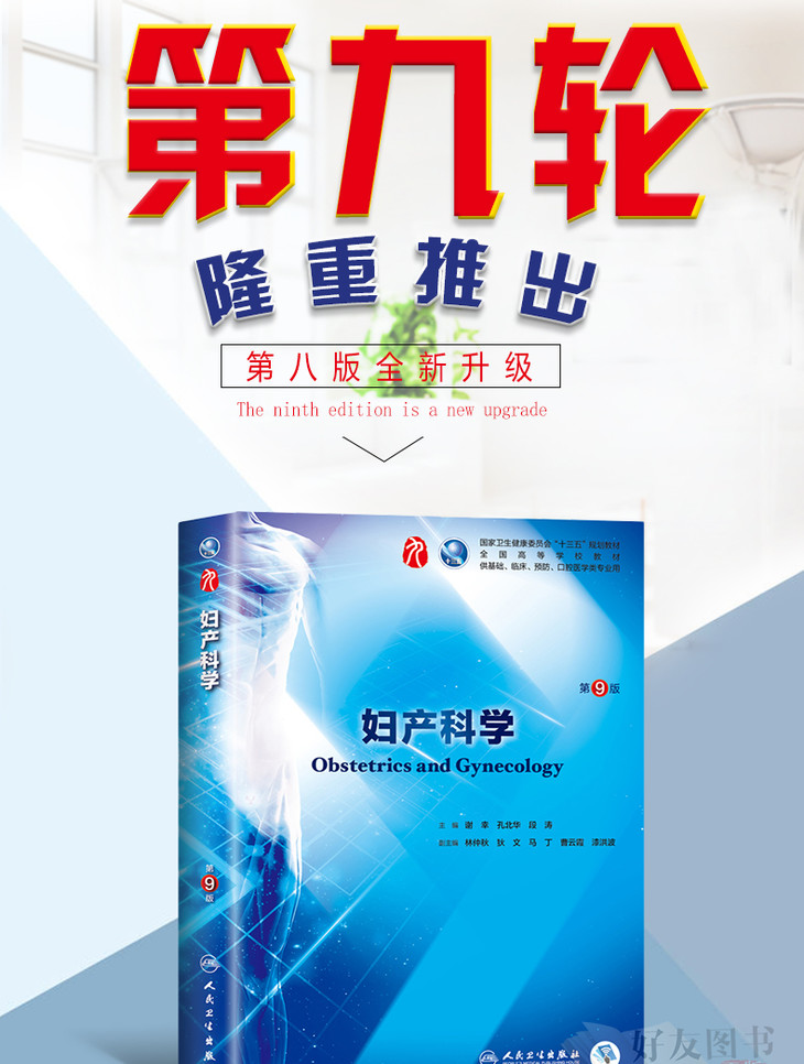 1.【出版时间】《妇产科学(第9版)》是最新版妇产科学,于2018年7月进行第一次印刷,图书ISBN编号为:9787117264396,主编:谢幸、孔北华、段涛,人卫出版社出版;