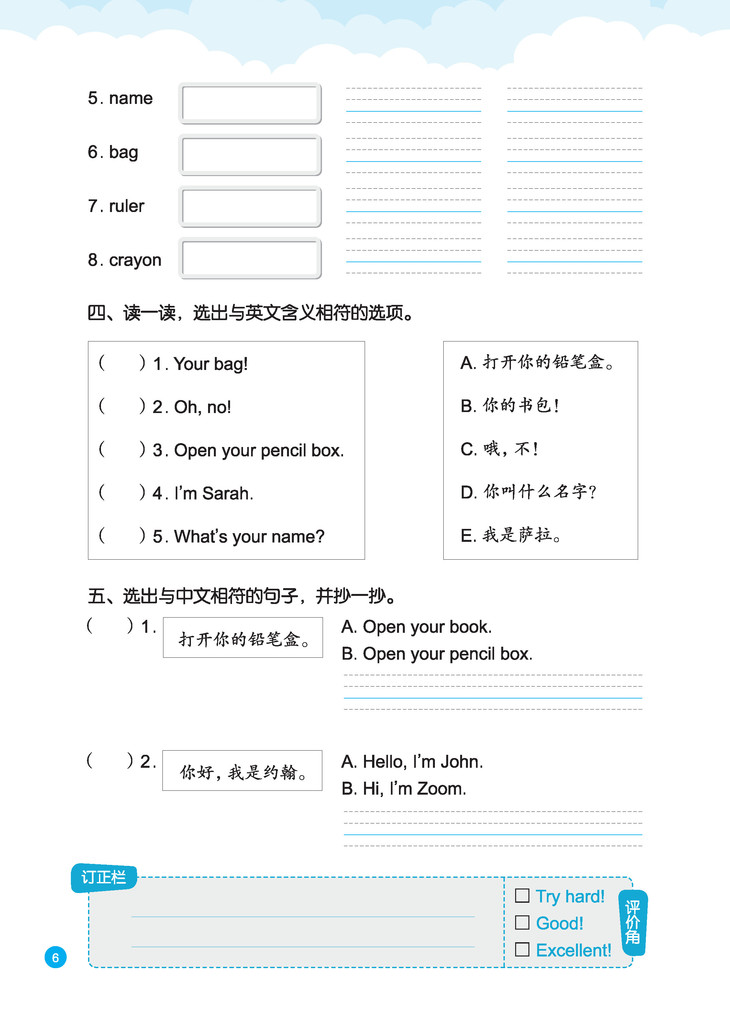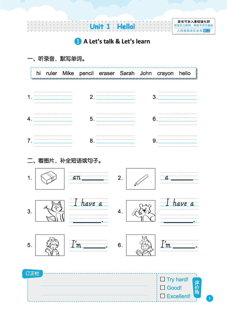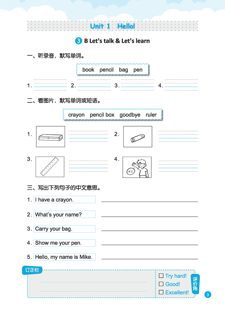 本丛书设计以基础性、趣味性、实用性和发展性为原则,每个板块重点针对字母、单词、短语、句子和篇章,设计形式多样、图文并茂的练习活动,从规范拼写、正确书写起步,力求体现以听促写、读写并举。另外,每个页面或每个单元结束还设计有“订正栏”和“评价角”,便于及时反馈和及时订正,帮助学生夯实语言知识,提升语言能力,养成良好的英语学习习惯和方法,为进一步学习打下坚实的基础。