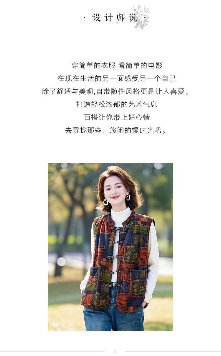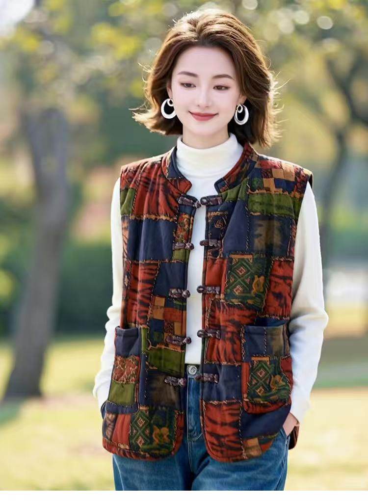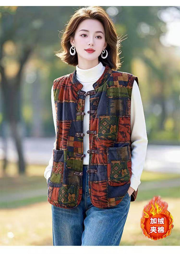 冬季新款复古印花马甲新中式盘扣无袖背心女民族风背心坎肩