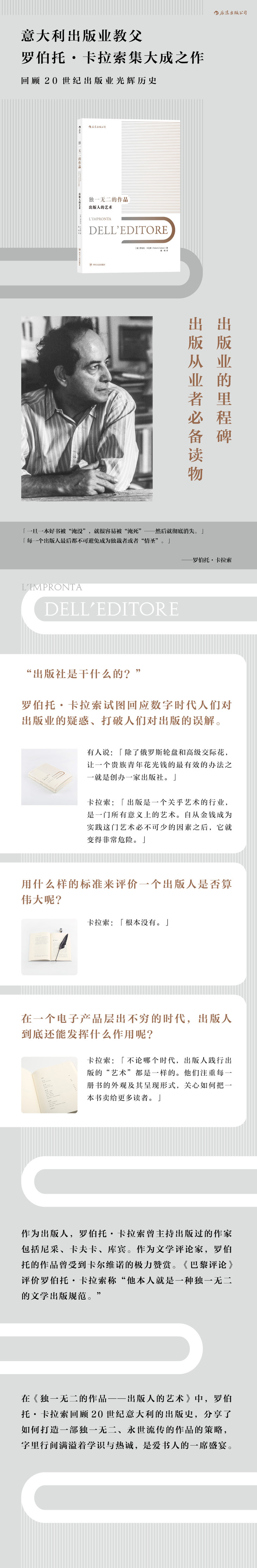 ◎ 《独一无二的作品》是罗伯托·卡拉索给出版人的礼物,被誉为出版界的里程碑。书中通过对阿德尔菲出版社半个世纪以来文学出版的光辉历史的回顾,介绍了出版业的基本情况,譬如何谓出版,出版的基本流程,出版机构的运作模式等等,并以阿德尔菲的经典出版案例为例,分享了打造一部独一无二(永世流传)作品的出版策略。当然,书中对当代出版形势也不乏讨论,罗伯托花大篇幅分享了他对全球数字化思考。