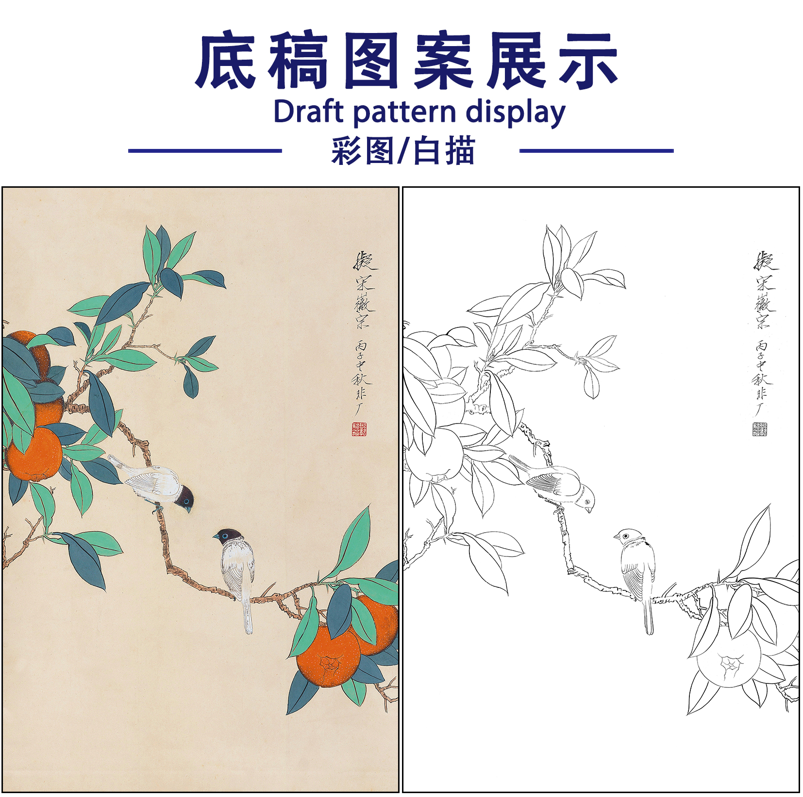 工笔画白描底稿于非闇花鸟《红柿小鸟》临摹勾线高清打印稿FA45