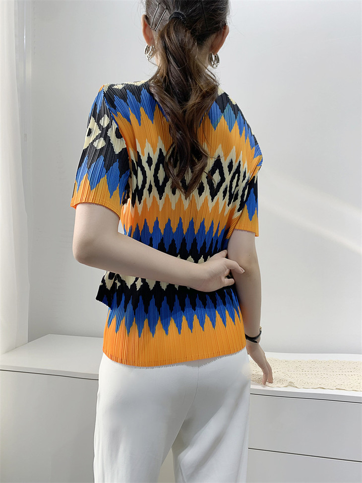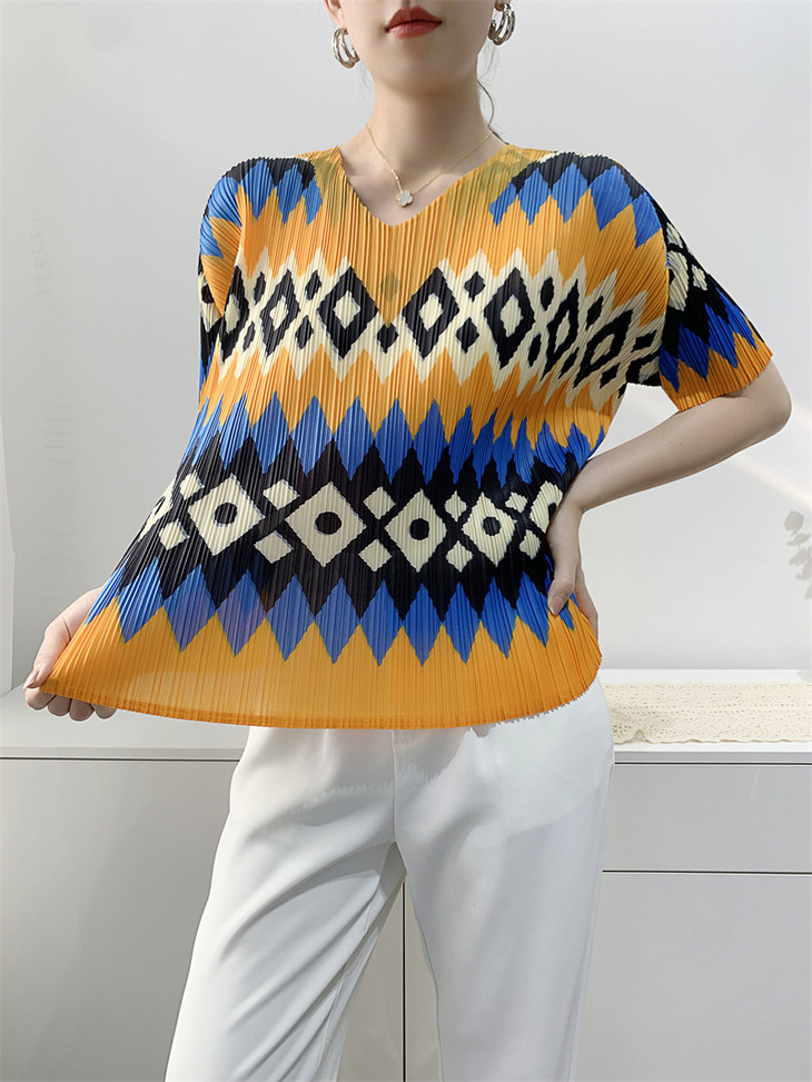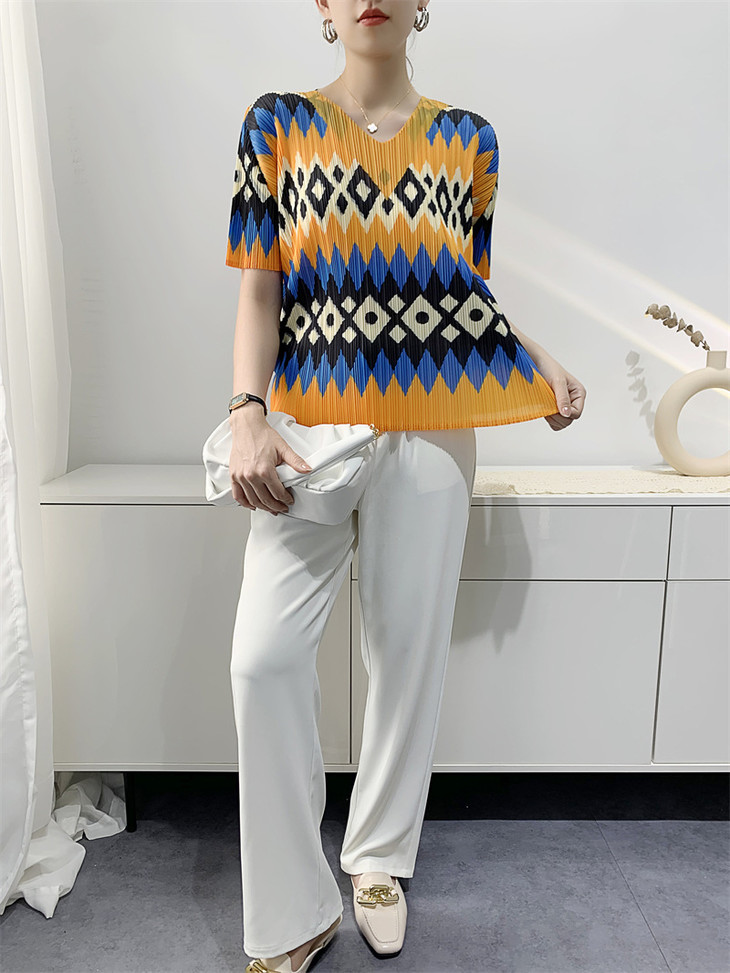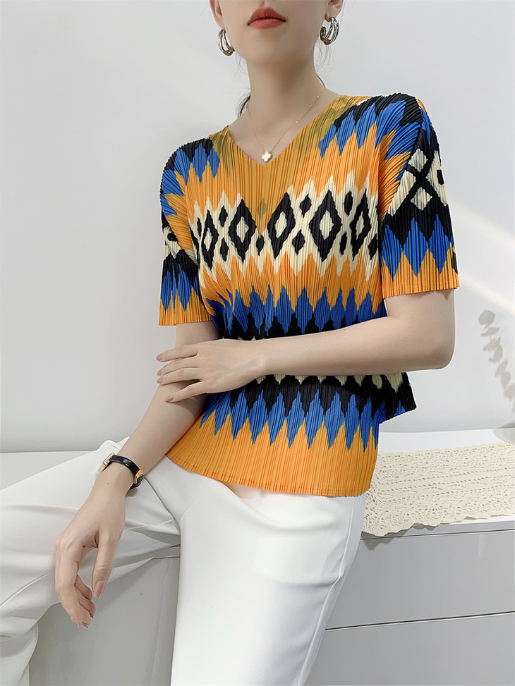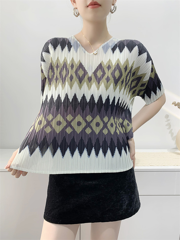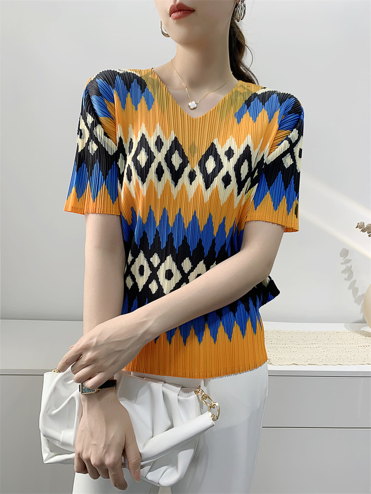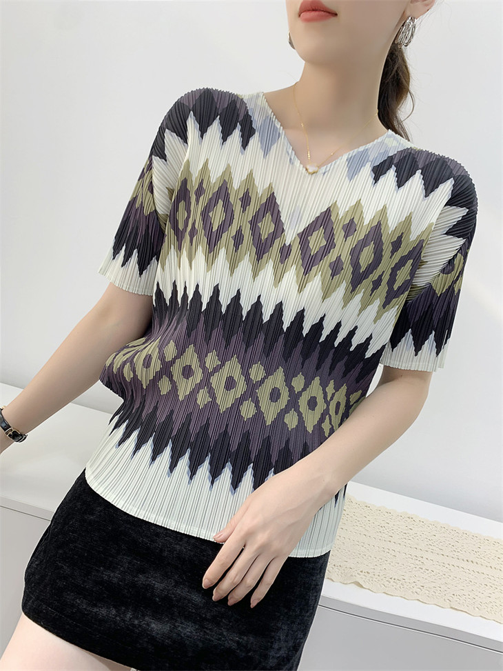 ZDFS-S-500新款时尚气质休闲V领短袖褶皱印花T恤