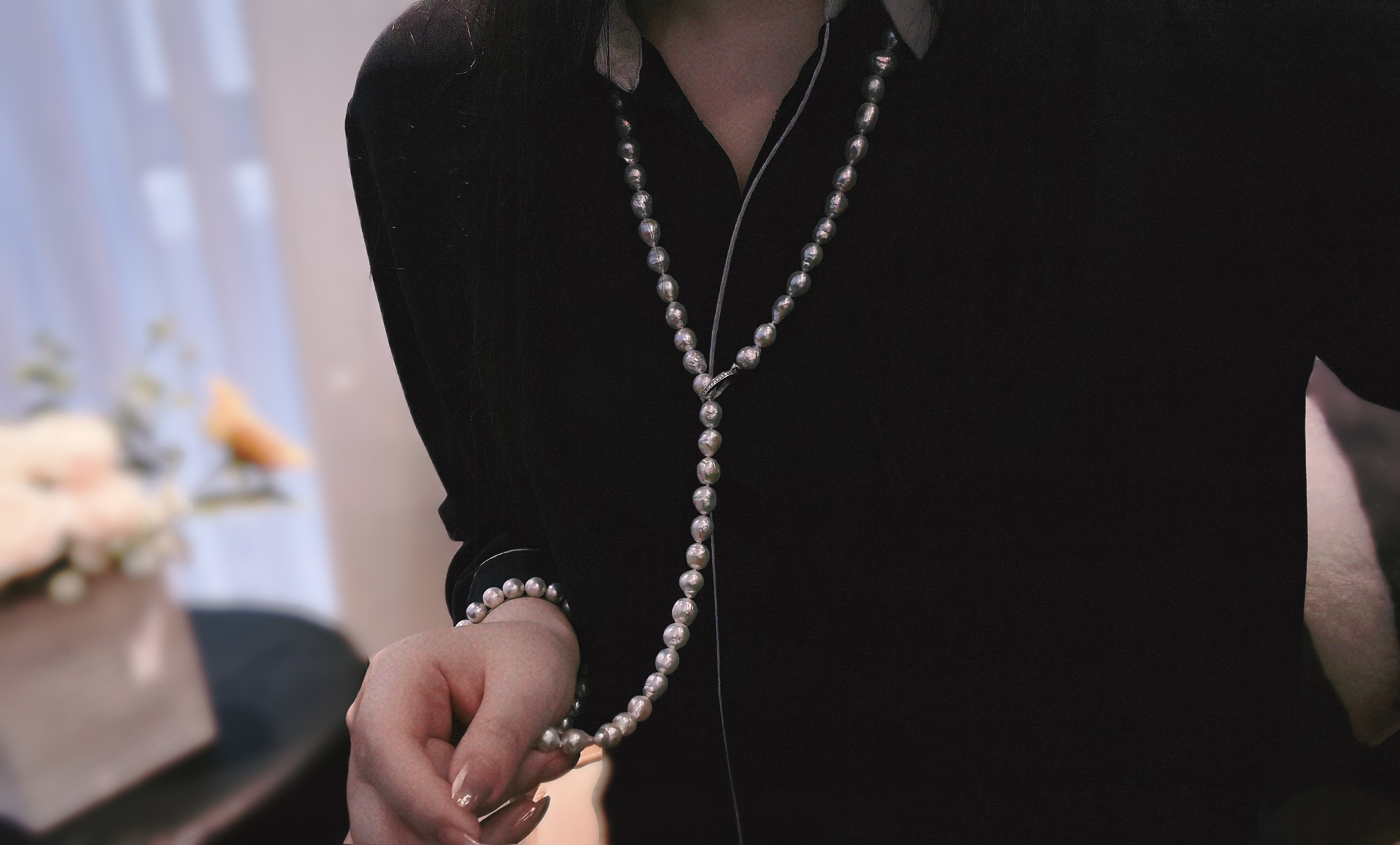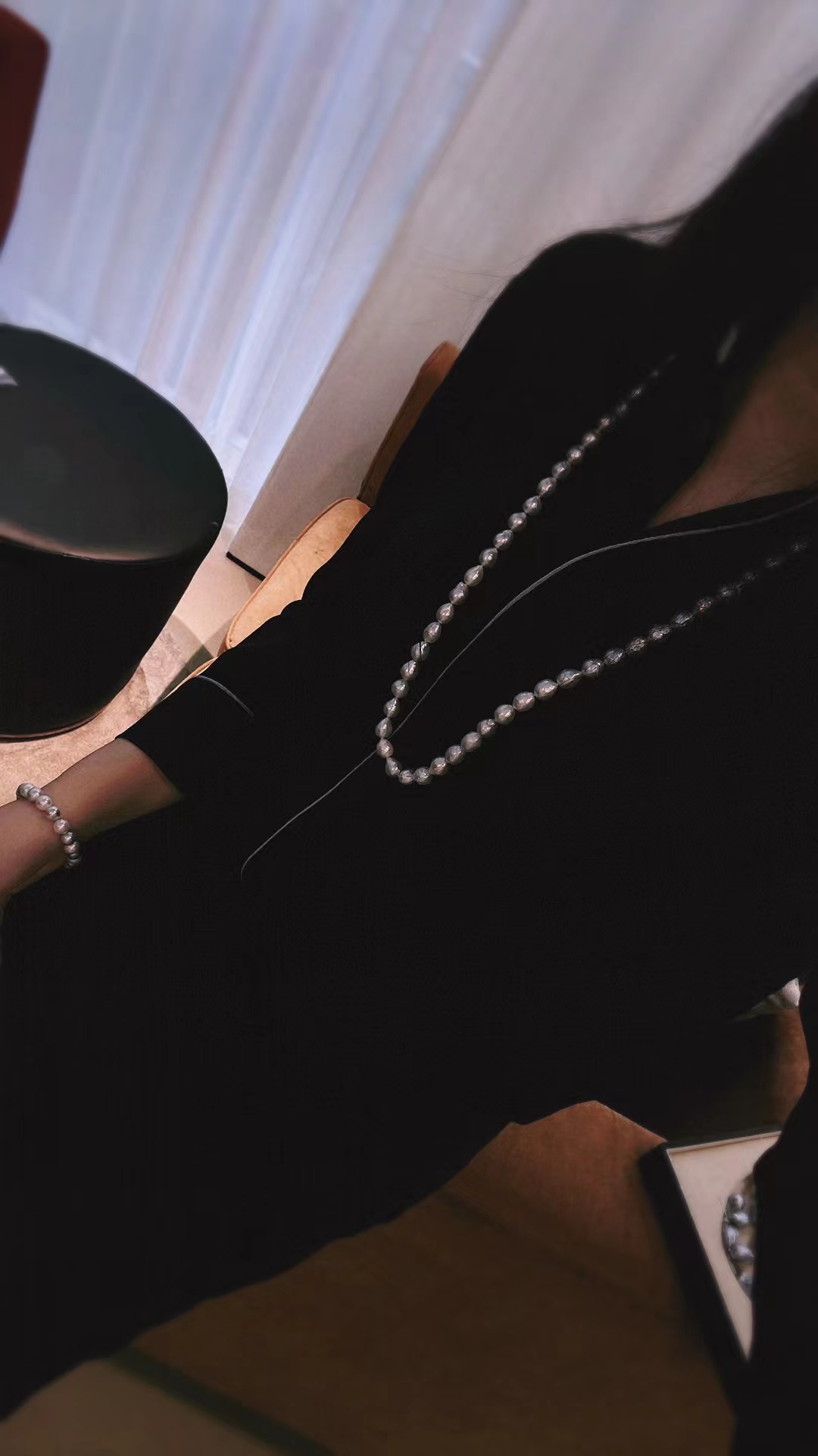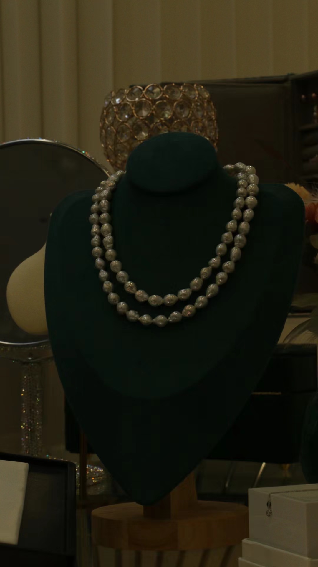 珠子尺寸是8-10mm,皱皮巴洛克很亮,尺寸蛮有存在感的,但是因为巴洛克关系,看过去很有松弛感,不压人。与此同时,这个巴洛克品质不错的,一颗一颗排列精致,很不错,垂感很好。