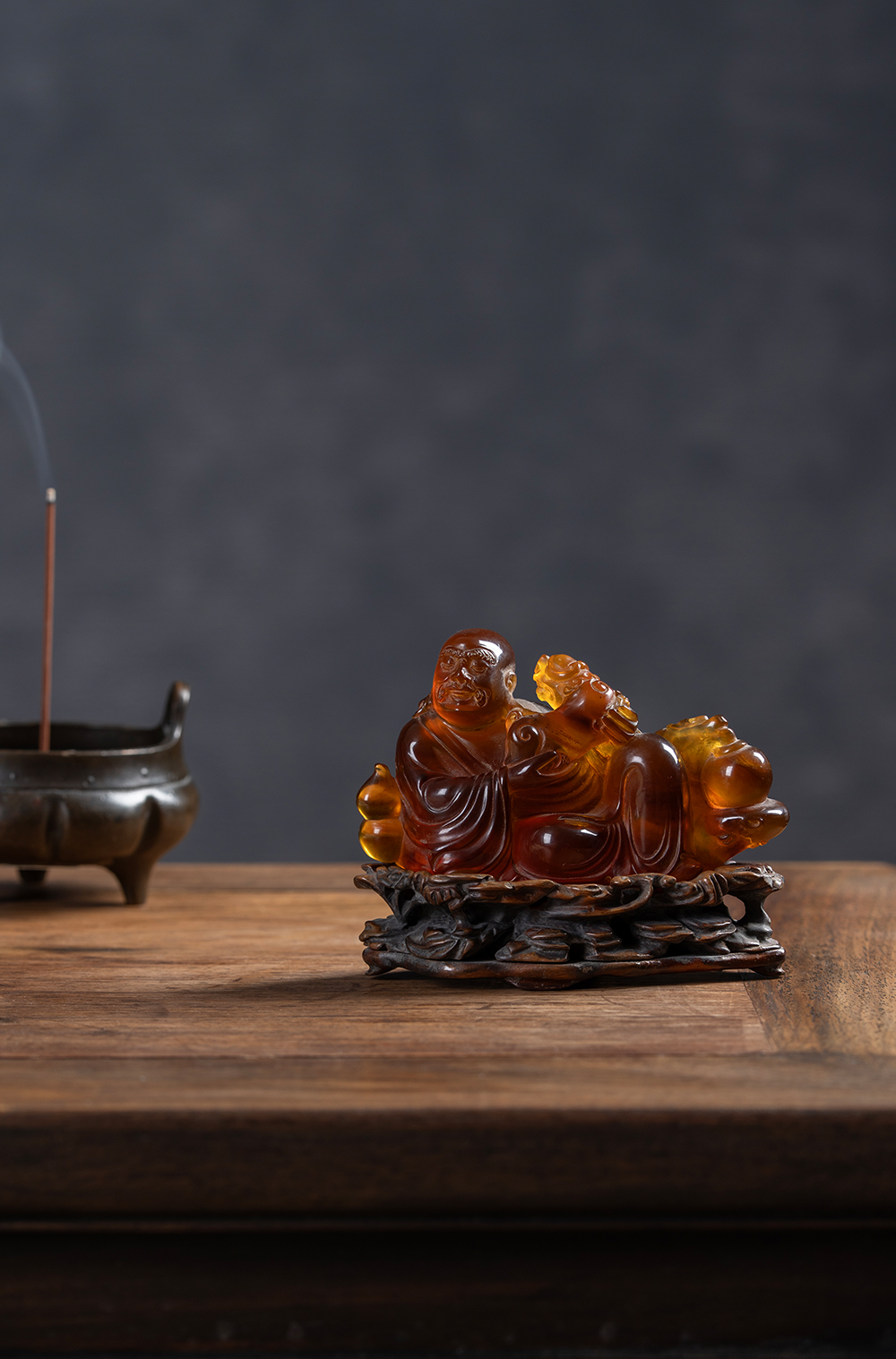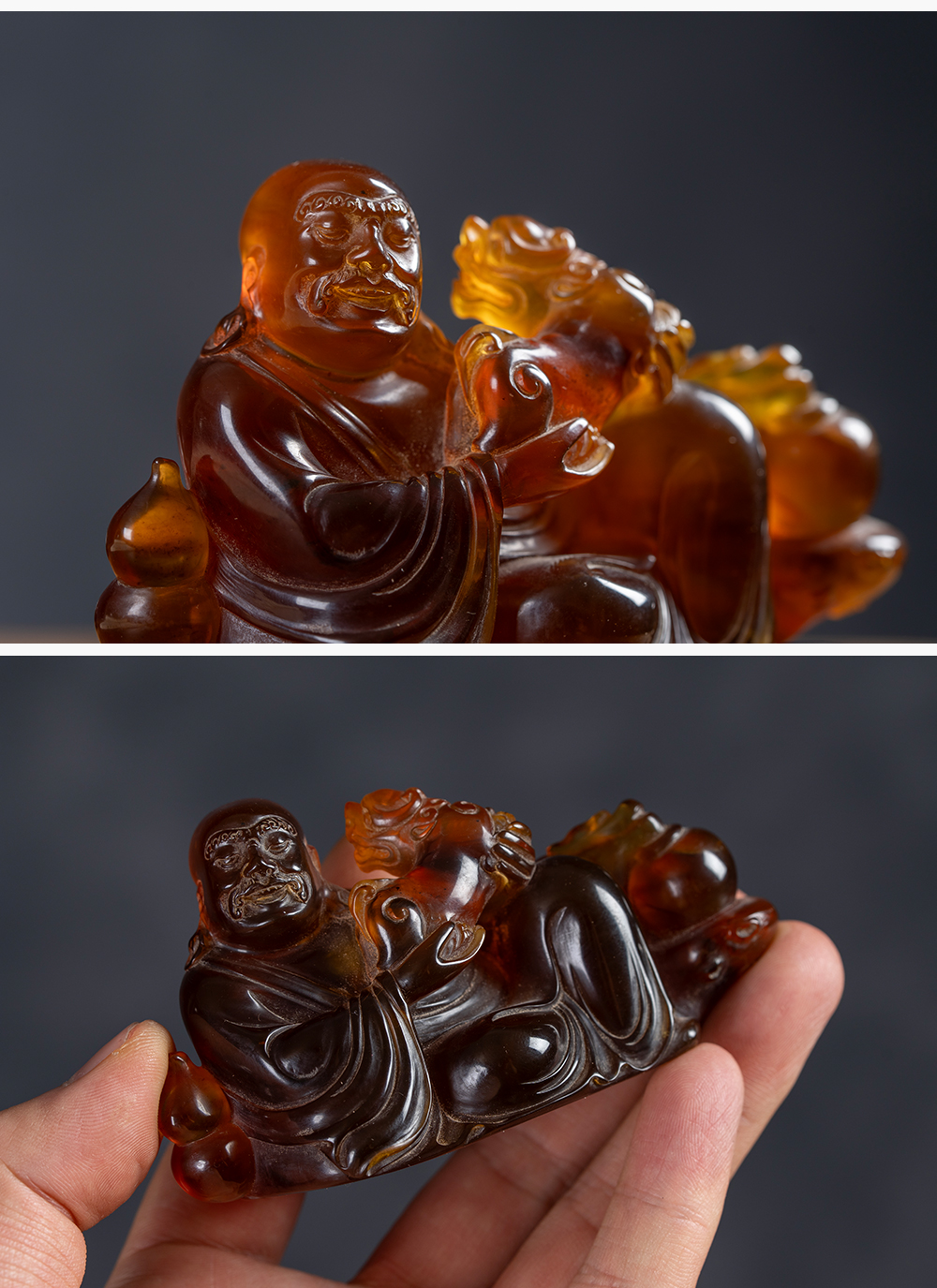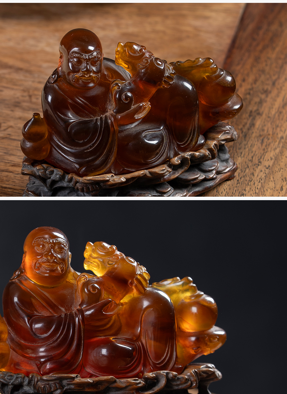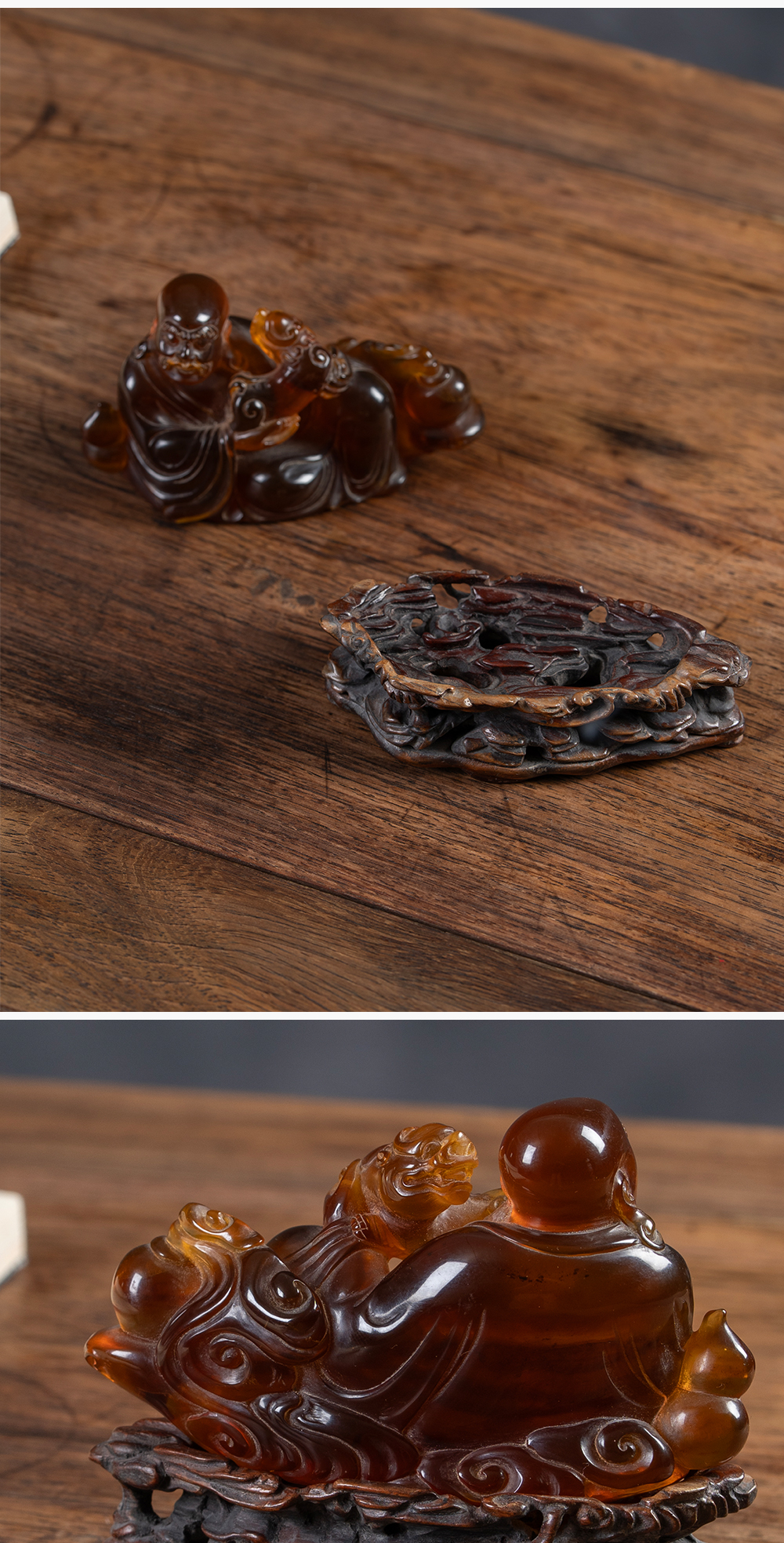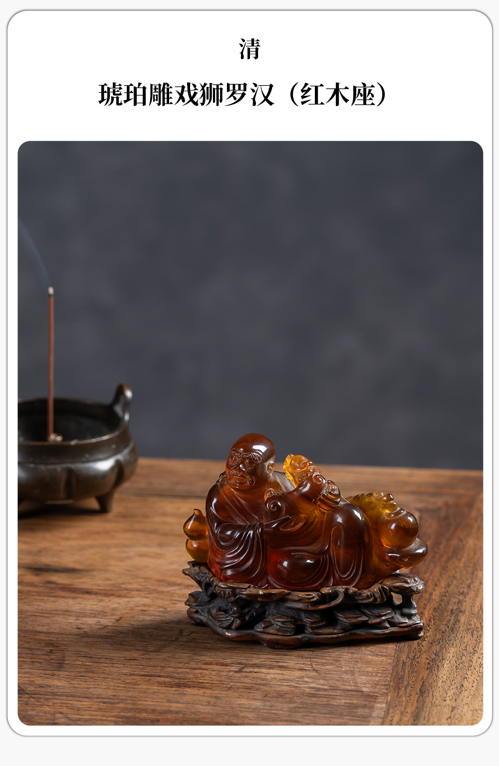 清 琥珀雕戏狮罗汉(红木座)