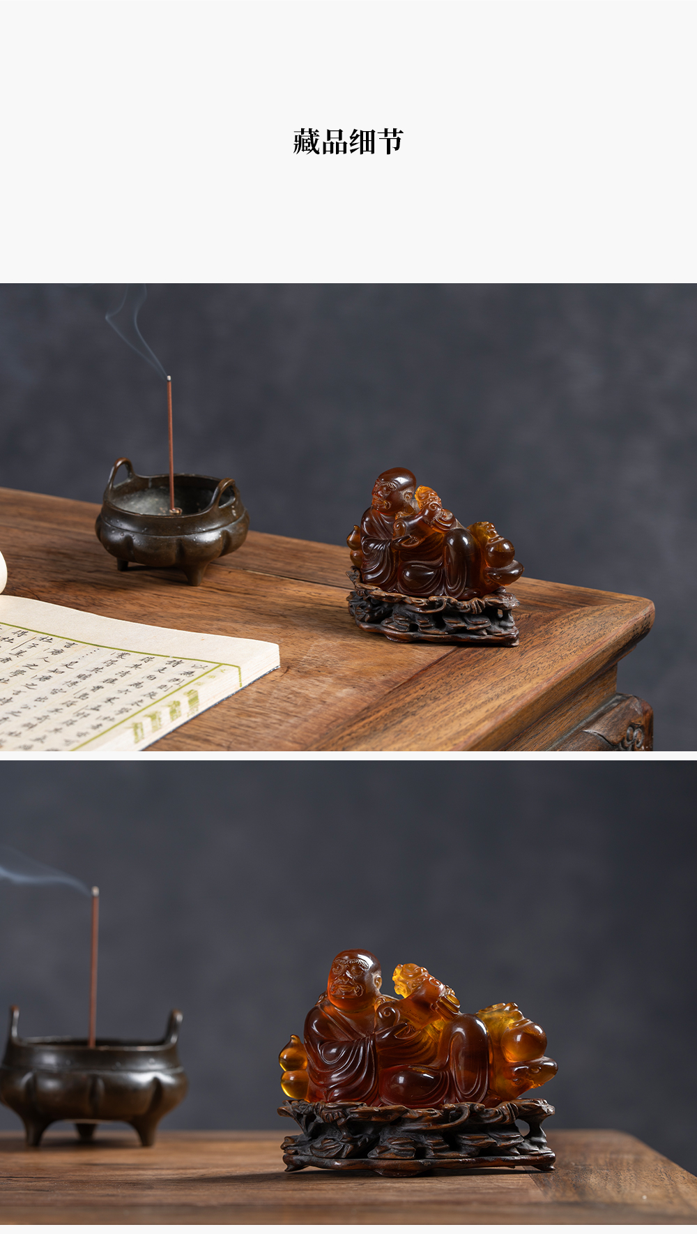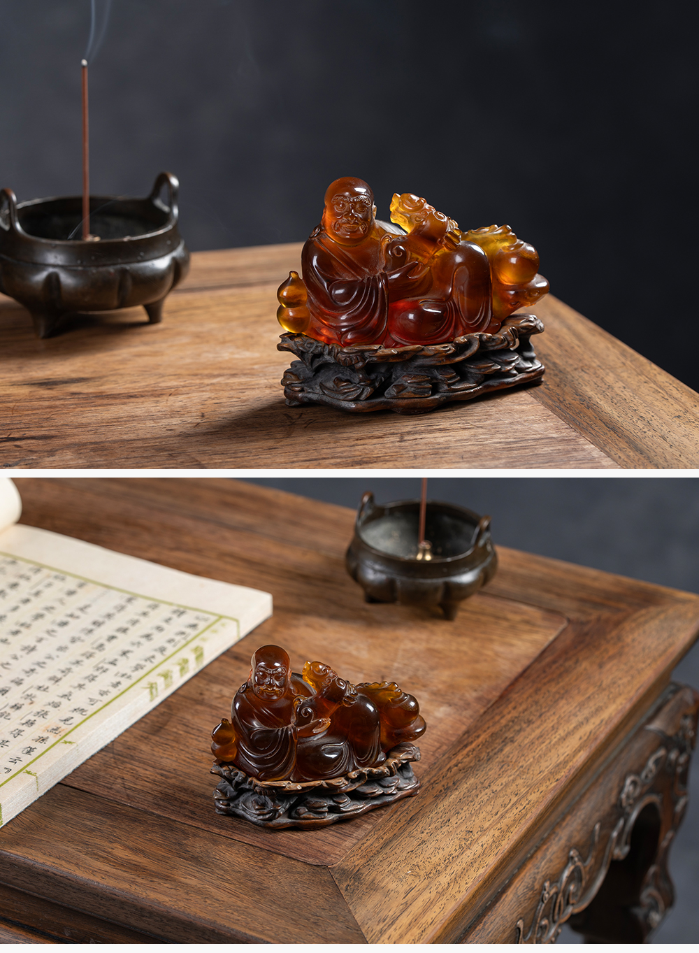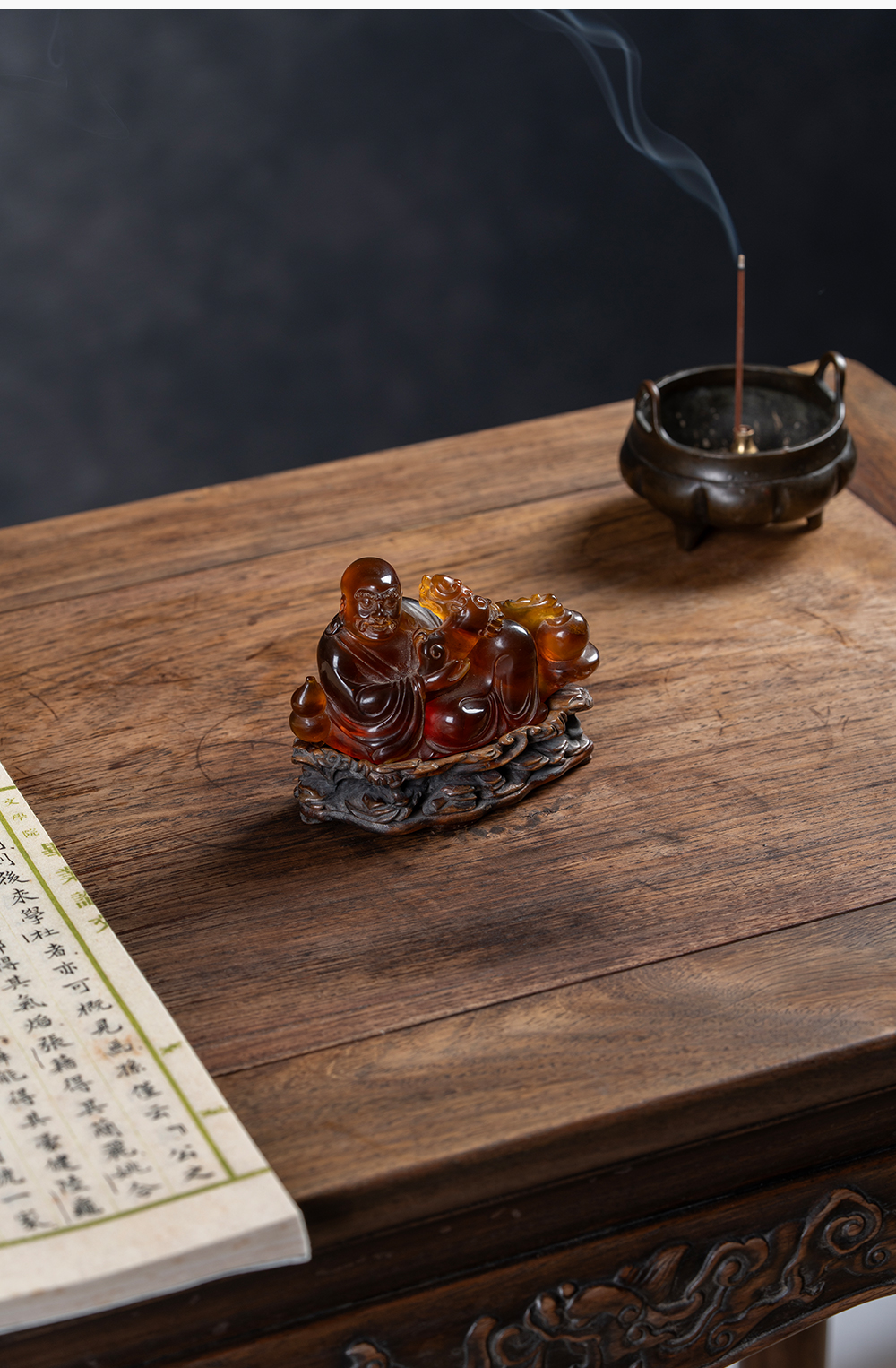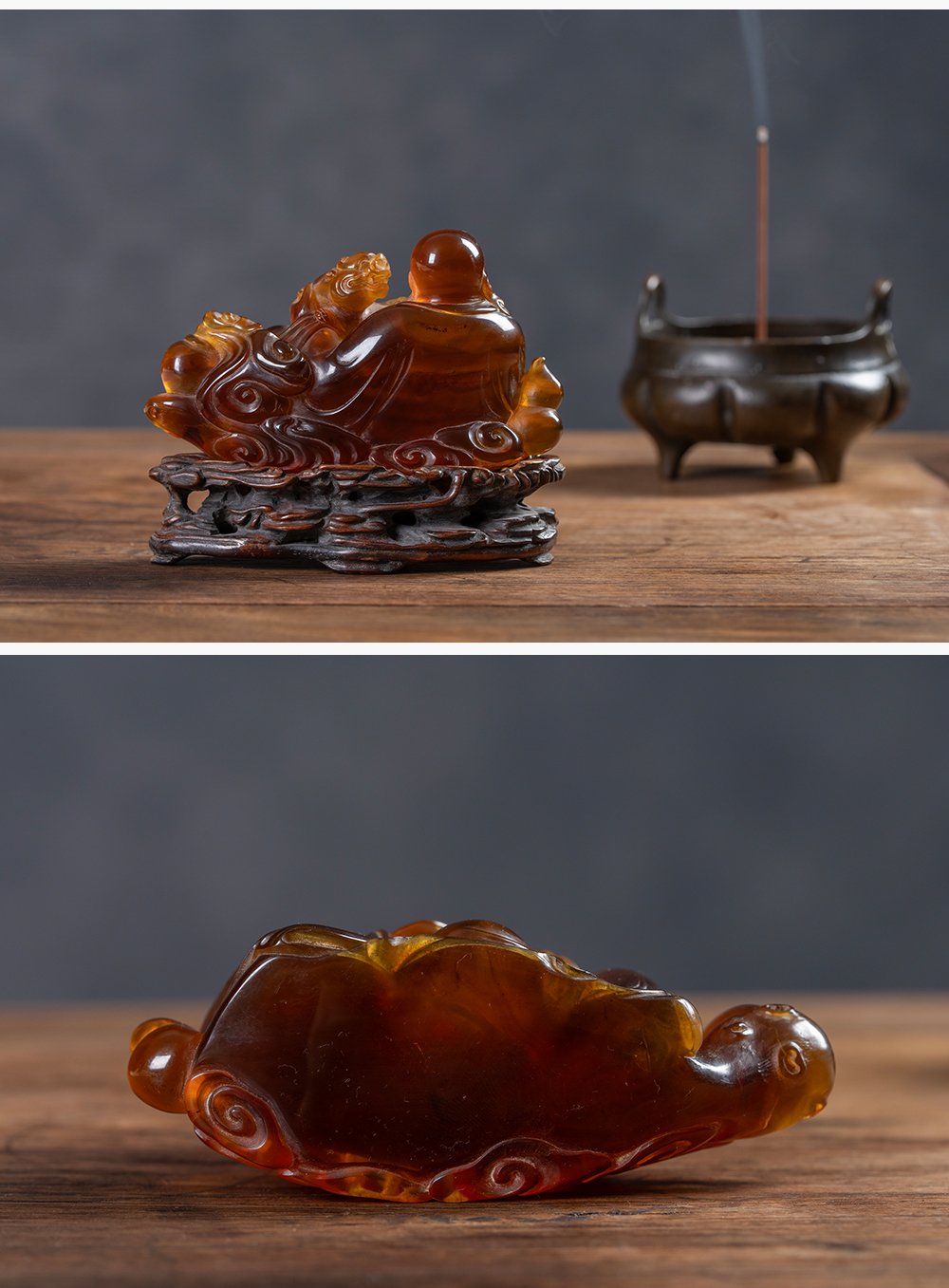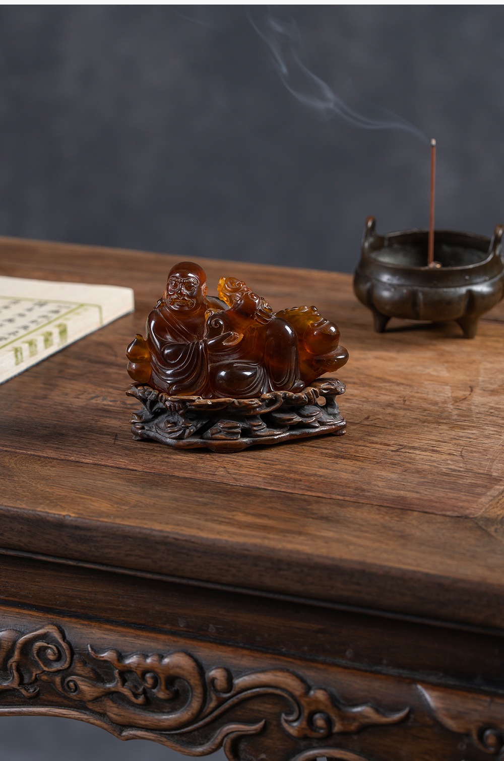 清 琥珀雕戏狮罗汉(红木座)