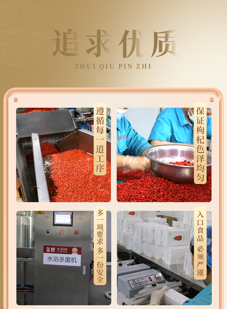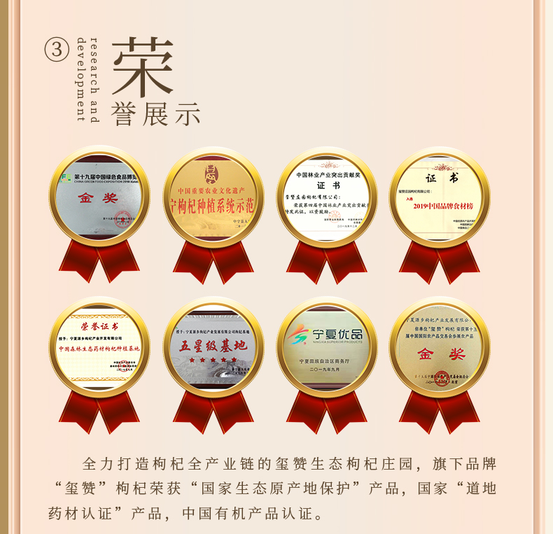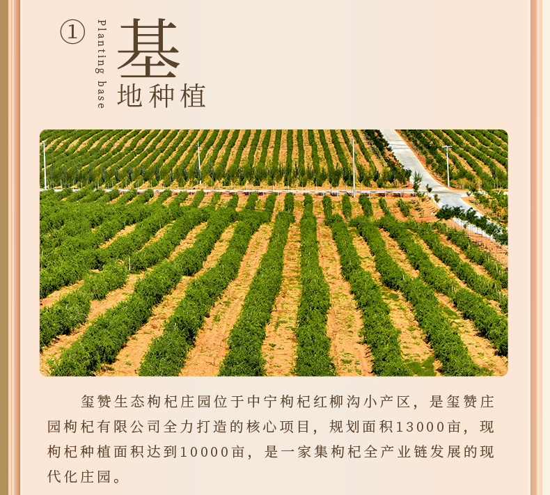 - 玺赞公司位于中国枸杞之乡—宁夏中宁县。在中宁枸杞红柳沟小产区建高标准枸杞种植基地一万三千亩—玺赞生态枸杞庄园,实现了研发、种植、加工、营销、文旅、生态“六位一体”的现代枸杞全产业链企业,本店是玺赞微店