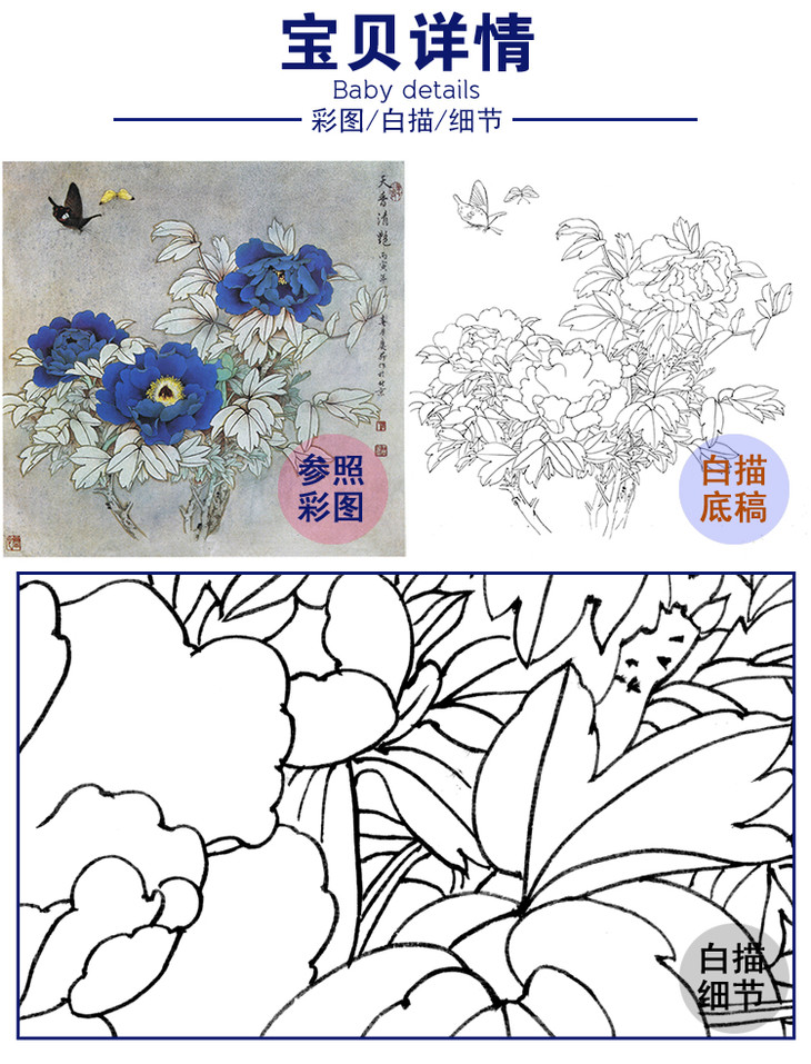 工笔花鸟白描底稿-王庆升-牡丹蝴蝶《天香清艳》-斗方小品册页-多种白描尺寸可选-A383