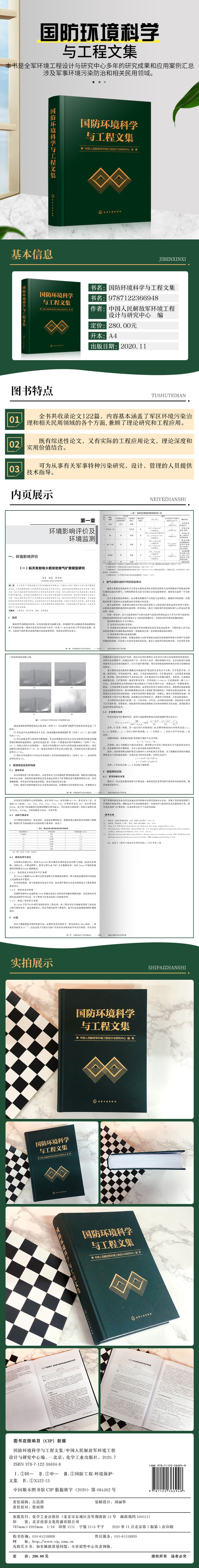 本书汇集了中国人民解放军原总装备部工程设计研究总院环保中心多年来的研究成果。按照文章类型分为七章。排名靠前章是环境影响评价及环境监测;第二章是生态研究与环境规划;第三章是景观水处理技术及工程应用;第四章是生活污水处理技术及工程应用,包括综合论述、技术研究、工程应用和分析与探索四个方面的内容;第五章是特种污染治理技术及应用,包括水污染治理技术、气体污染治理技术和电磁污染防护技术三个方面的内容;第六章是事故应急处置及安全防护;第七章是其他,包括综合论述、数值模拟研究和给水处理技术研究三个方面的内容。附录是出版书目,包括编写的十一部著作的基本情况和目录。 本书内容基本涵盖了军区环境污染治理的各个方面,兼顾了理论研究和工程应用,既具有一定的理论深度,又具有很好的实用价值。可为从事有关军事特种污染的研究、设计、管理人员提供技术指导,也可供大学相关专业的教师和学生参考。