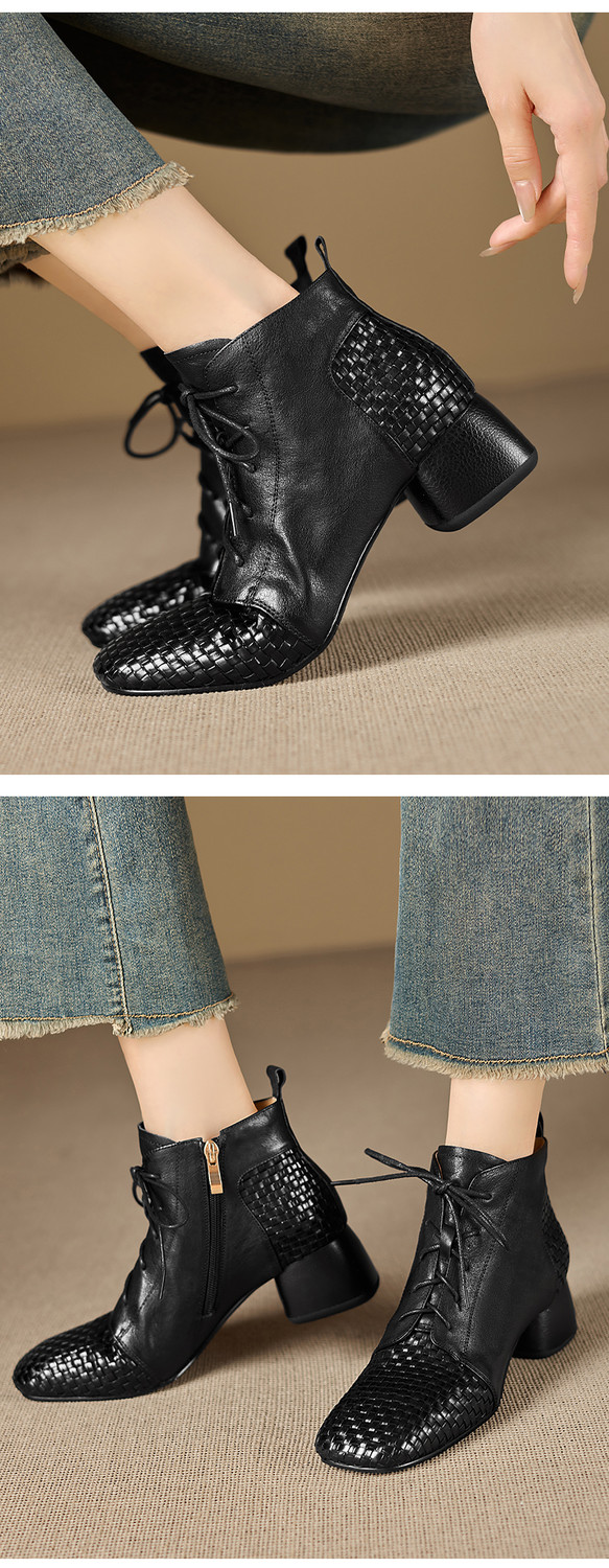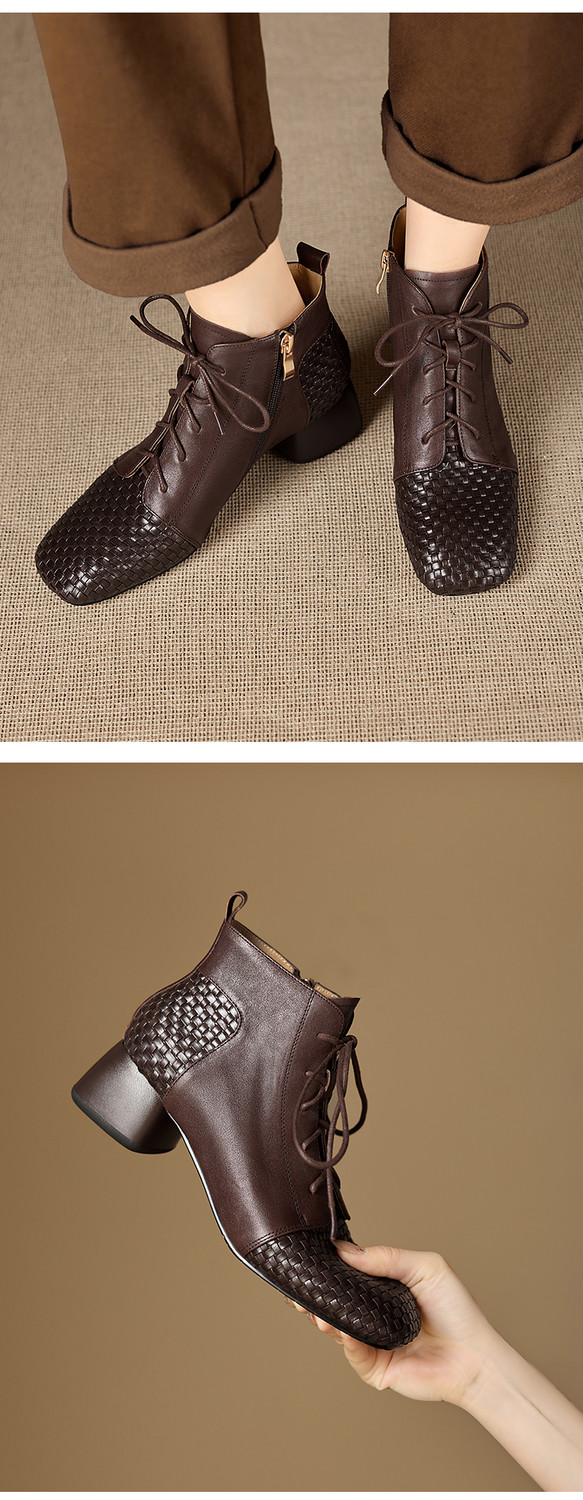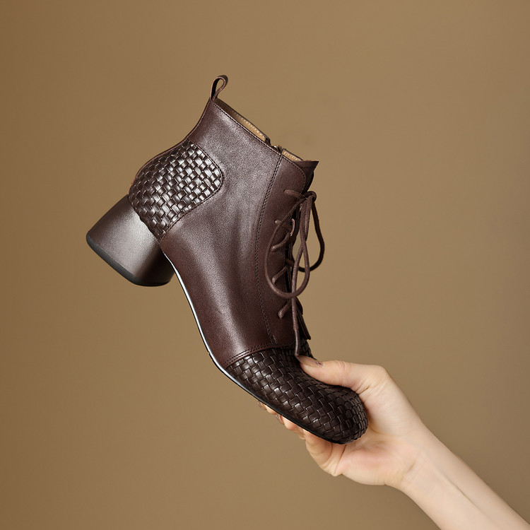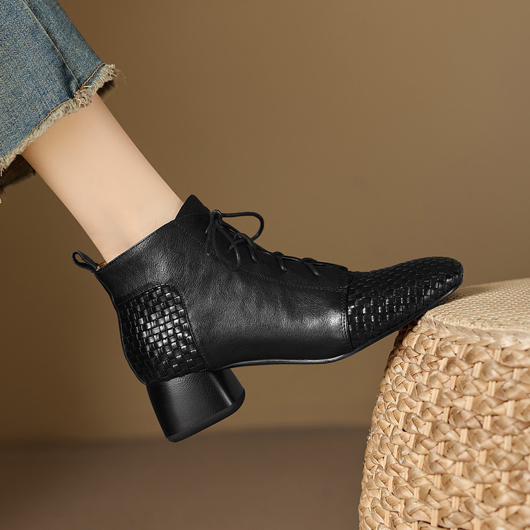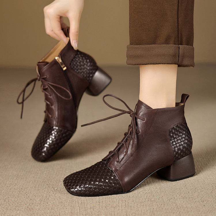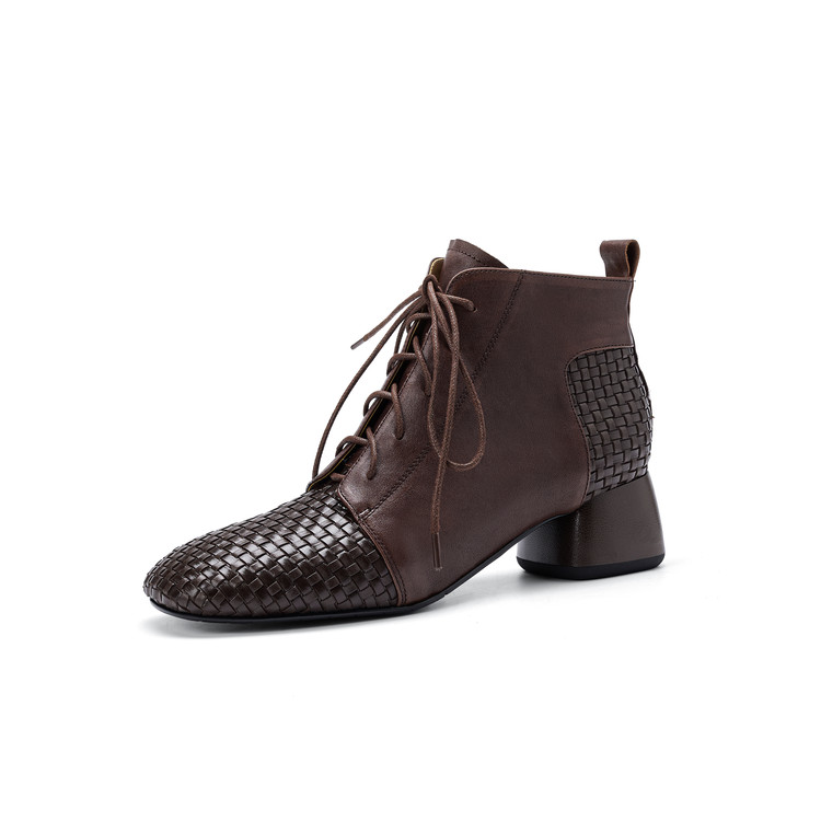【预售5天】英伦风编织时尚高跟短靴女秋冬真皮圆头系带马丁靴气质显瘦及裸靴MBJR&5630
