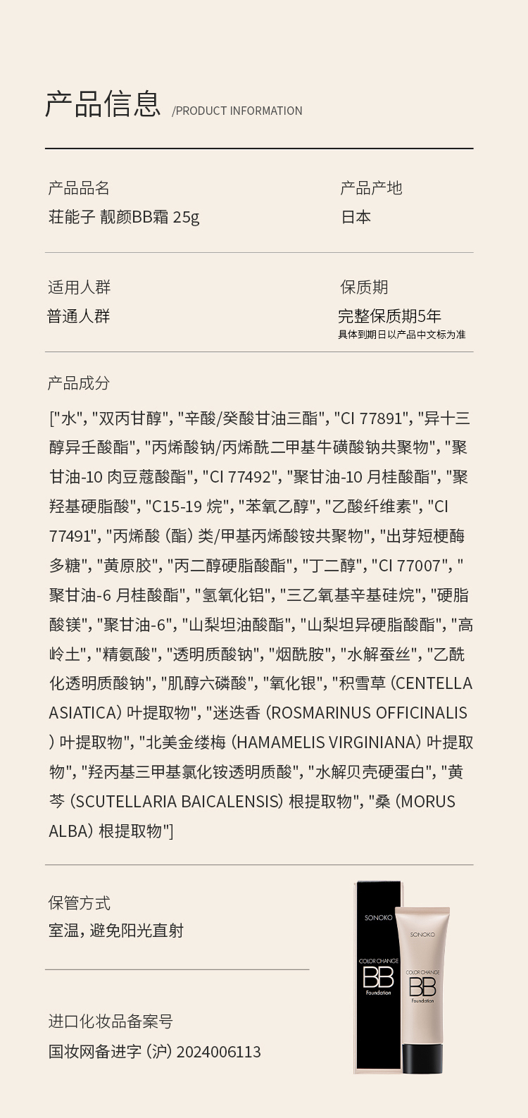 SONOKO 荘能子 靓颜BB霜 25g 日本进口 肌肤感温变色适配胶囊技术