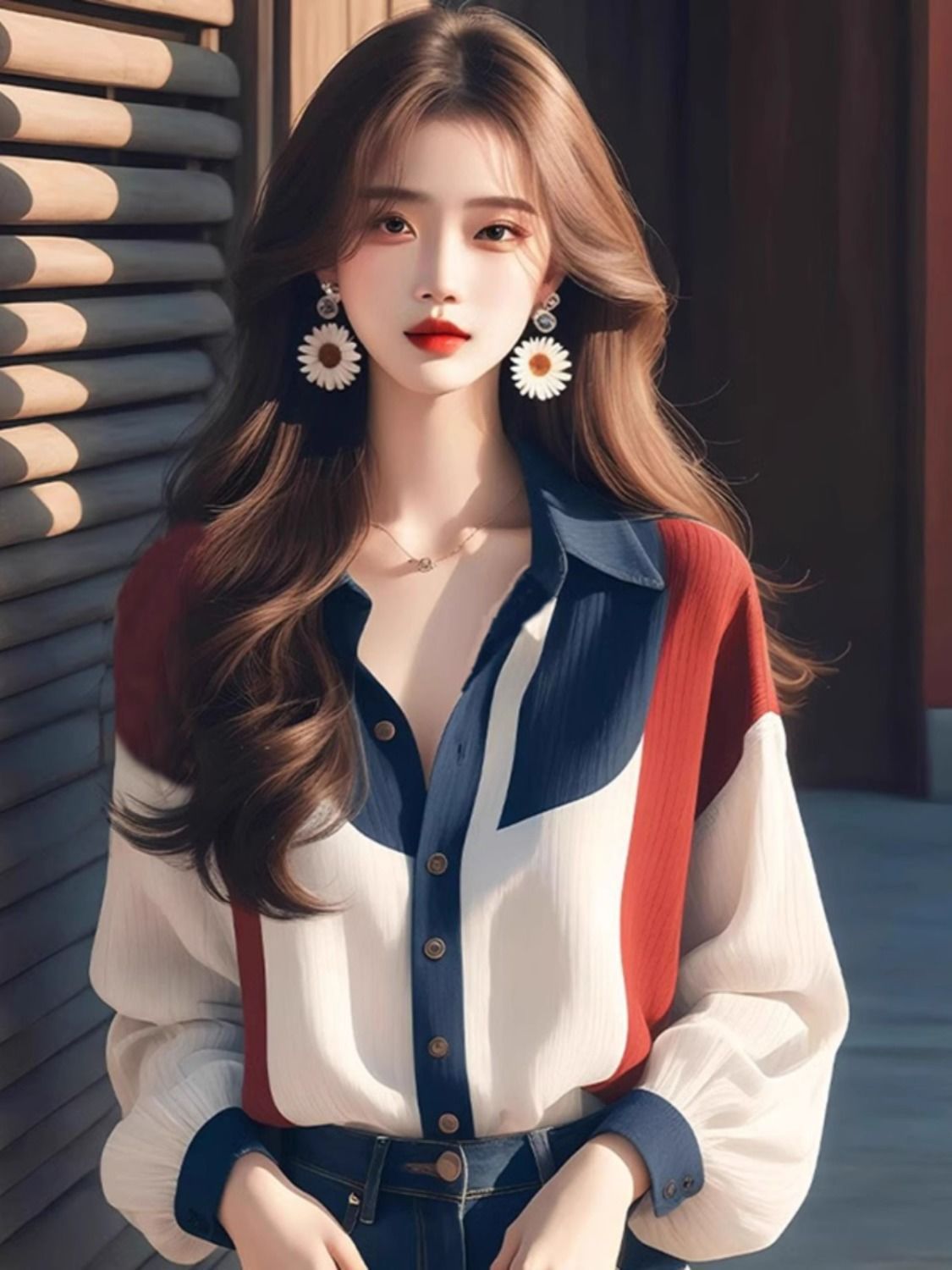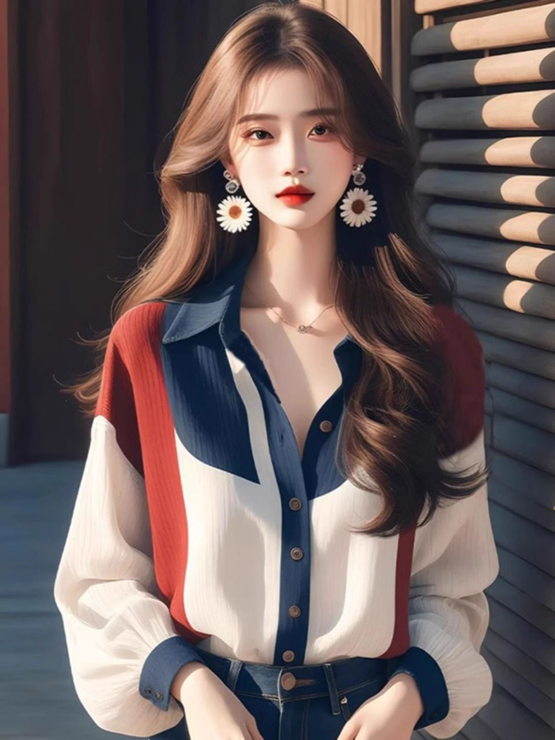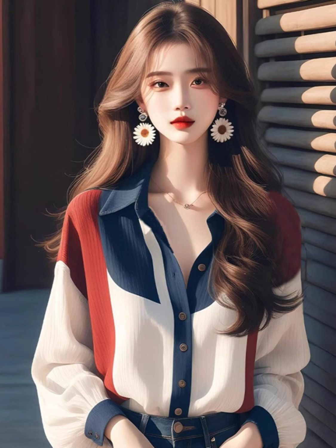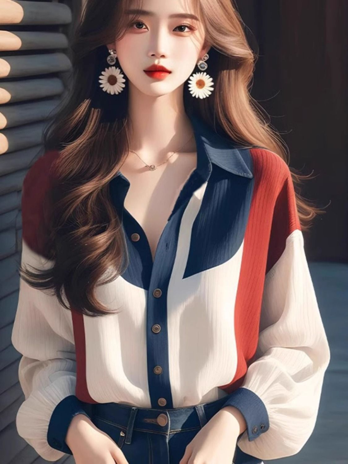丁摩新款女装高级感独特超好看宽松上衣撞色灯笼袖衬衫5ZF-9448