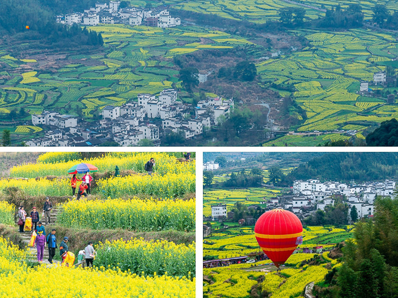 古樟号称“天下第一樟”,需要10个人环绕才能抱住。这颗古樟虽显得沧桑,但树冠枝繁叶茂,一直被当地人视为“树神”。青砖黛瓦的徽派建筑错落有致,与古樟相互映衬,仿佛在诉说着古老的故事。蓝天白云下,小火车缓缓行驶,悠悠穿越那一大片油菜花, 就像走进了童话世界,拍照打卡绝绝子