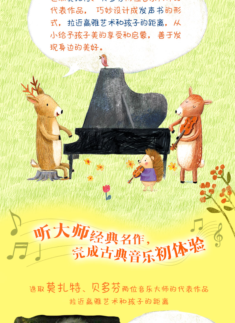 1.英国优秀童书品牌尤斯伯恩出版公司编著;2.发声书形式,拉近高雅艺术和孩子的距离,从小给予孩子美的享受和启蒙,善于发现身边的美好。3.两位古典音乐代表大师力作,熏陶孩子的情操。4.与英文原版书同厂同质印刷,产品质量有保障。采用可食用油墨印制,孩子误食无害;圆角设计,安全有保障。