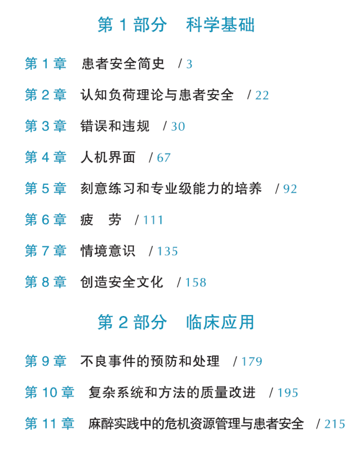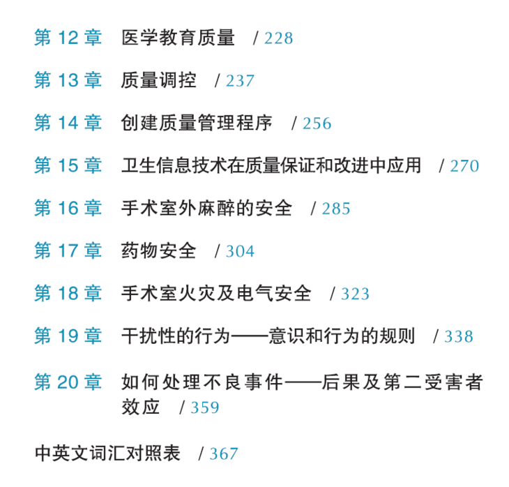 麻醉医生是最早认识到团队培训、安全文化和质量管理是临床工作中必不可少组成部分的一批人,《围术期麻醉医质量与安全》一书便对这部分内容进行扩充。本书的各个章节对可用于社区实践或大型学术医学中心的策略进行强调。第一部分提供了人为因素学的科学基础总览。第二部分为相关组织提供可行的建议,以提高围术期医疗质量与患者安全,并为越来越多手术室外的操作流程提供建议。