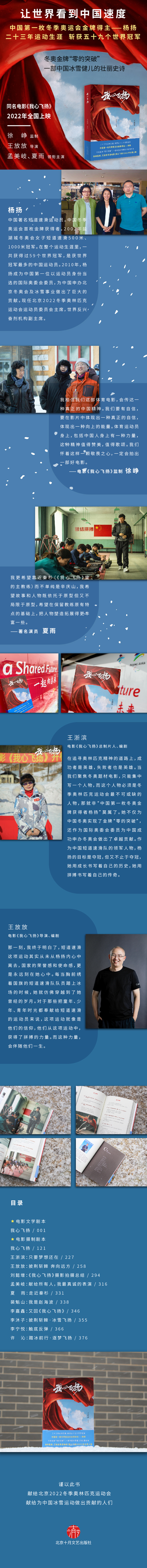 电影剧本、传记文学《我心飞扬》由著名作家王浙滨等创作完成,讲述了中国第一位冬季奥运会金牌获得者杨扬的成长故事。通过爱情、亲情、友情,她在奥林匹克道路上经历一次次炼狱、失败、重生,最终实现了中国冬奥零的突破,表现出奥林匹克精神的信仰、人性的光芒。作者王浙滨及主创团队多次对杨扬进行深度采访,深入实地考察短道速滑项目,创作完成作品。电影《我心飞扬》将于2022年大年初一上映。本书收录了电影文学剧本与摄制剧本、电影主创团队撰写的多篇手记。这是一部中国体育人为国争光的壮丽史诗。
