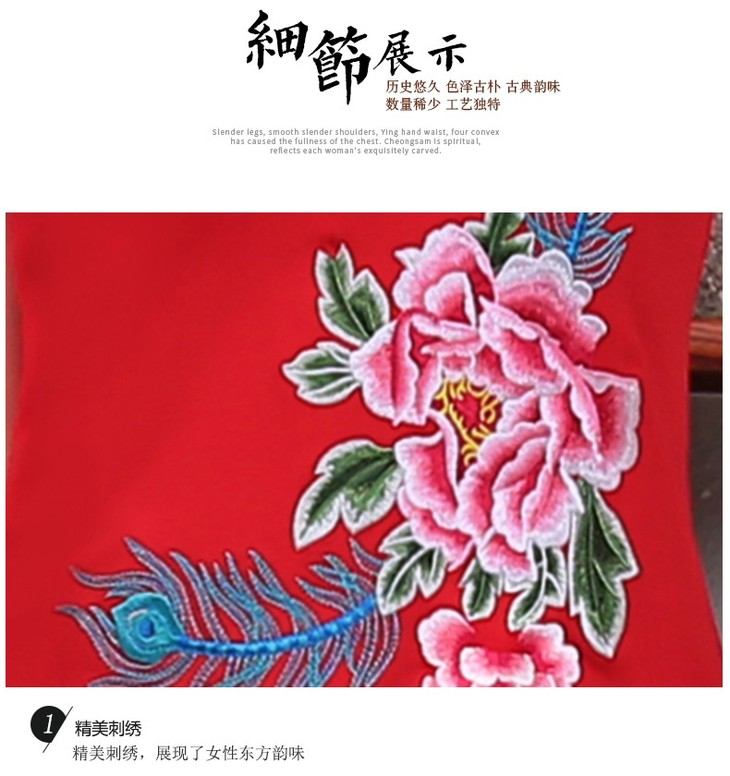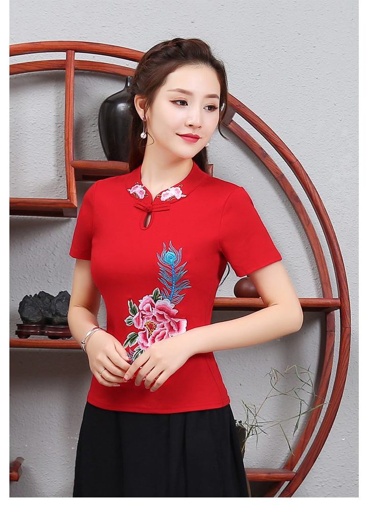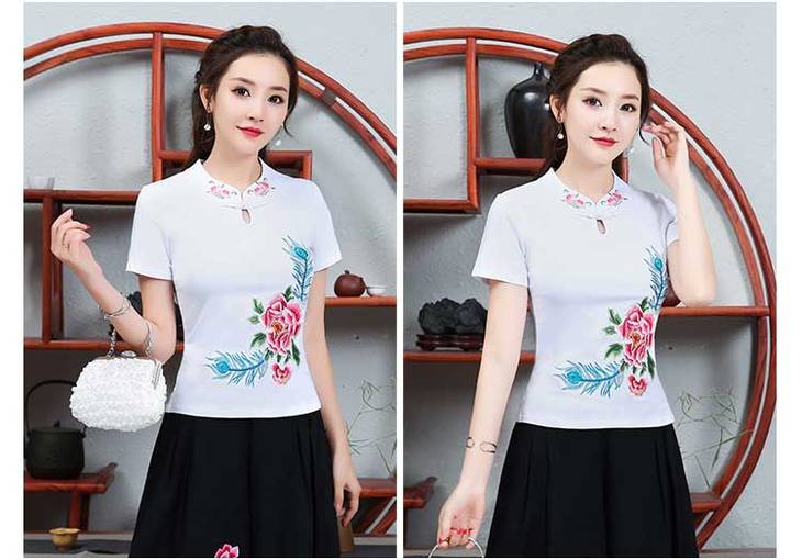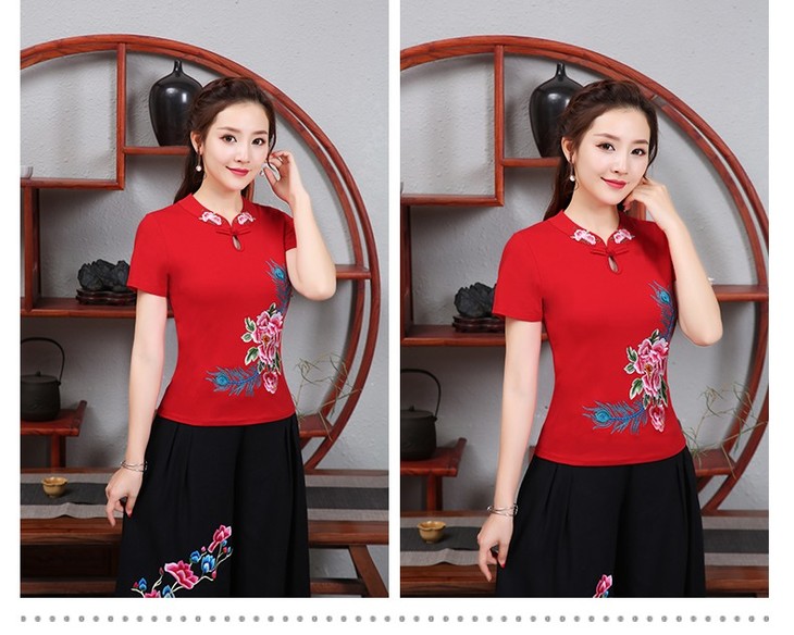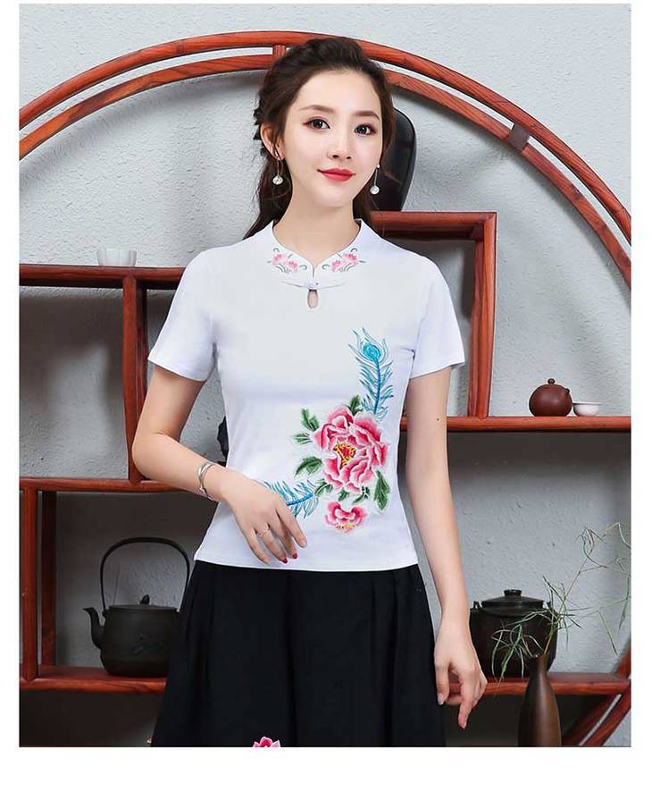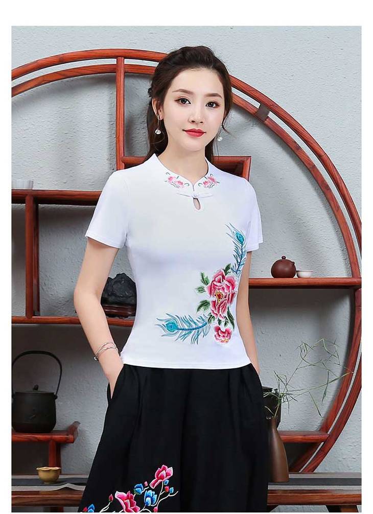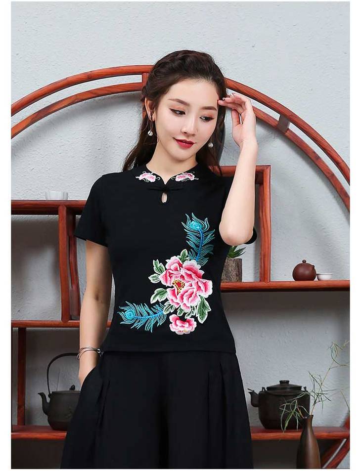 PDD-民族风刺绣上衣妈妈装 中式立领盘扣大码短袖棉t恤
