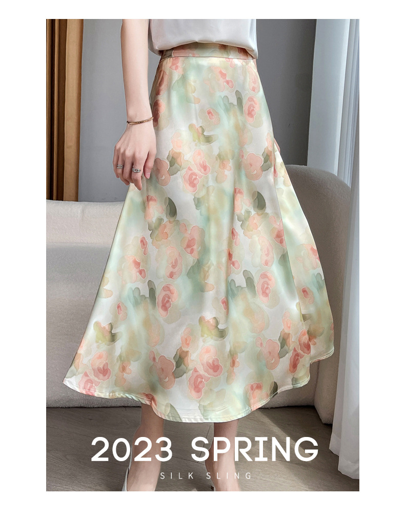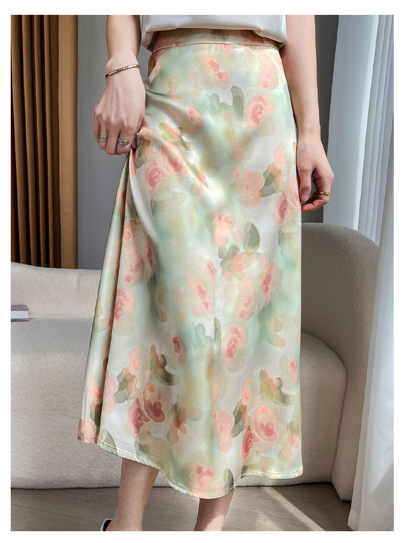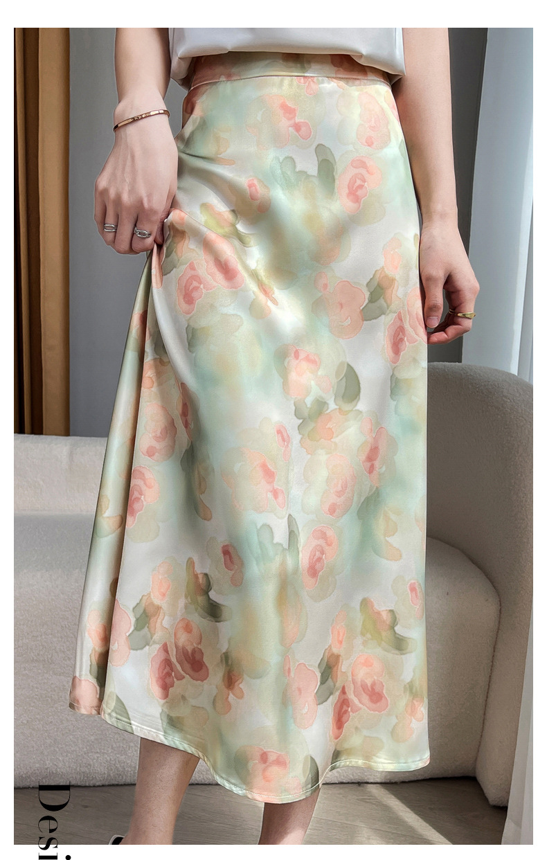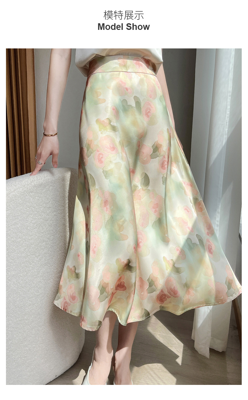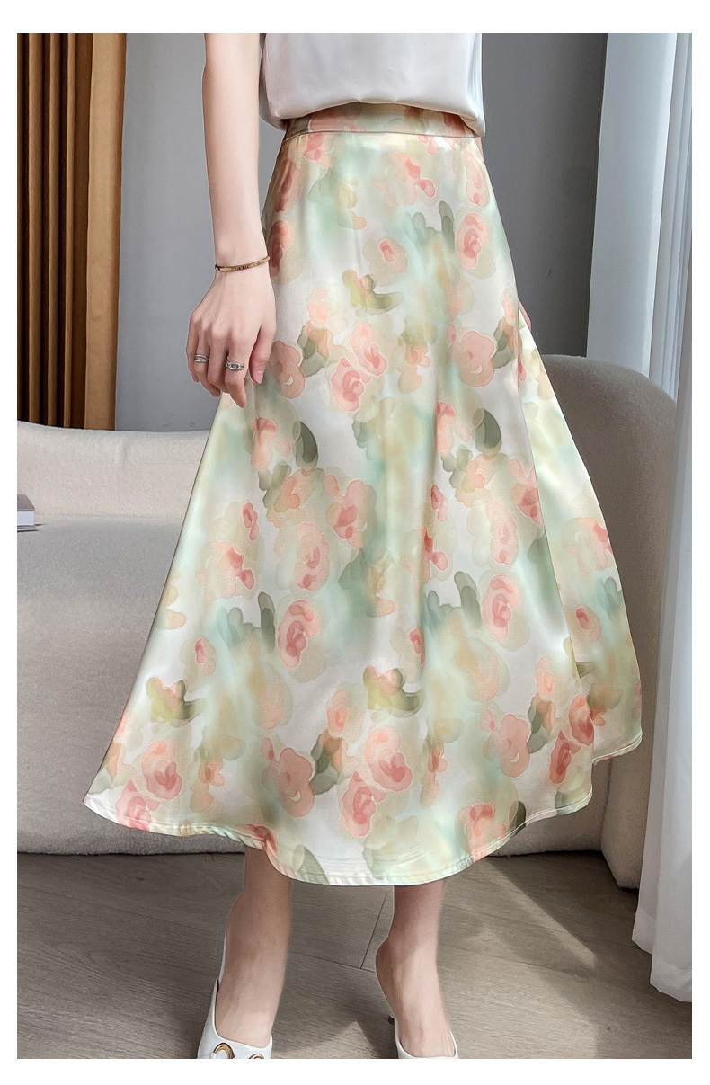 QHJY-JYA023216缎面印花长裙女 新款中腰显瘦醋酸时尚薄款碎花半身裙女