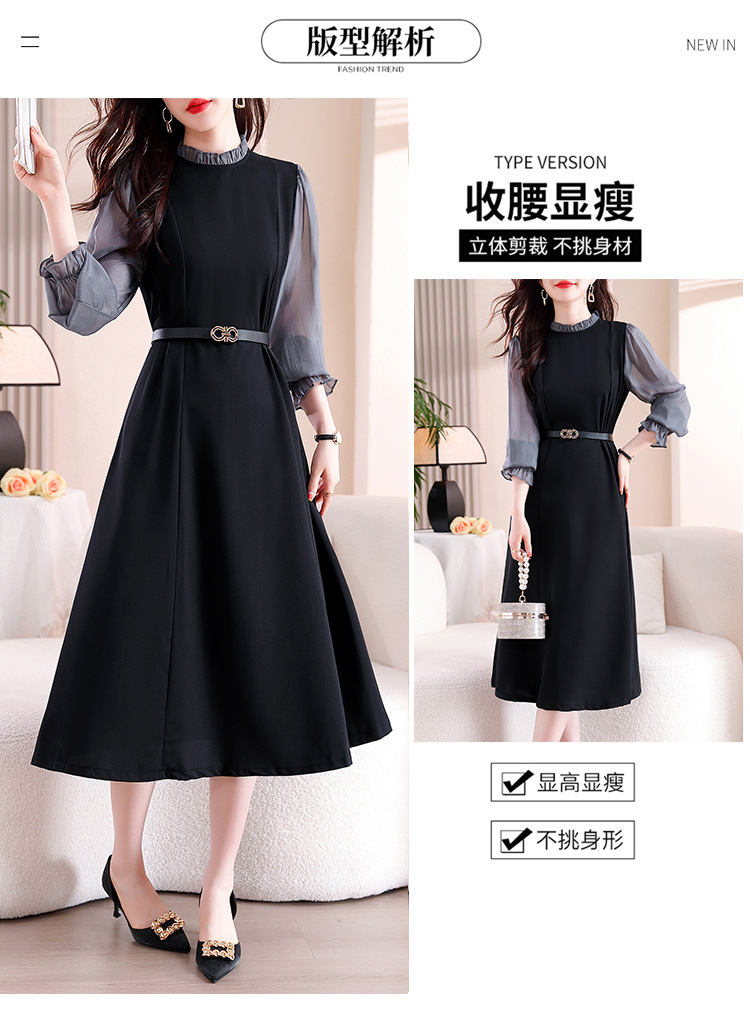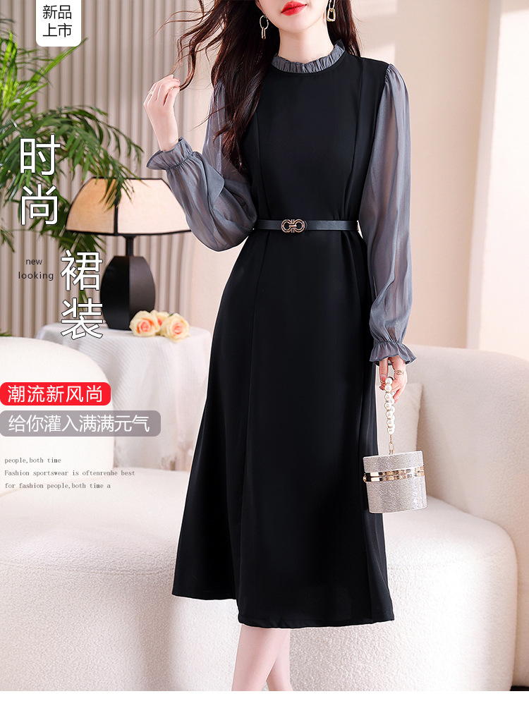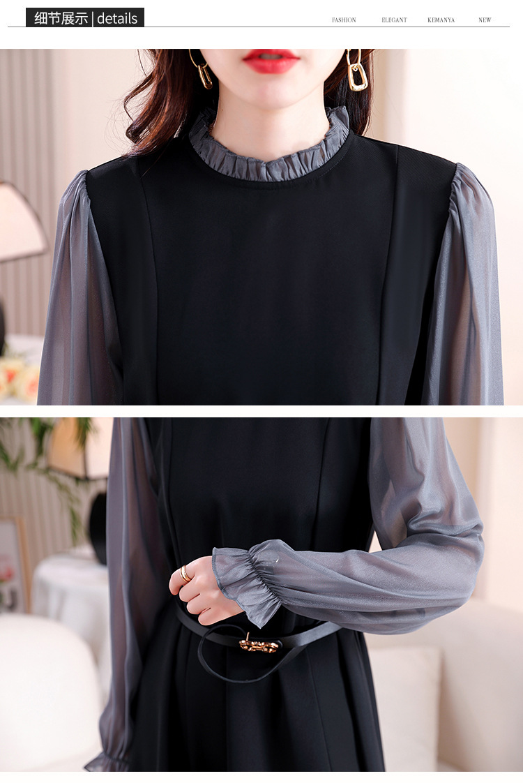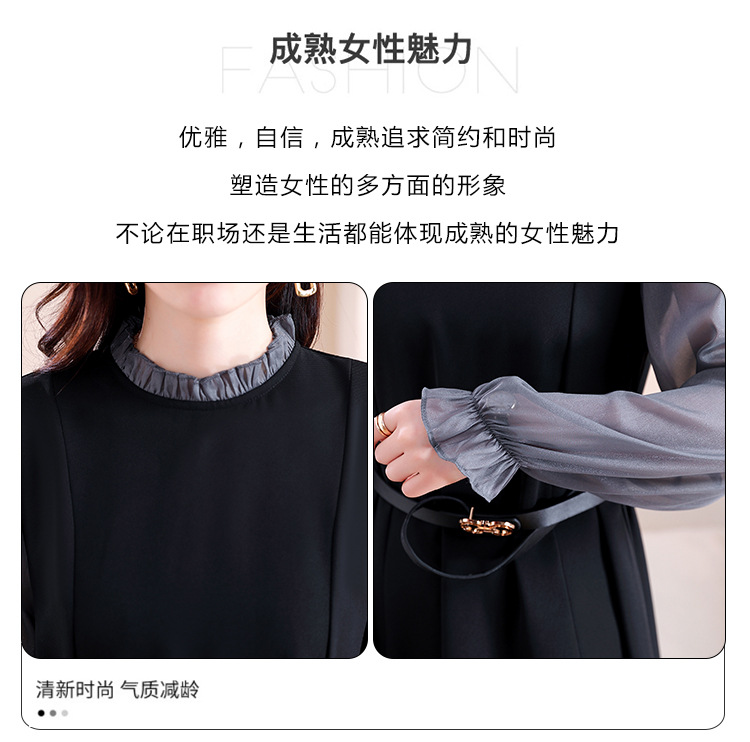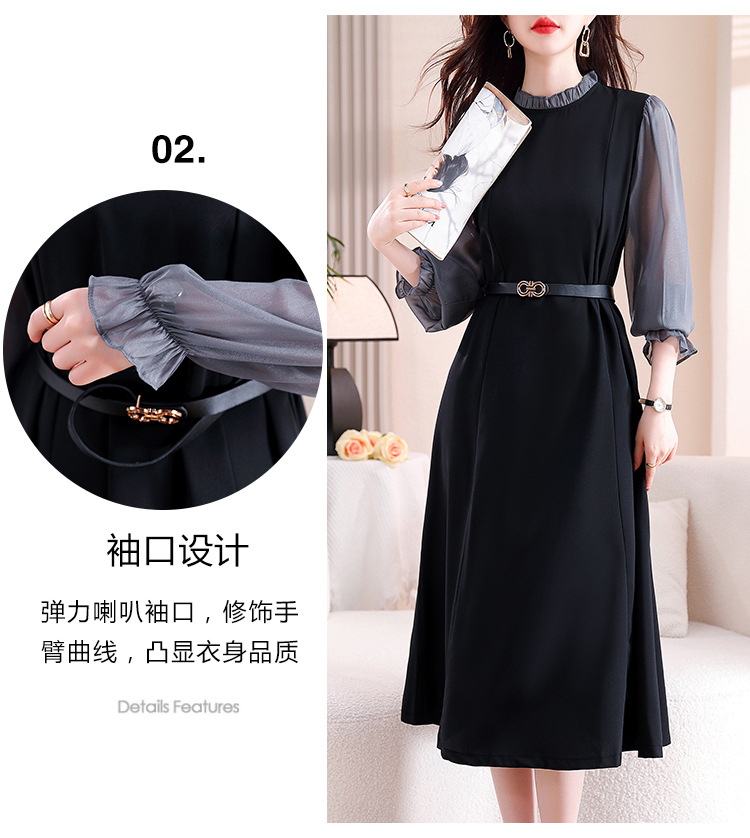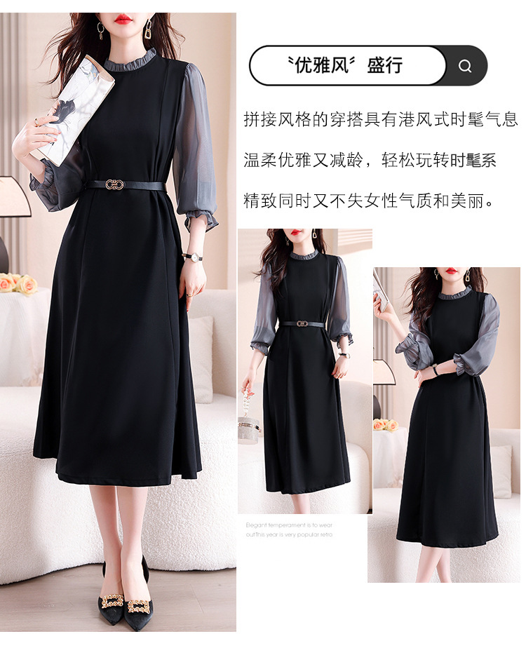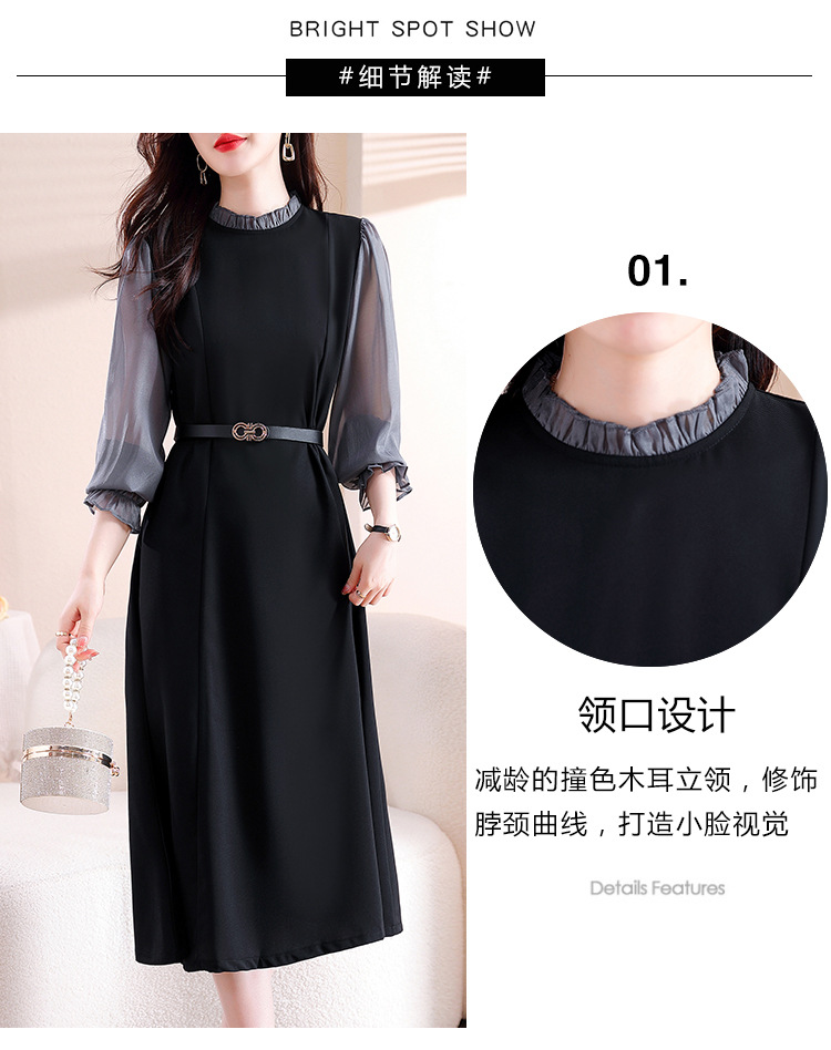 雀说撞色连衣裙新款时尚洋气圆领木耳乌青色拼接减龄中长裙AL9666