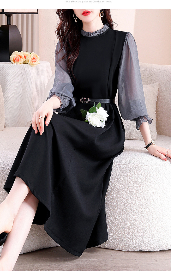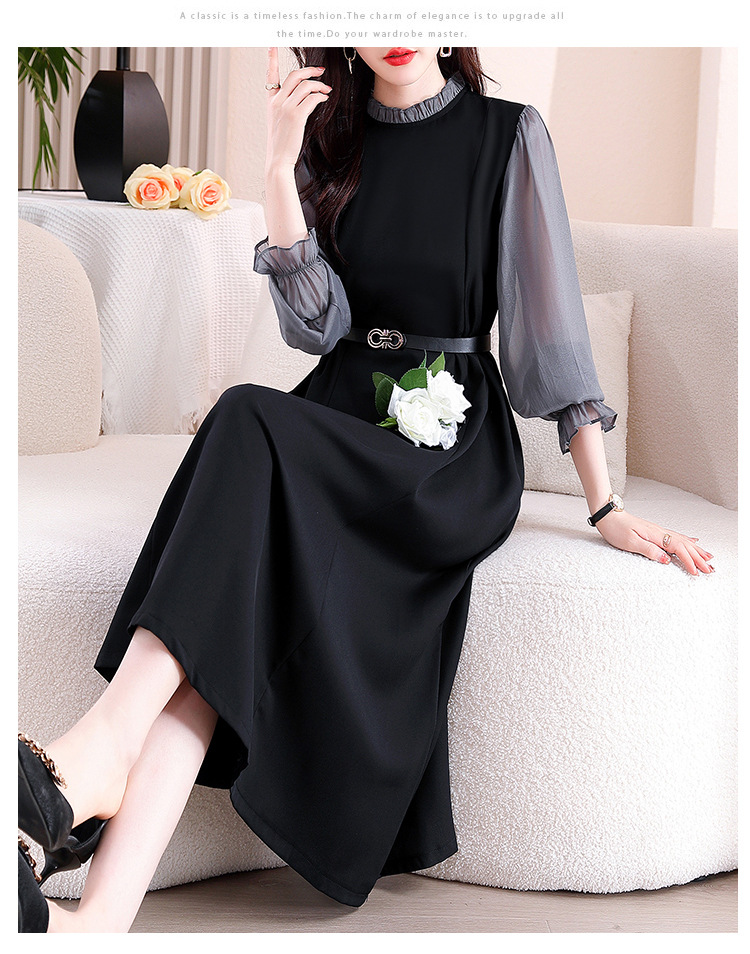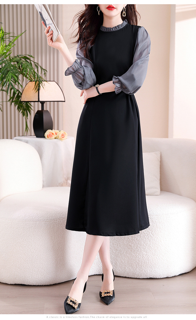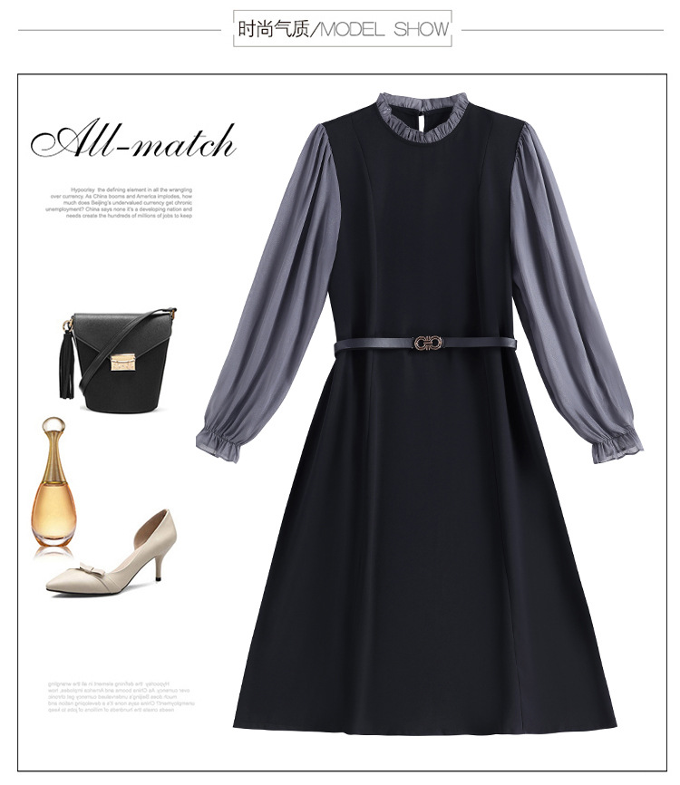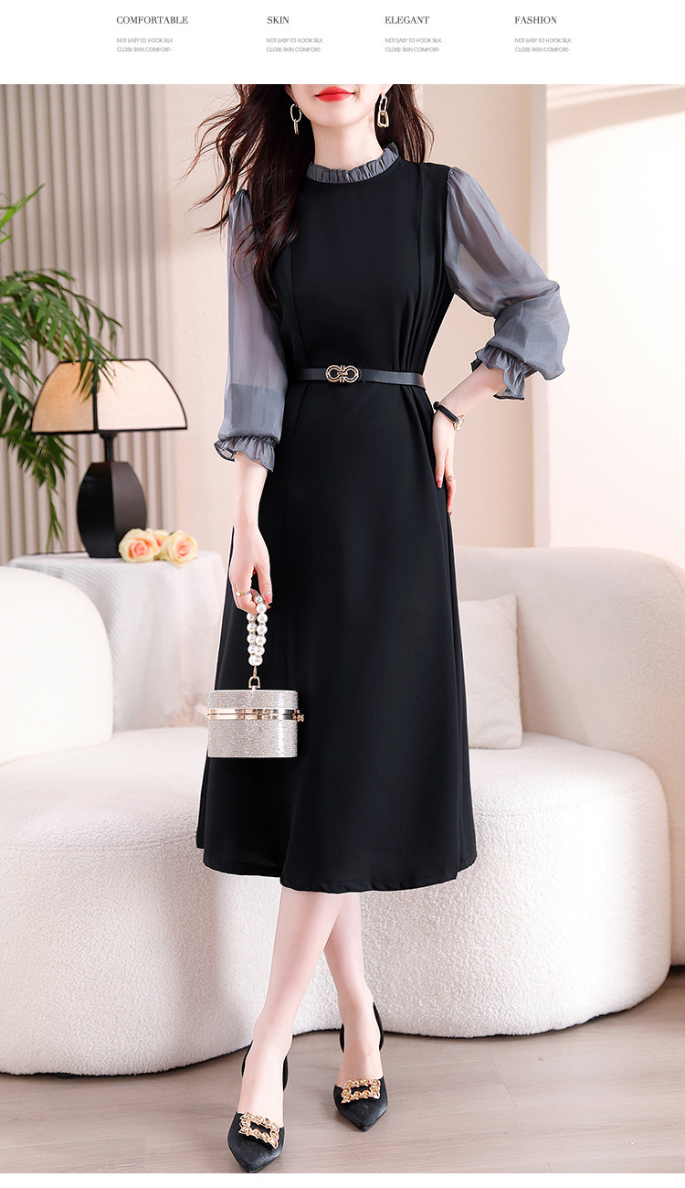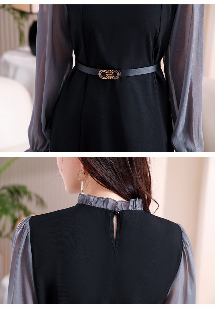 雀说撞色连衣裙新款时尚洋气圆领木耳乌青色拼接减龄中长裙AL9666