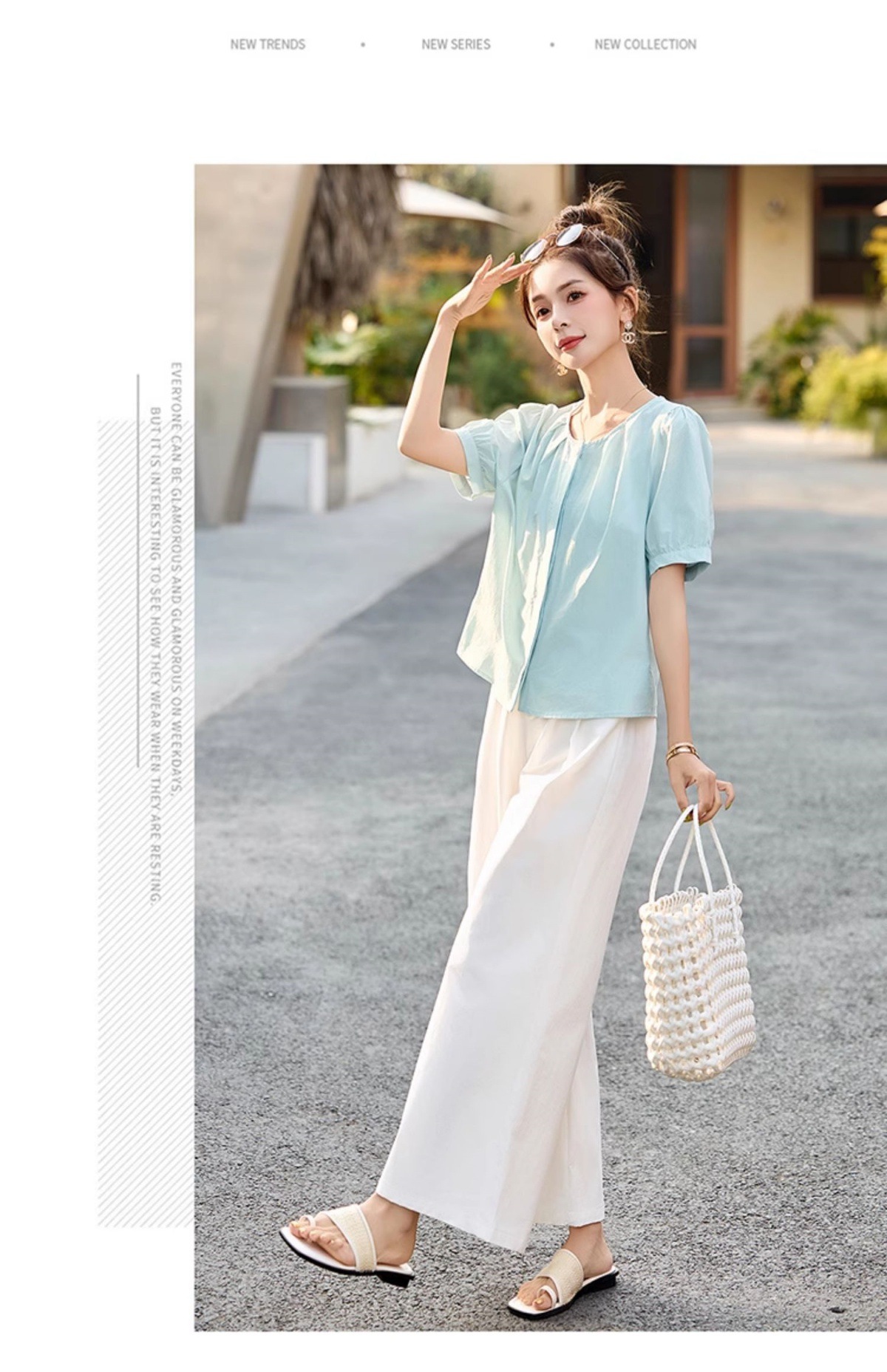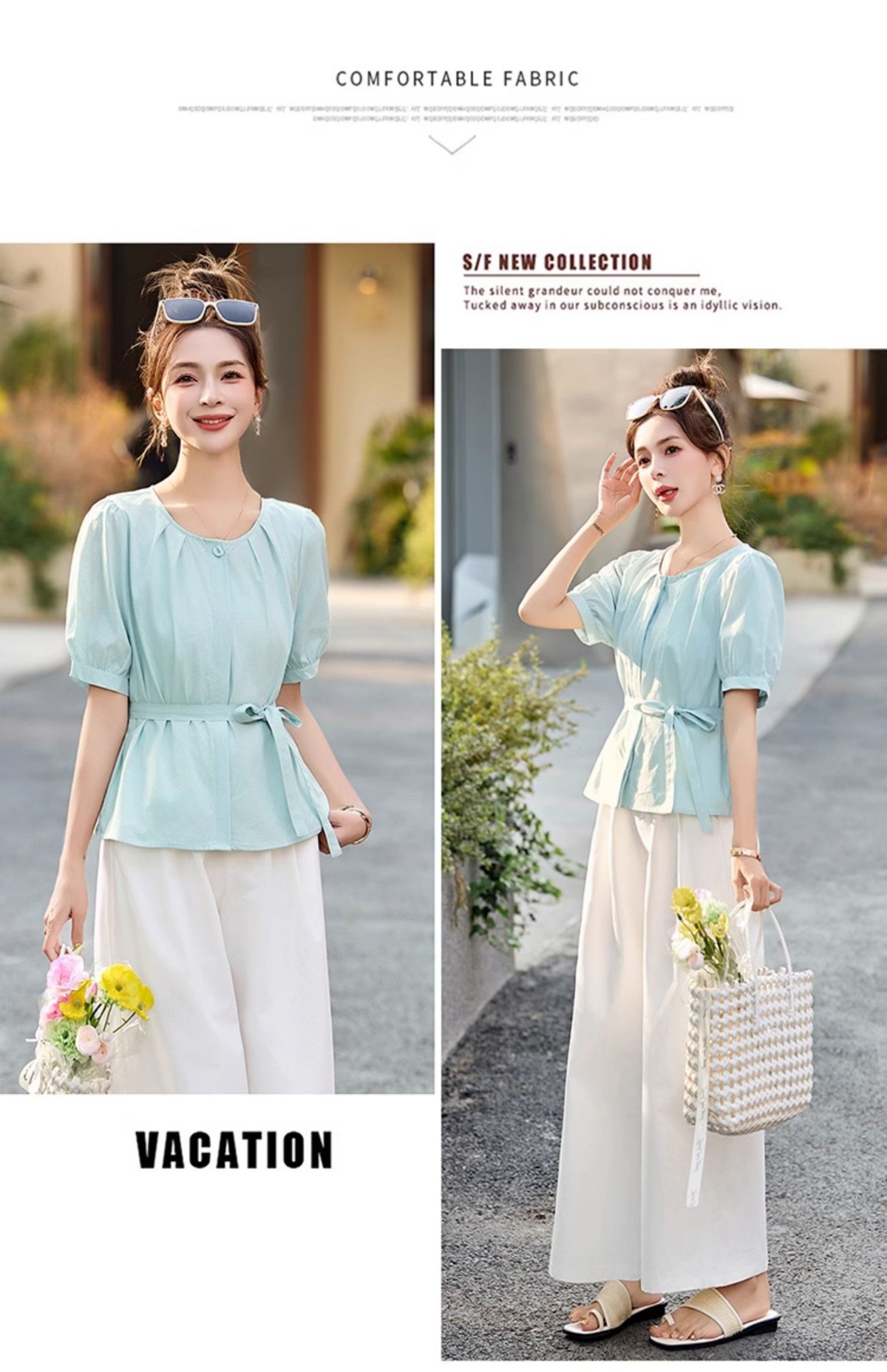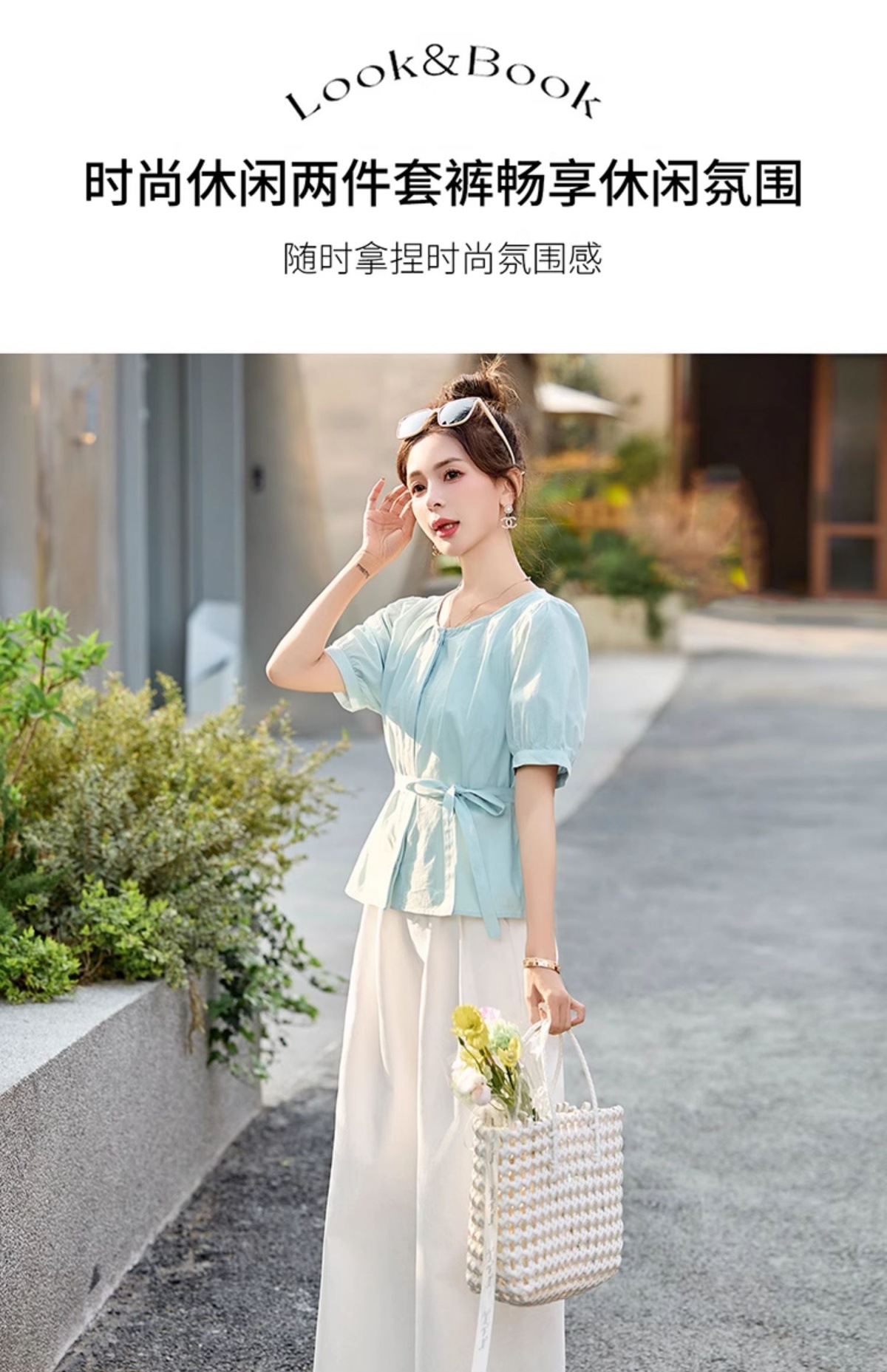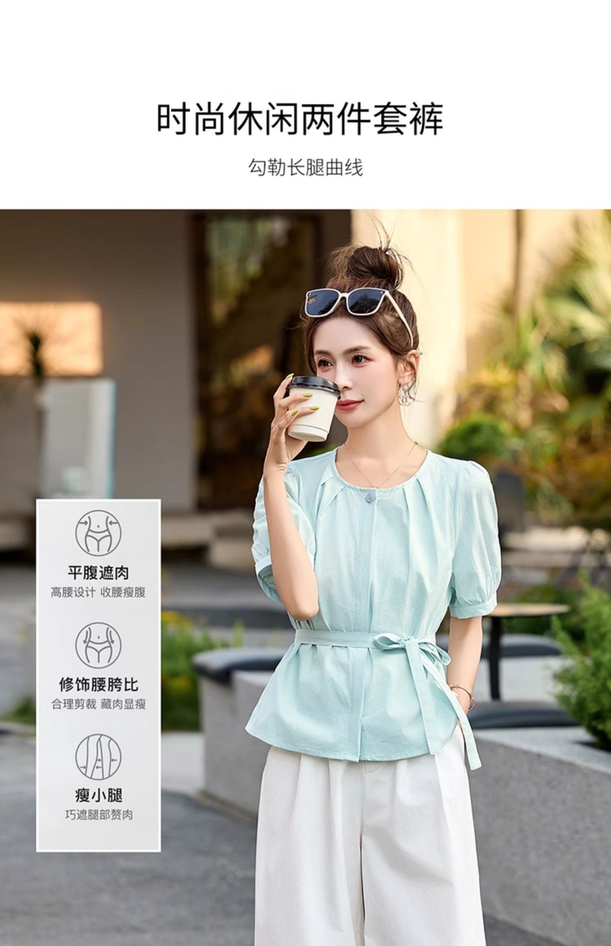 法式清新显瘦百搭圆领泡泡袖衬衫,高腰八分阔腿裤两件套HR-MUZL8027