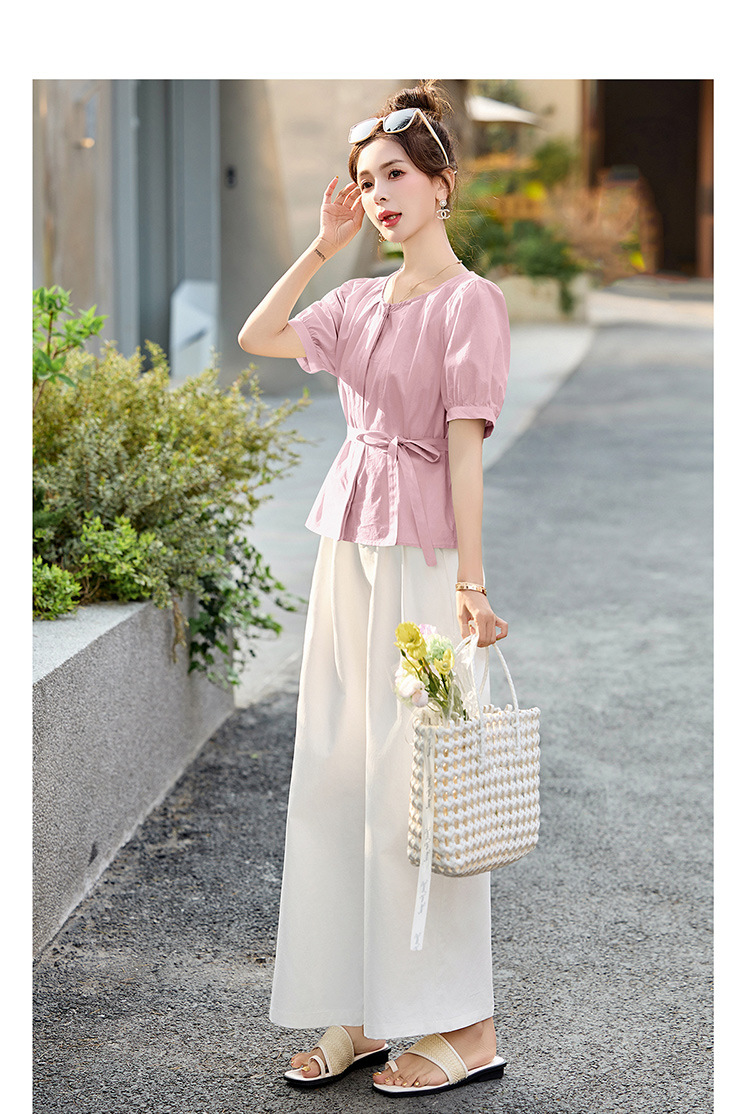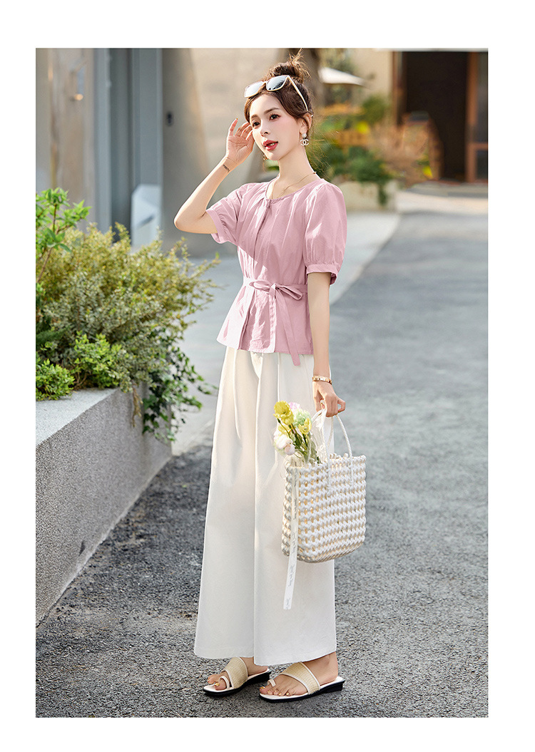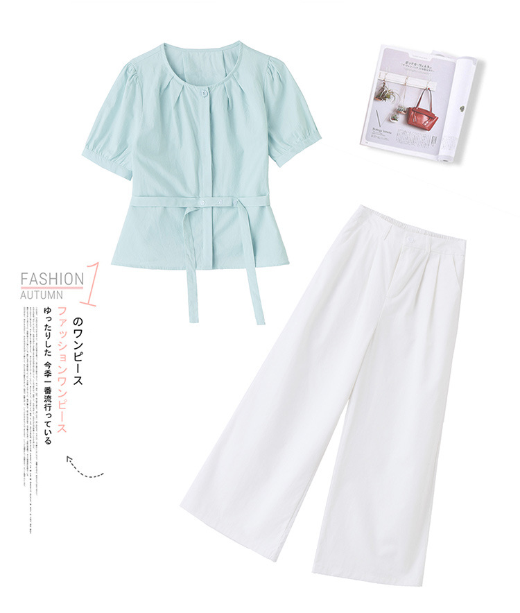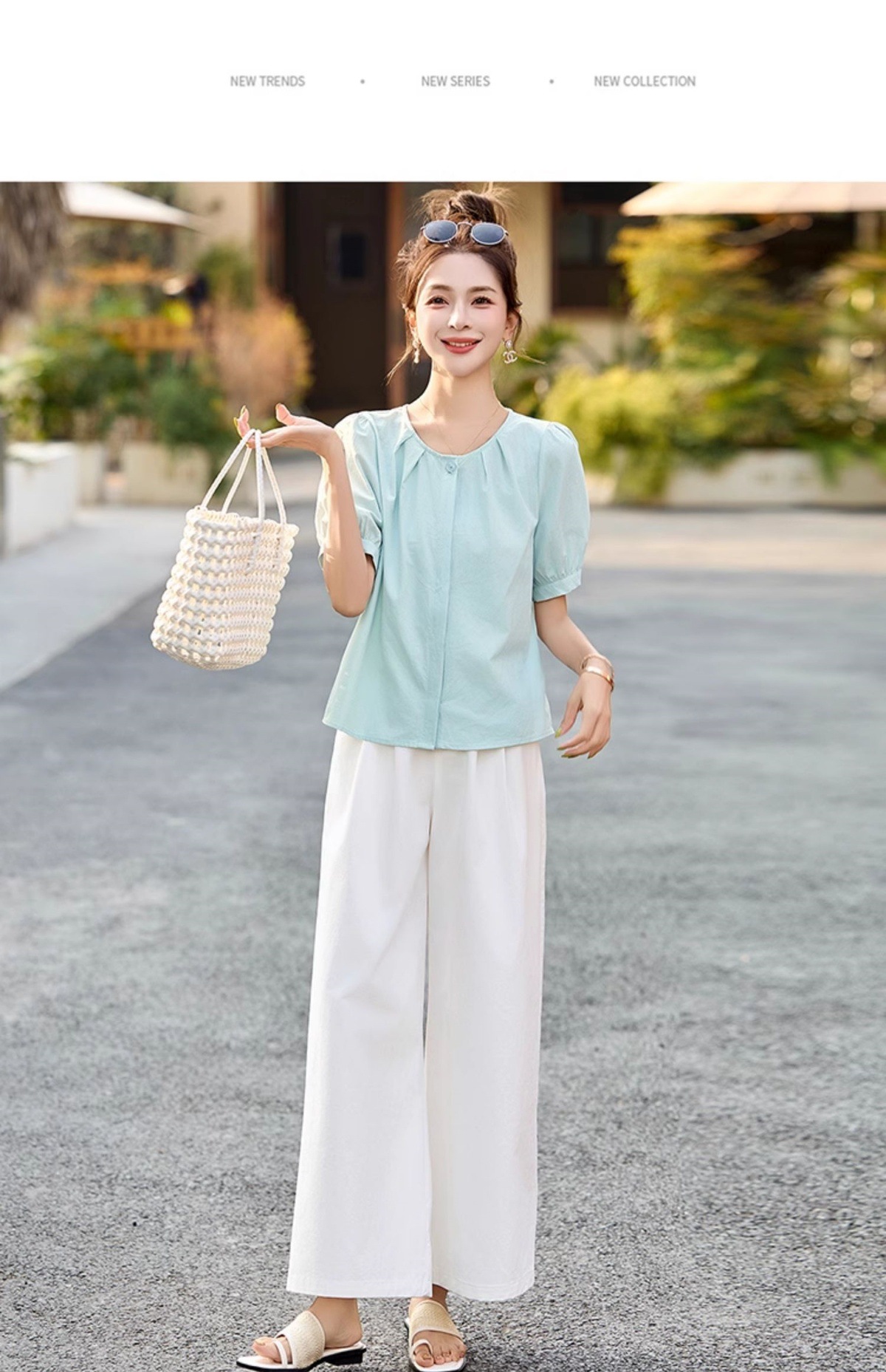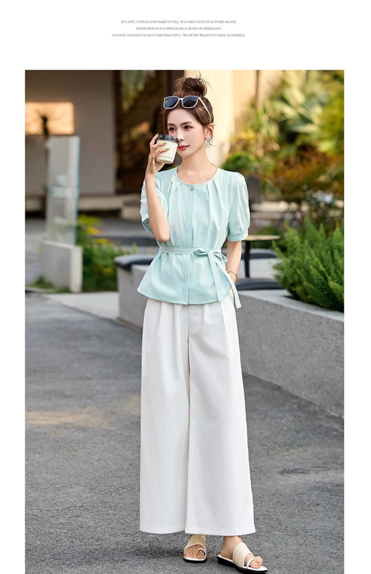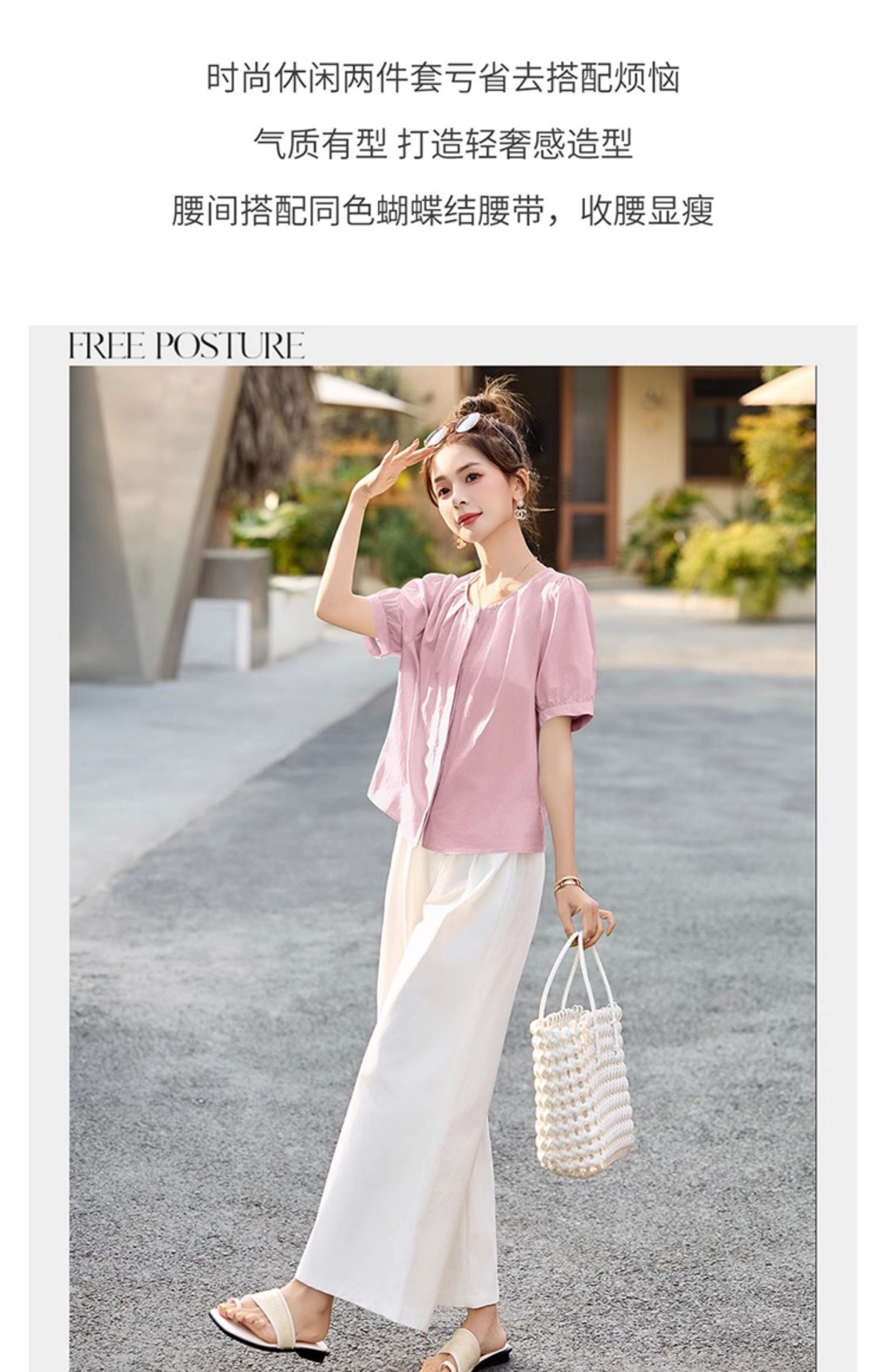 法式清新显瘦百搭圆领泡泡袖衬衫,高腰八分阔腿裤两件套HR-MUZL8027