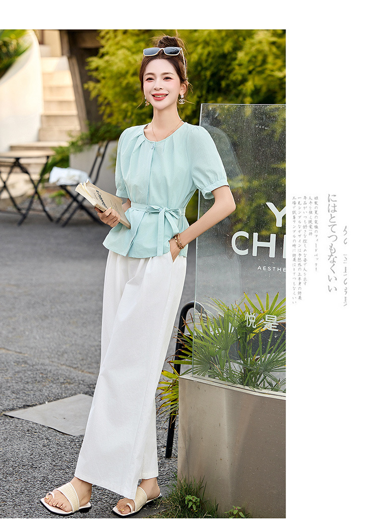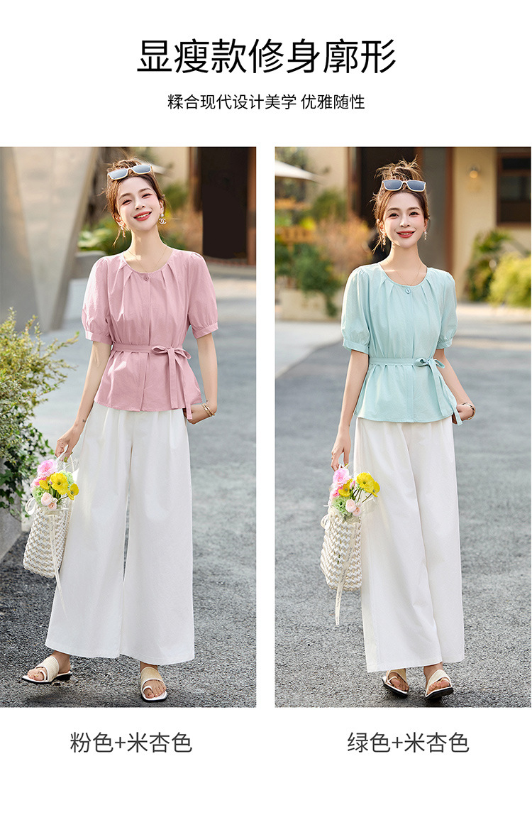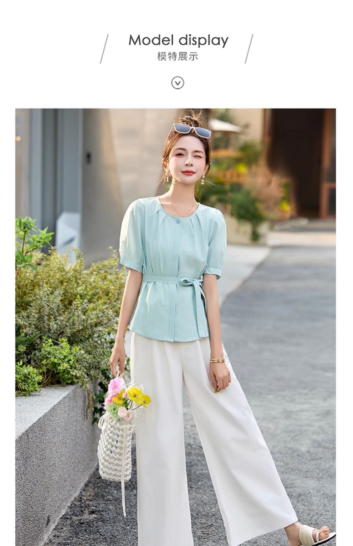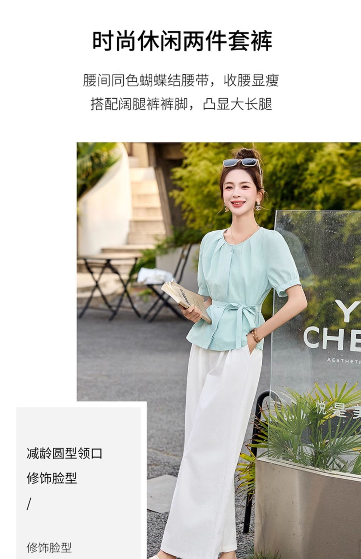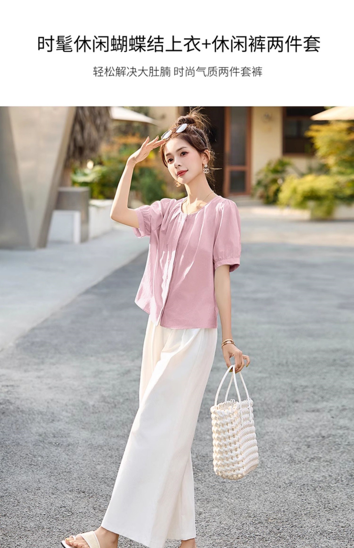 法式清新显瘦百搭圆领泡泡袖衬衫,高腰八分阔腿裤两件套HR-MUZL8027