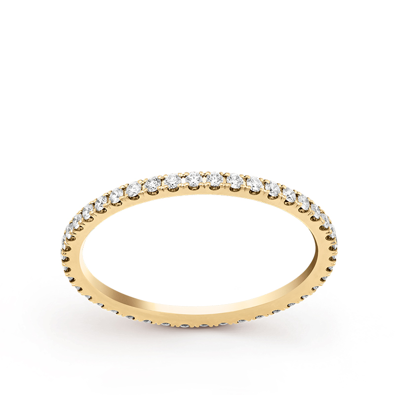Félicité 结婚戒指的黄金和钻石在光滑明亮的套装中融合在一起,营造出优雅的光泽和反射效果。全镶戒指的精致轮廓体现了品牌工匠的细致工作。
