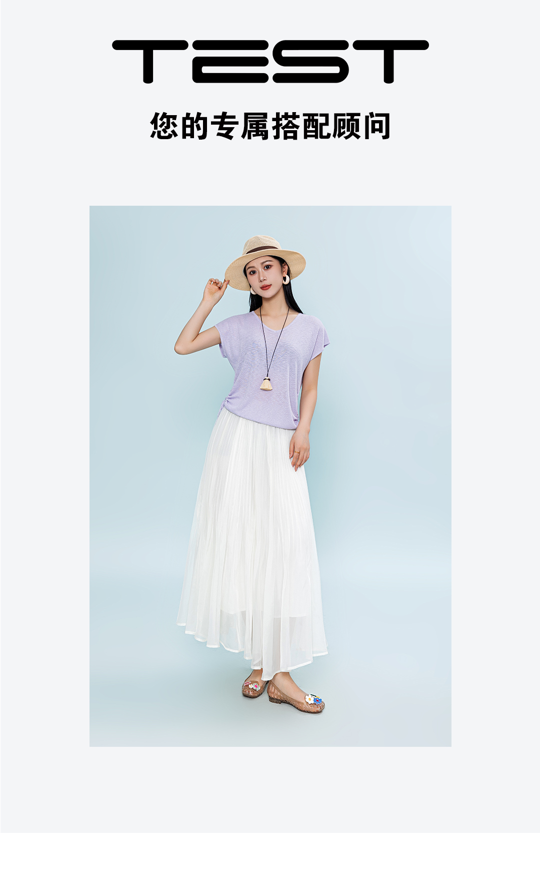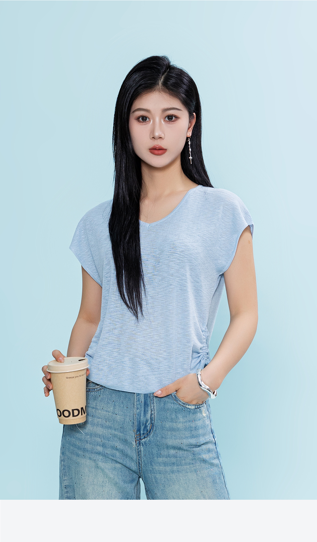夏上新韩系松弛感浅蓝色侧抽绳V领短袖针织1262070