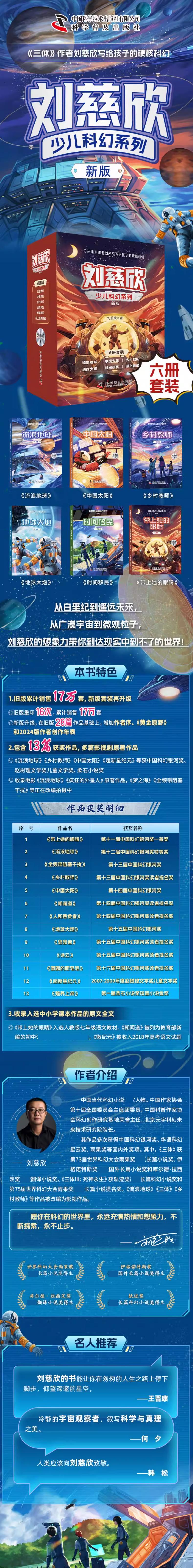 《刘慈欣少儿科幻系列》上市以来,已重印16次,累计销售17万套。本书为《刘慈欣少儿科幻系列》的2025年新版套装,包含科幻作家刘慈欣经典的29篇中短篇科幻小说,分为《流浪地球》《中国太阳》《乡村教师》《地球大炮》《时间移民》《带上她的眼睛》6册,增加了作者序、短篇小说《黄金原野》和2024版作者创作年表等内容。