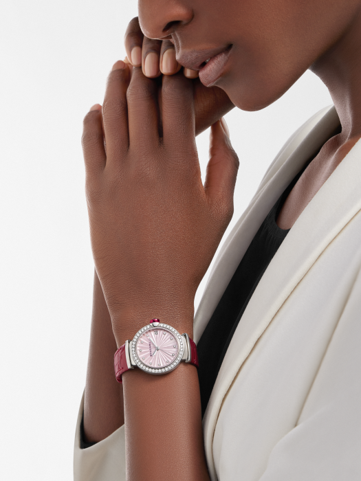 镜面 材质 | 蓝宝石水晶玻璃 | 表盘 | 精钢表壳 粉色珍珠母贝嵌花细工表盘 11颗钻石时标 精钢表圈镶嵌圆形明亮式切割钻石,精钢表冠镶嵌一颗凸形蛋面切割合成红碧玺(约0.816克拉)和一颗圆形钻石 透底 |