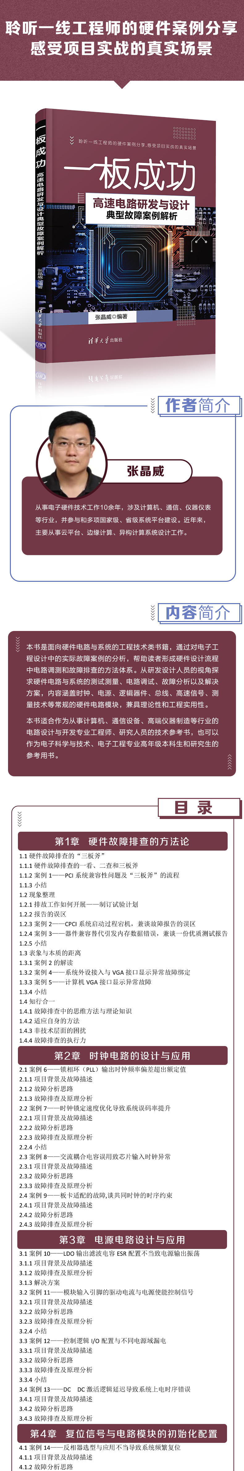 本书是面向硬件电路与系统的工程技术类书籍,通过对电子工程设计中的实际故障案例分析,帮助读者形成硬件设计流程中电路调测和故障排查的方法体系。从研发设计人员的视角探求硬件电路与系统的测试测量、电路调试、故障分析以及解决方案,内容涵盖时钟、电源、逻辑器件、总线、高速信号、测量技术等常规的硬件电路模块。兼具理论性和工程实用性。本书适合作为从事计算机、通信设备、高端仪器制造等行业的电路设计、开发专业工程师、研究人员的技术参考书,也可以作为电子科学技术、电子工程专业高年级本科生和研究生的参考用书。