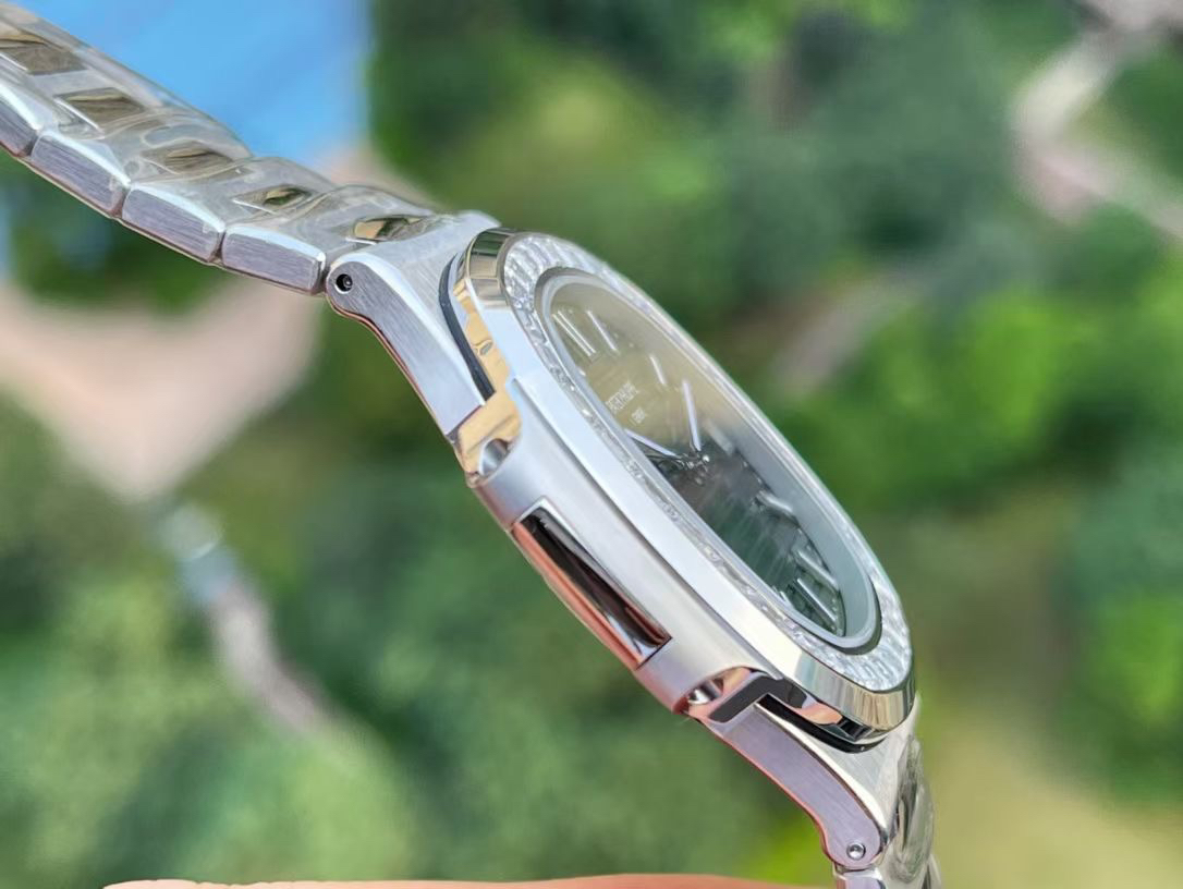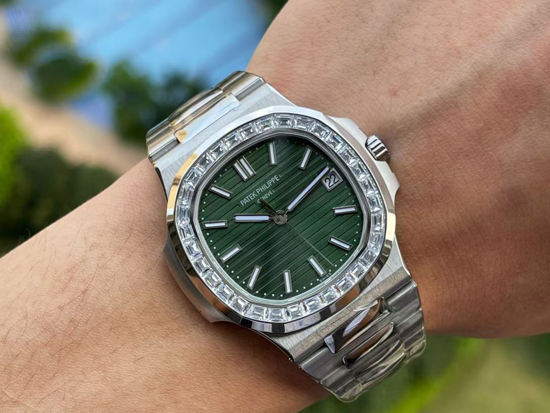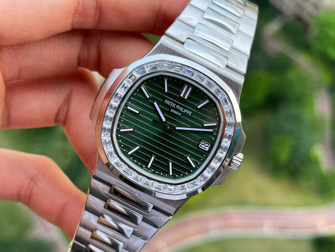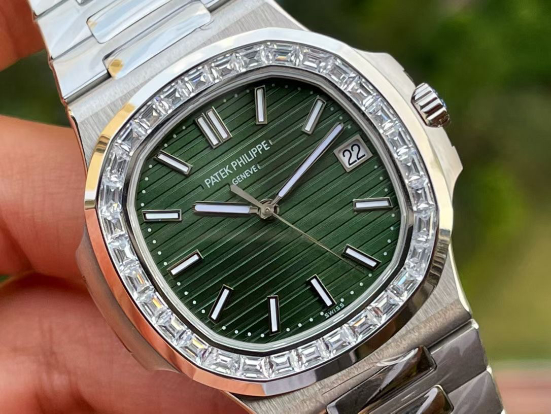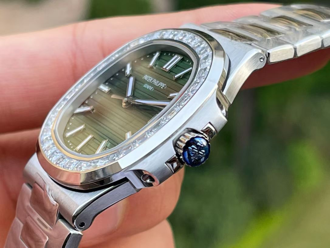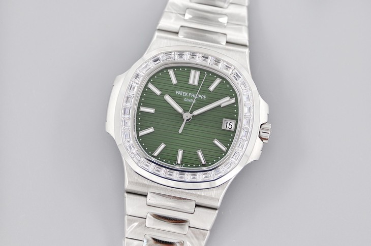 3k百达翡丽鹦鹉螺蓝灰面镶T方钻款镶嵌32颗顶级Wesselton长方形钻石(约3.6克拉),按照珠宝工艺大师最高标准镶嵌,令表身线条更显出众。当中精工细节:每颗长方形钻石切割形状特别略呈梯形,而非传统长方形模样,借此吻合八角形圆角表环轮廓。表面特色无与伦比,典型横向凸纹装饰,放射状加工效果透现光华。白金小时刻度与巴顿式圆头指针涂上夜光复合物料,确保日夜读时清楚。表壳与综合表链系在腕上恰到好处,稳妥舒适。全表可见人手抛光与磨拭加工元素细意交错,倍显线条交织效果。