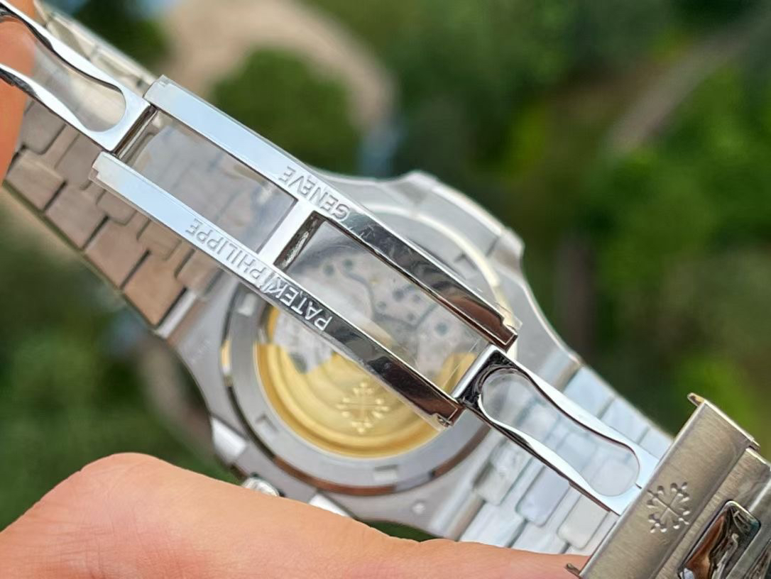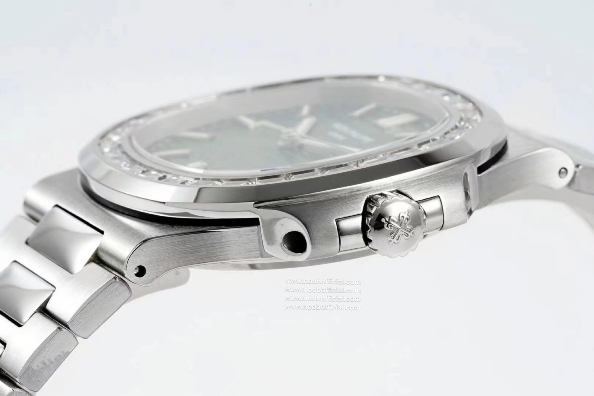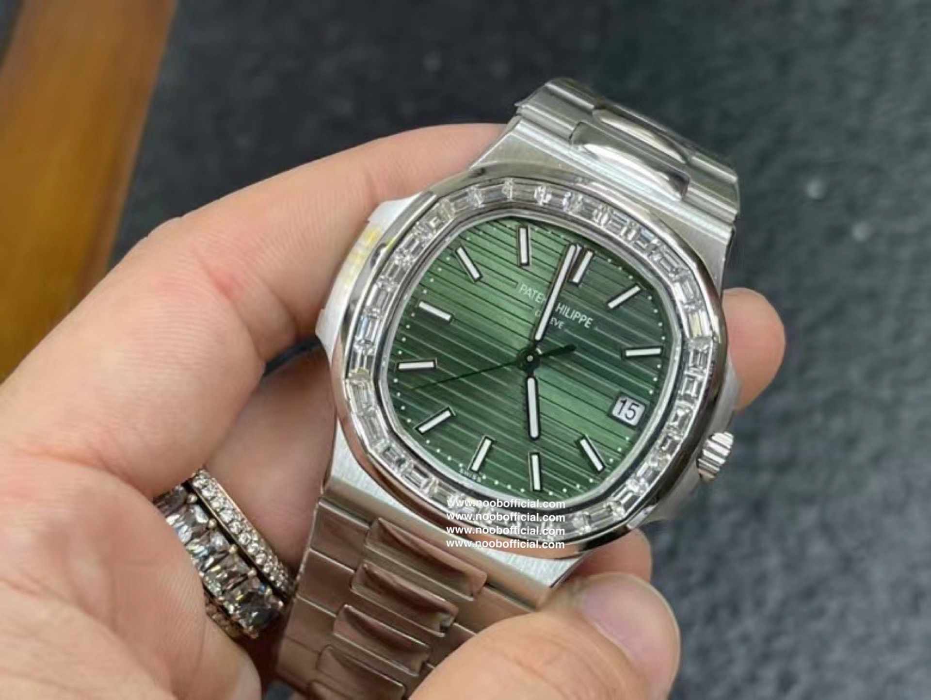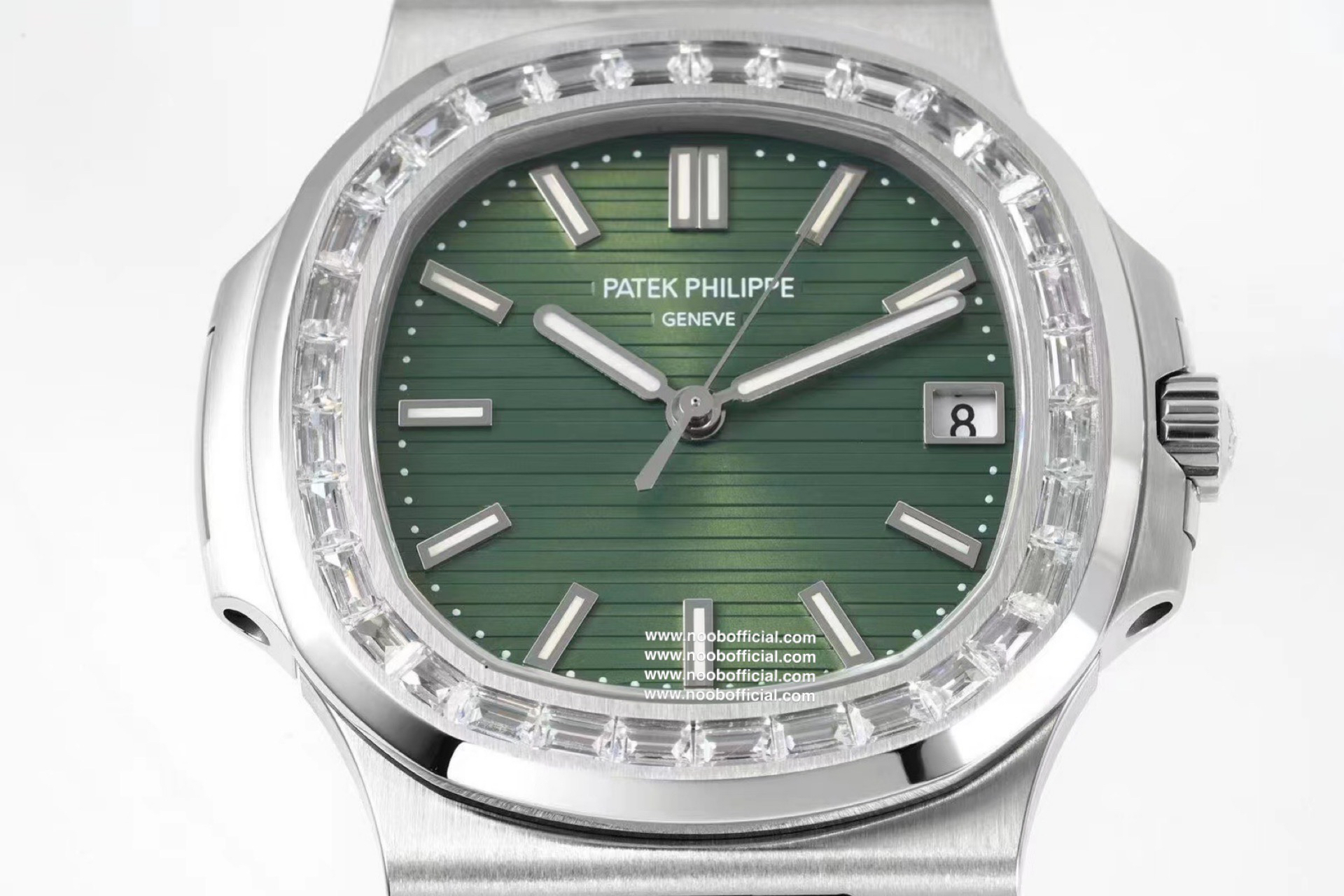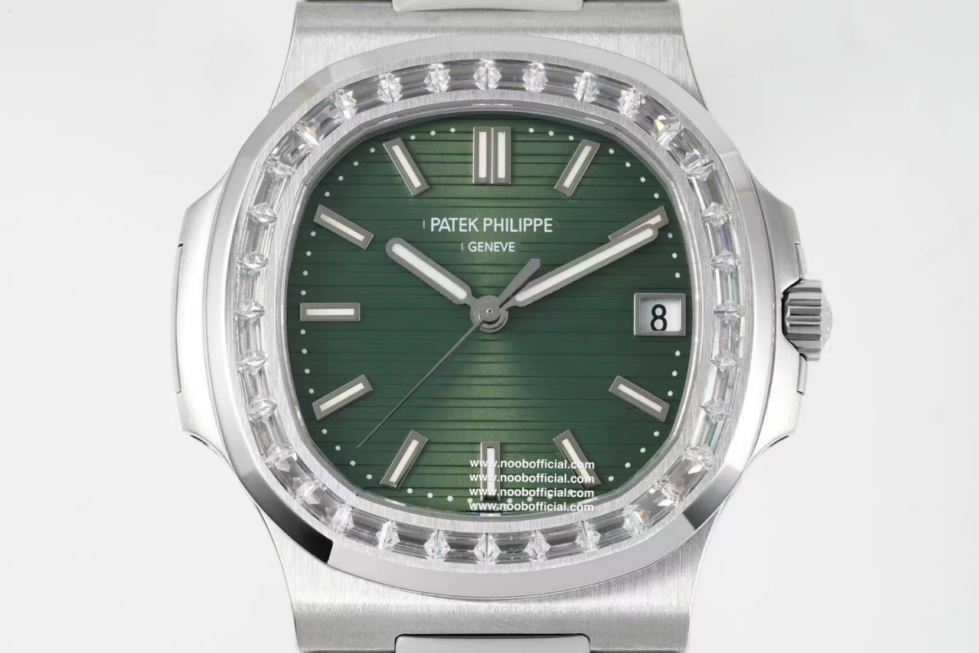 3k百达翡丽鹦鹉螺蓝灰面镶T方钻款镶嵌32颗顶级Wesselton长方形钻石(约3.6克拉),按照珠宝工艺大师最高标准镶嵌,令表身线条更显出众。当中精工细节:每颗长方形钻石切割形状特别略呈梯形,而非传统长方形模样,借此吻合八角形圆角表环轮廓。表面特色无与伦比,典型横向凸纹装饰,放射状加工效果透现光华。白金小时刻度与巴顿式圆头指针涂上夜光复合物料,确保日夜读时清楚。表壳与综合表链系在腕上恰到好处,稳妥舒适。全表可见人手抛光与磨拭加工元素细意交错,倍显线条交织效果。