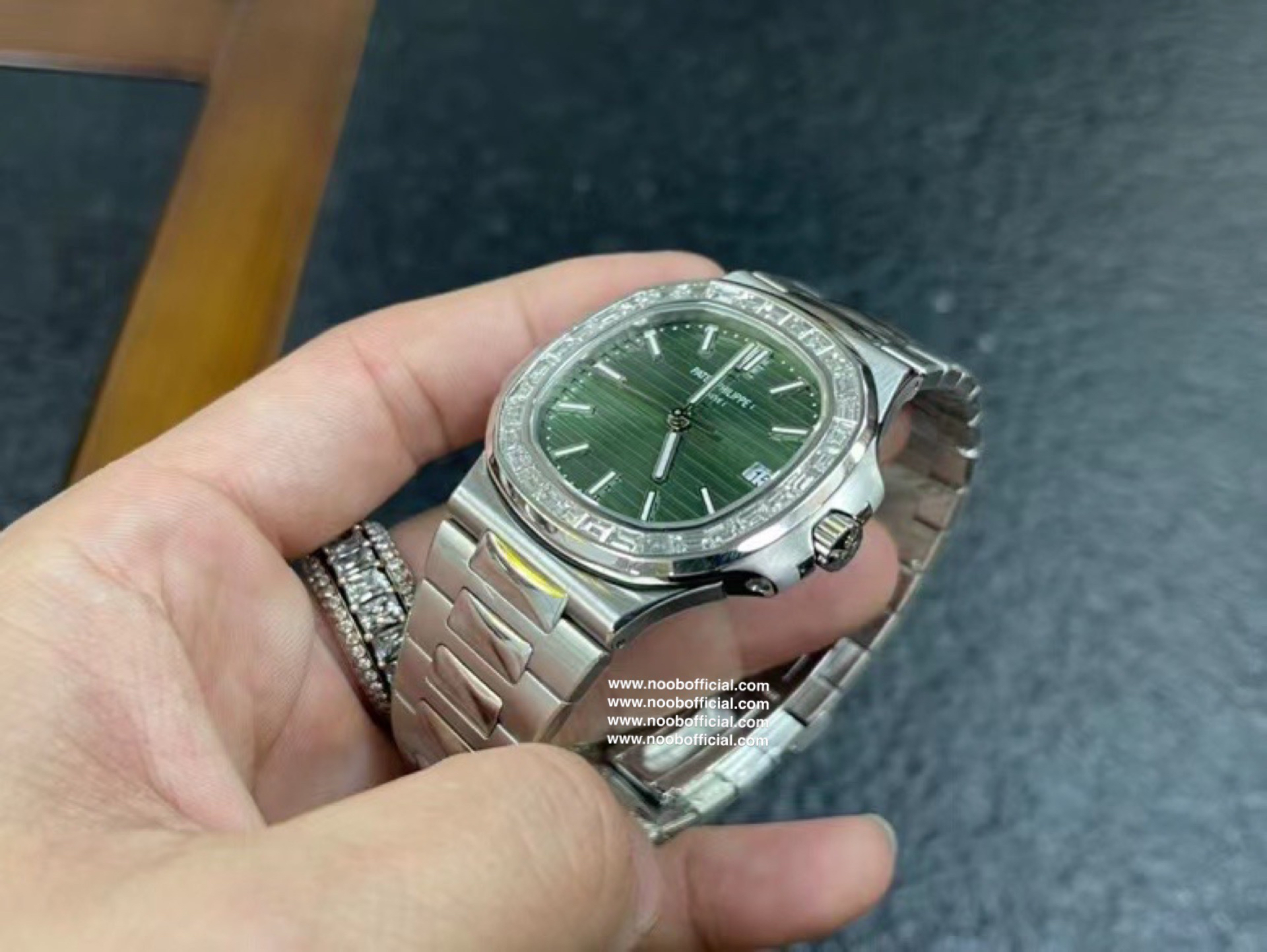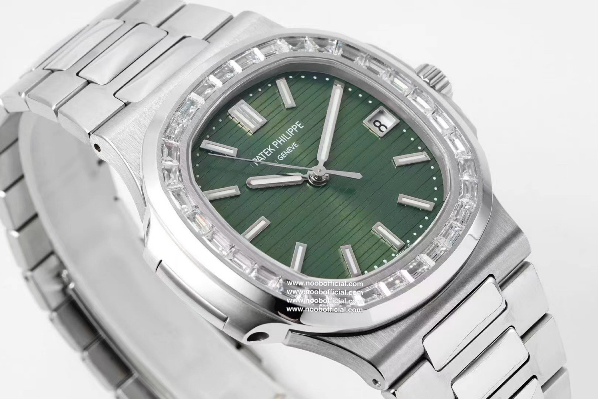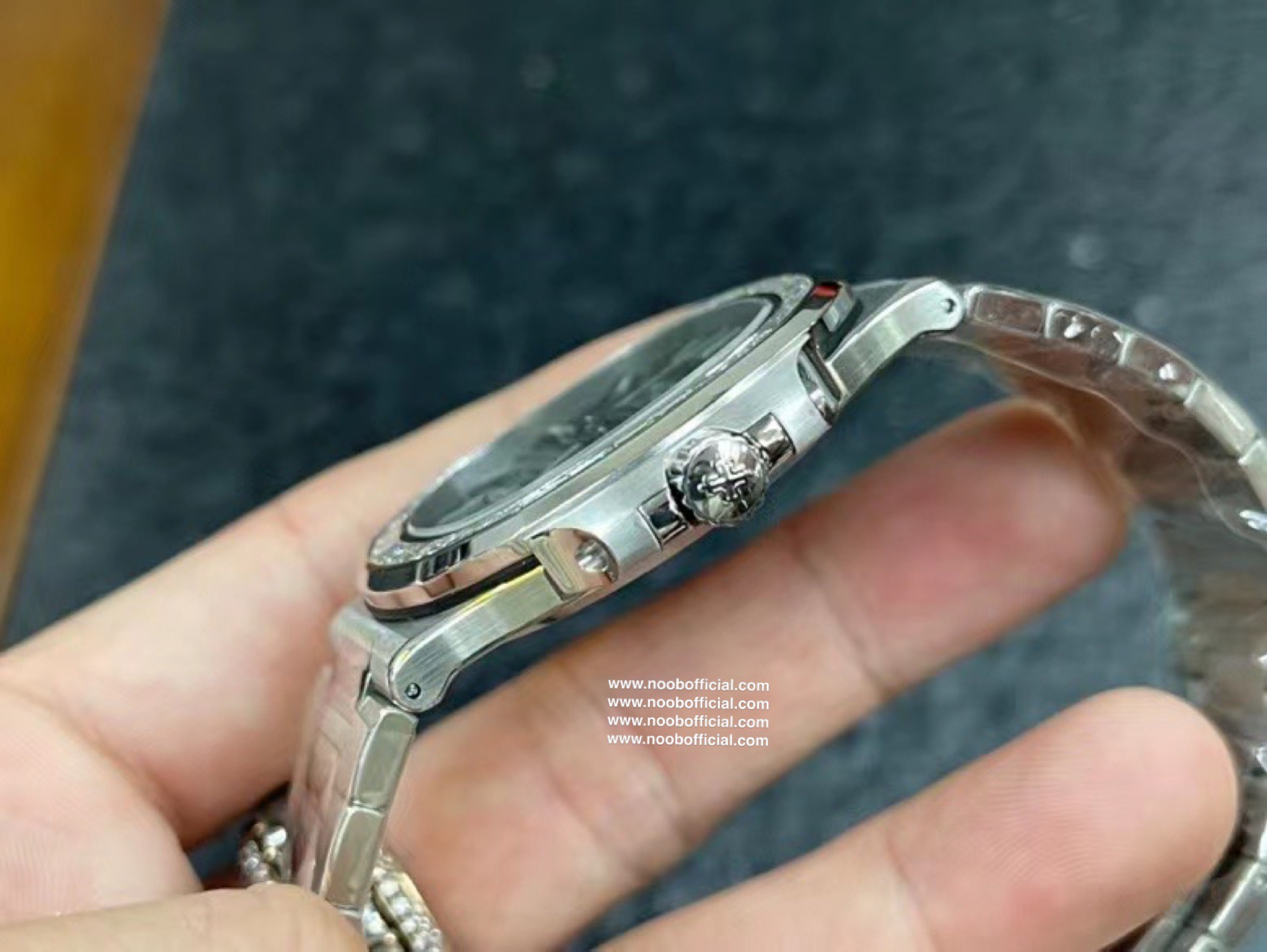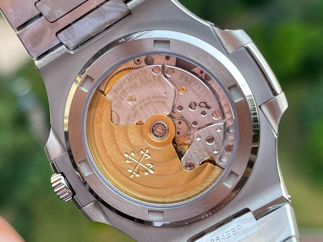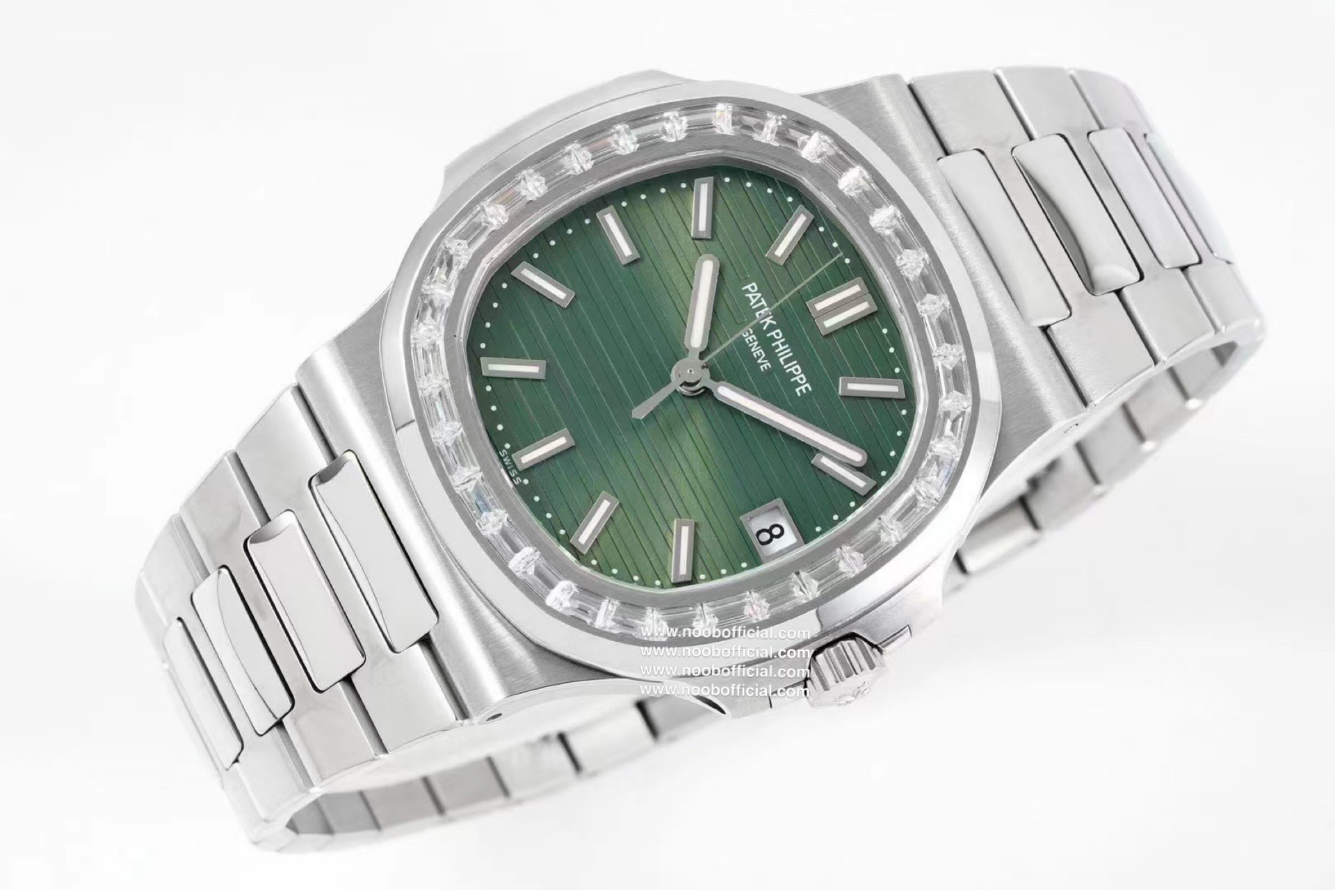 3k百达翡丽鹦鹉螺蓝灰面镶T方钻款镶嵌32颗顶级Wesselton长方形钻石(约3.6克拉),按照珠宝工艺大师最高标准镶嵌,令表身线条更显出众。当中精工细节:每颗长方形钻石切割形状特别略呈梯形,而非传统长方形模样,借此吻合八角形圆角表环轮廓。表面特色无与伦比,典型横向凸纹装饰,放射状加工效果透现光华。白金小时刻度与巴顿式圆头指针涂上夜光复合物料,确保日夜读时清楚。表壳与综合表链系在腕上恰到好处,稳妥舒适。全表可见人手抛光与磨拭加工元素细意交错,倍显线条交织效果。