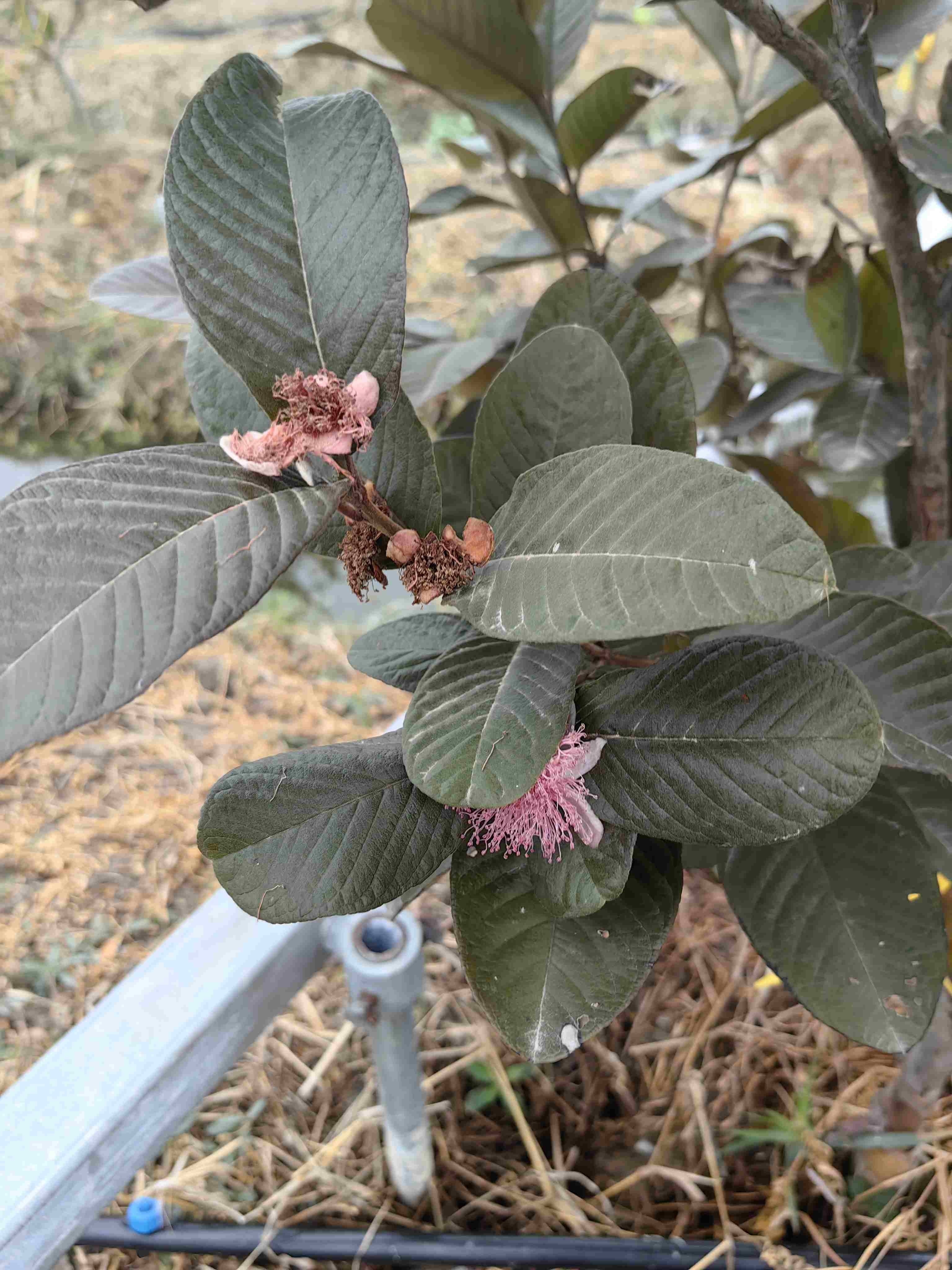 有幸看到的紫红色的芭乐,不仅开了花,还结了个成熟的果。说是新培育的品种,他们自己都很难等到。我一去,竟开花结果,而且还成熟了。