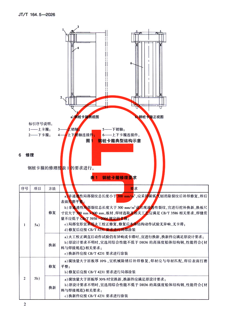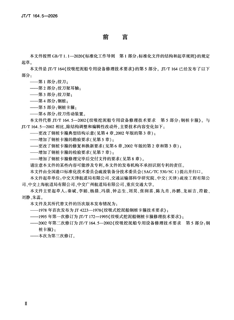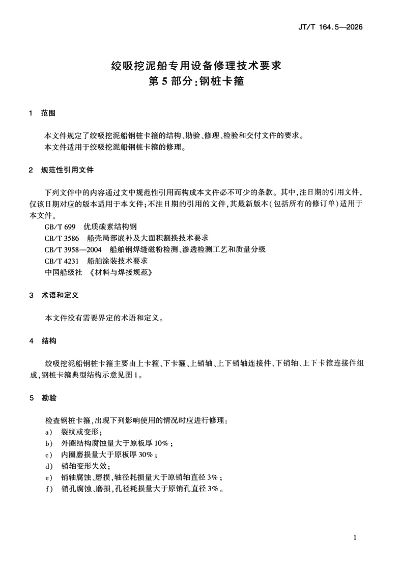 书名:绞吸挖泥船专用设备修理技术要求 第5部分:钢桩卡箍(JT/T 164.5—2025)