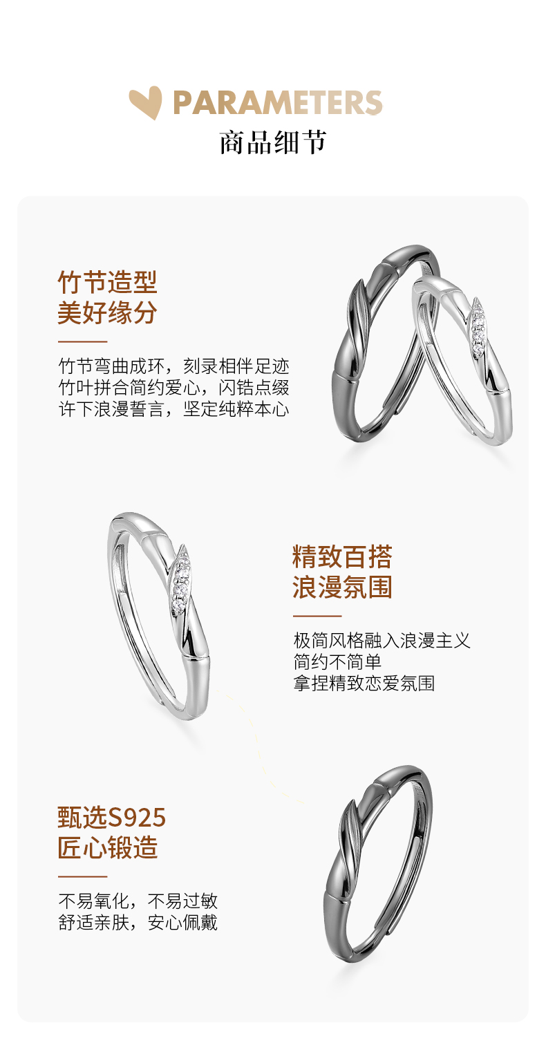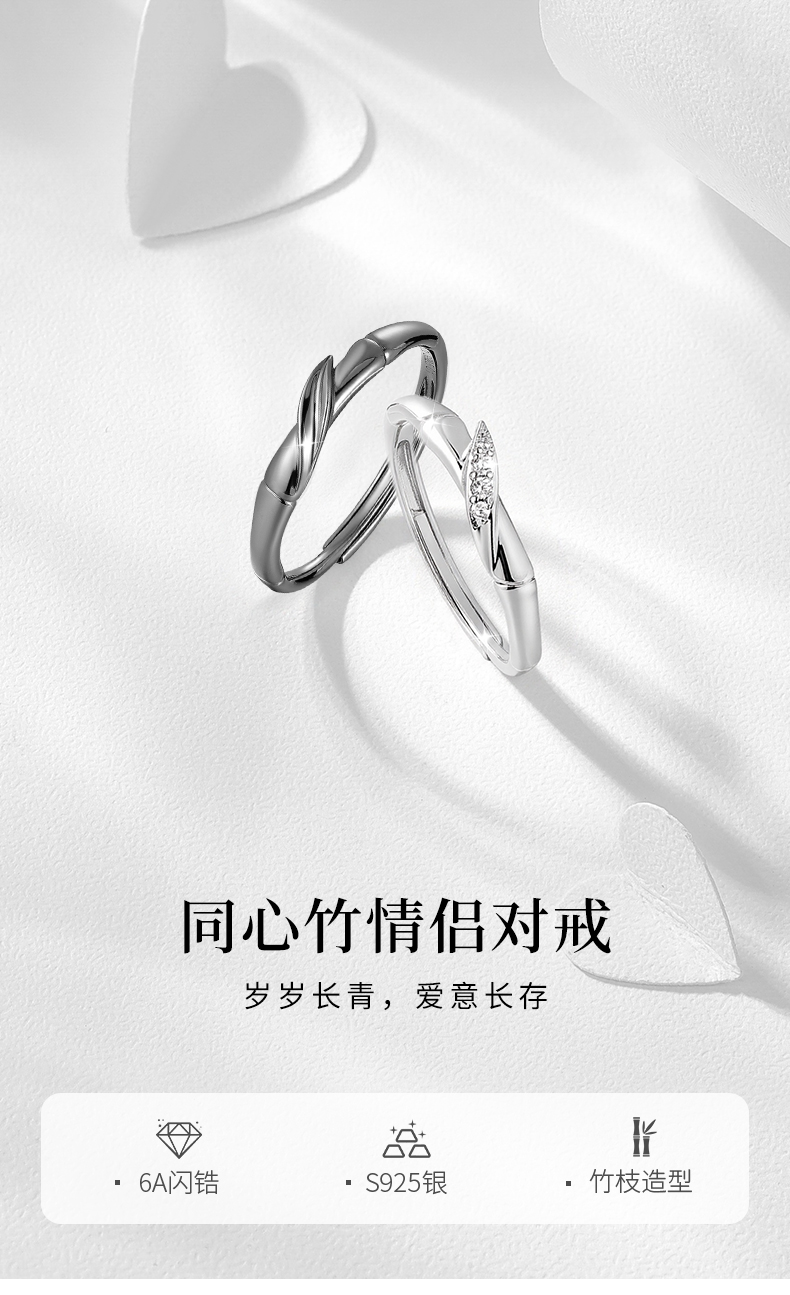 卡蒂罗KADER 同心竹情侣对戒 竹够爱你925银灵动吸睛节节高升竹节开口可调节素圈一对 恋爱表白浪漫限定女友