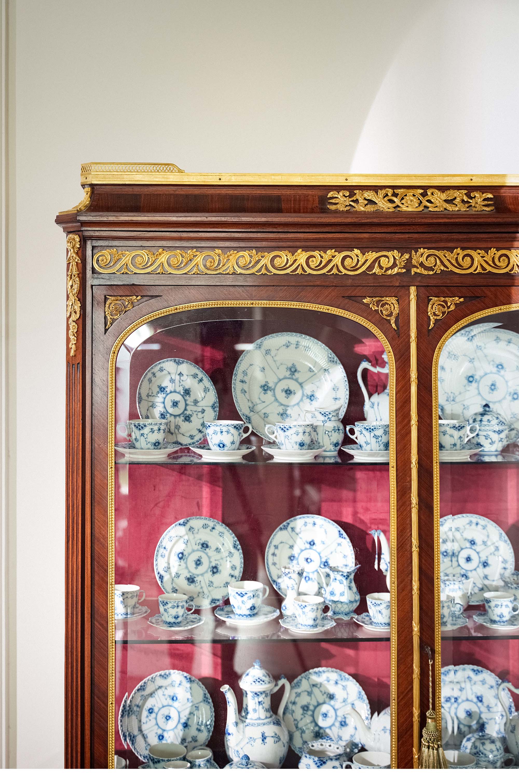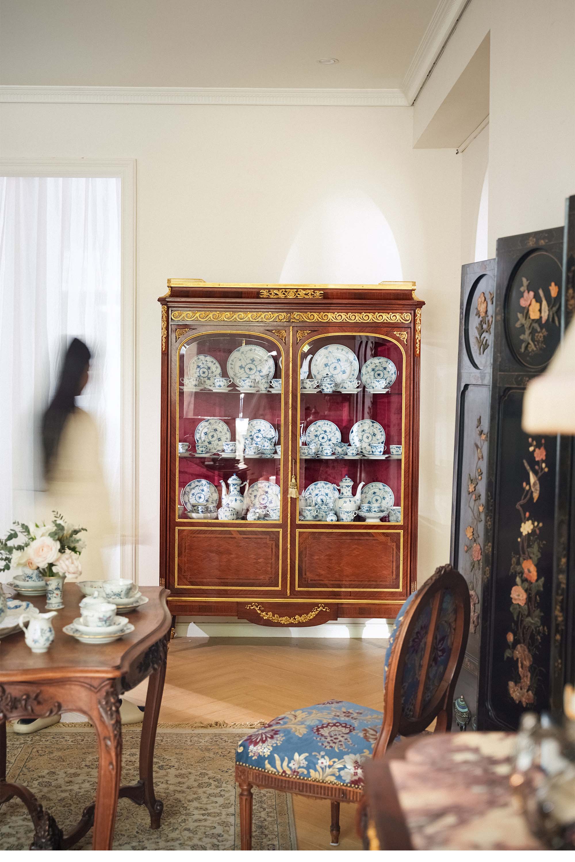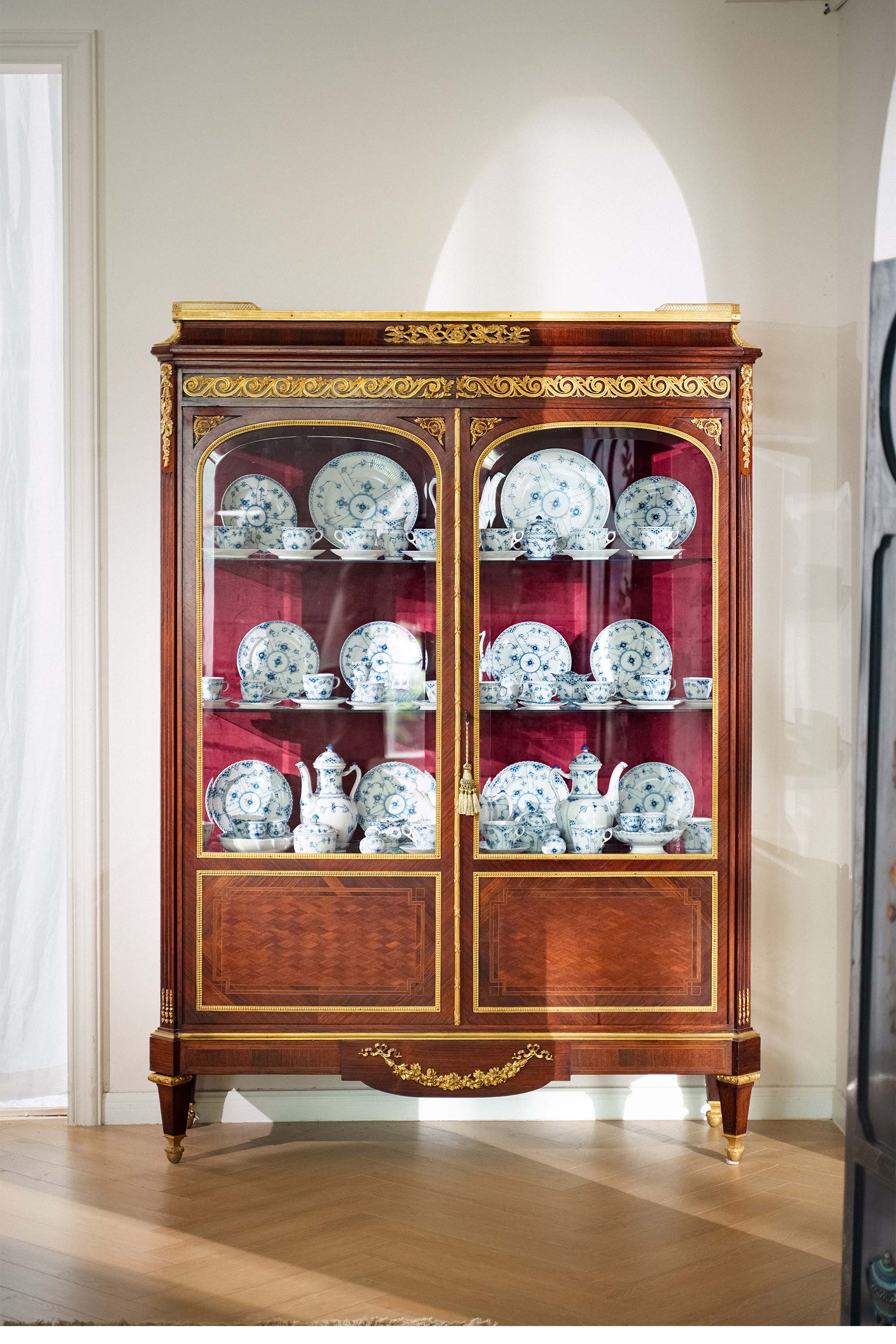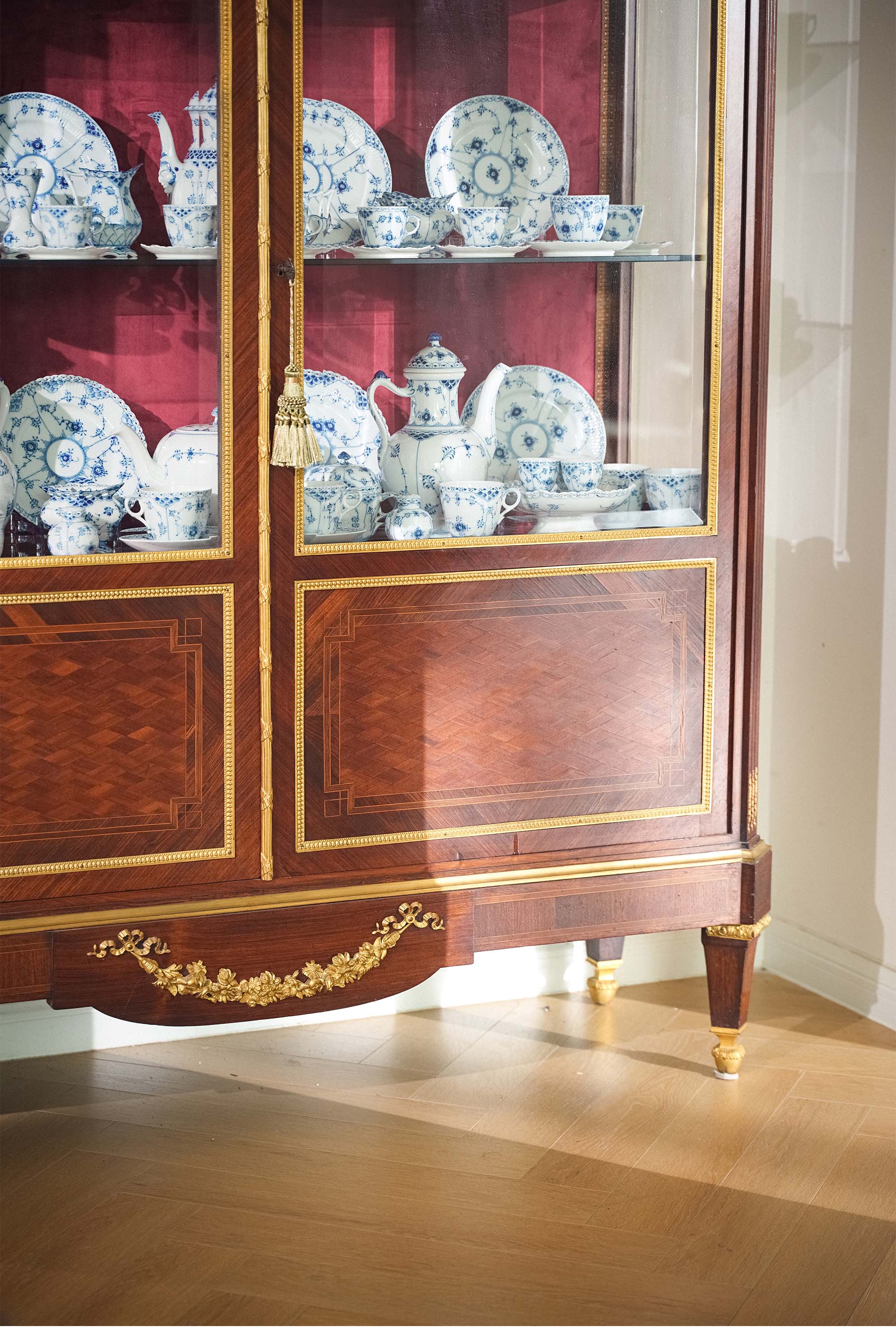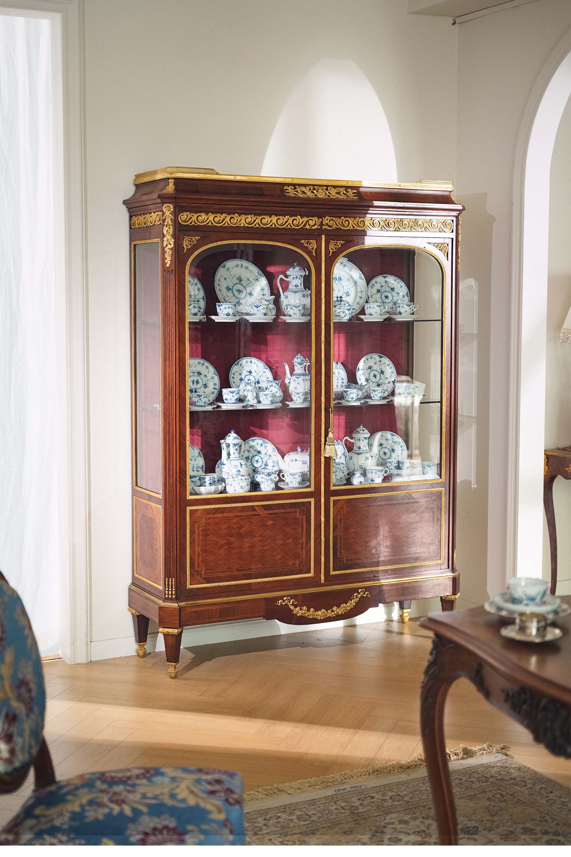 19世纪末法国Mercier Freres家具工坊出品路易十六风格卷叶纹铜鎏金精雕装饰实木镶嵌玻璃柜陈列柜