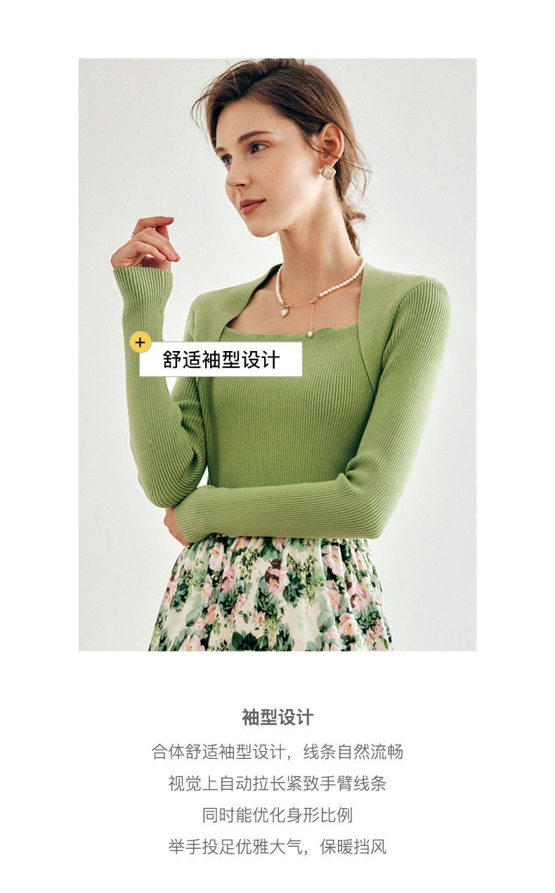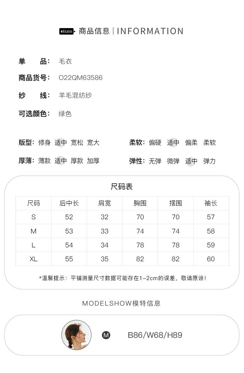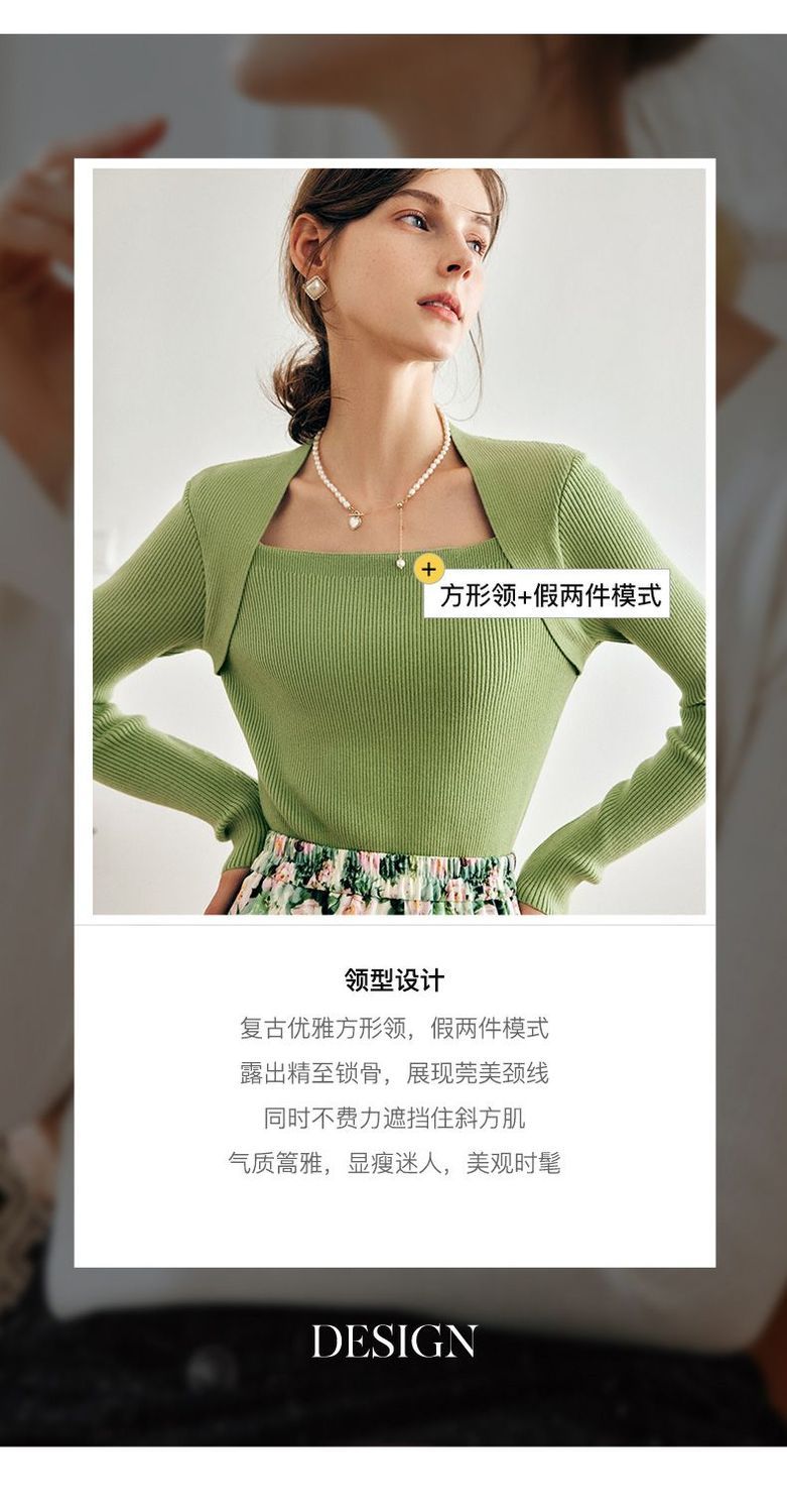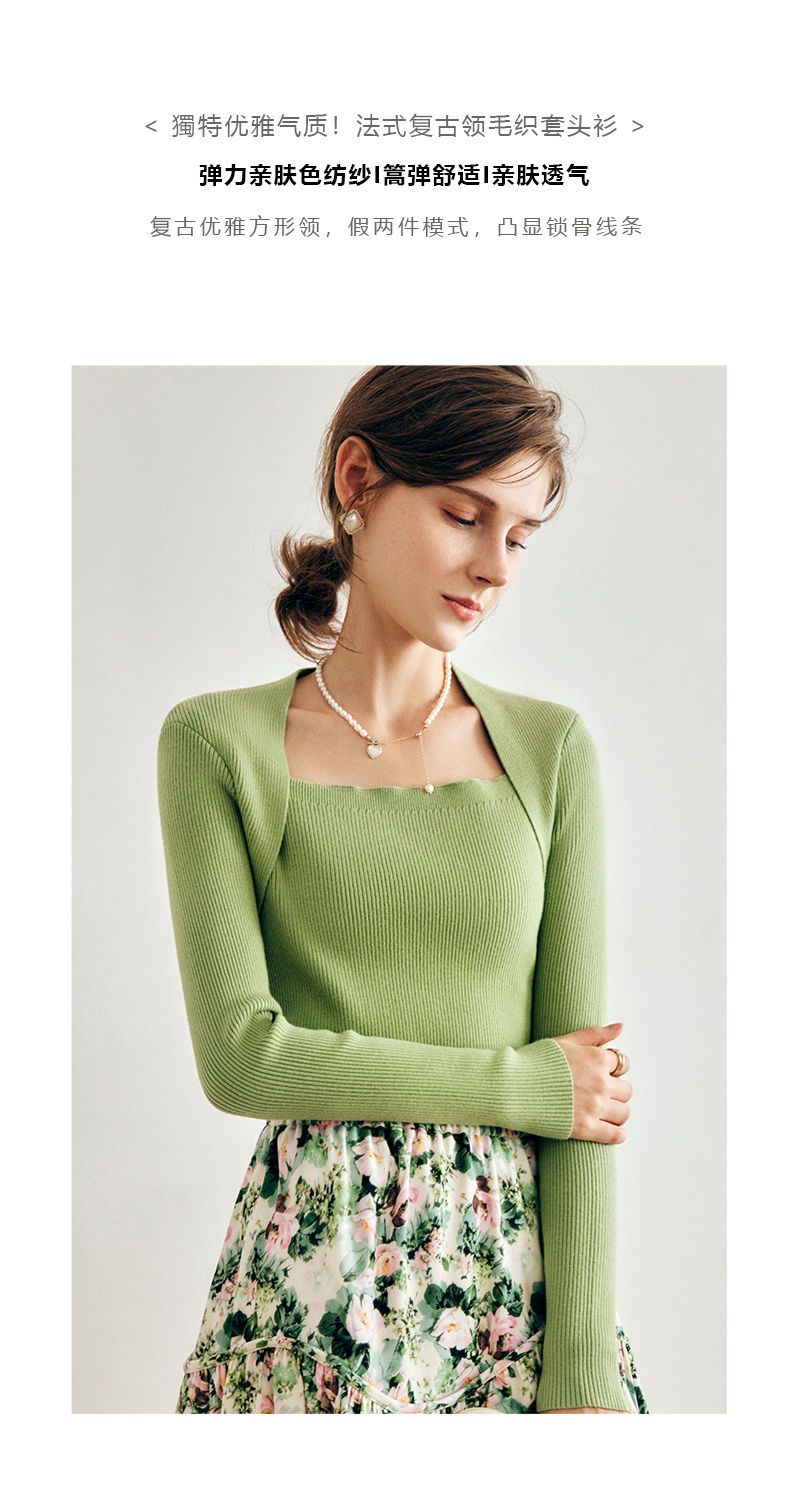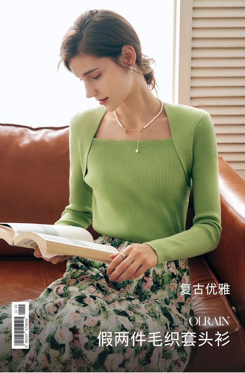 OLrain欧芮儿法式绿色套头针织衫女秋季2022年新款修身假两件毛衣