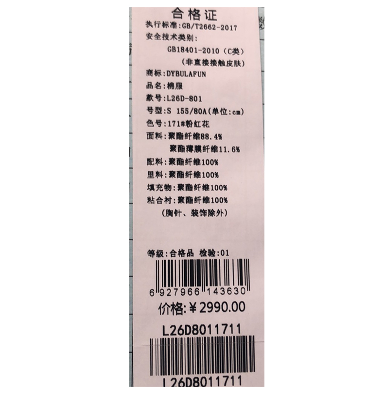 戴布拉芬棉服L26D801