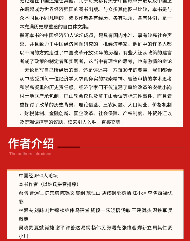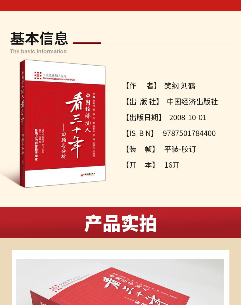 | 无论是在中国还是在其他,几乎每天*有关于中国改革开放以及中国正在崛起成为世界经济强国的图书出版。与众多其他图书比较,本书是与众不同且不同凡响的,诸多作者各有经历、各有视角、各有体例,是一本充满历史厚重感的自由体文集。 撰写本书的中国经济50人论坛成员,是具有国内水准、享有较高社会声誉、并且致力于中国经济问题研究的一批经济学家。他们中的许多人*以不同的方式走过了中国改革开放30年的历程,有些人还从政策的建言者成了政策的制定者和实践者,这当中有理性的思考,也有激情的辩论。无论是写自己所经历的事,还是评述某一方面30年的变革,我们*会从中感受到每一位经济学人求真务实的探索精神、睿智审慎的学术思考和崇高凝重的历史责任感。经济学家们不仅追溯了肇始改革的安徽小岗村土地联产承包制、巴山轮会议以及莫干山会议等标志性事件,而且着重探讨了改革的历史背景、理论借鉴、三农问题、人口*业、价格机制、财税体制、金融创新、国企改革、社会保障、产权制度、外贸外汇以及宏观调控等的议题,读来引人入胜,百感交集。 各位*学者希望通过进一步深入思考和总结中国经济改革开放的经验与教训,初步探索中国改革模式的理论解释,为续写中国未来发展的辉煌与,为推进中国转轨经济和世界转轨经济的研究,为世界经济学的发展贡献一份独特的力量。 |