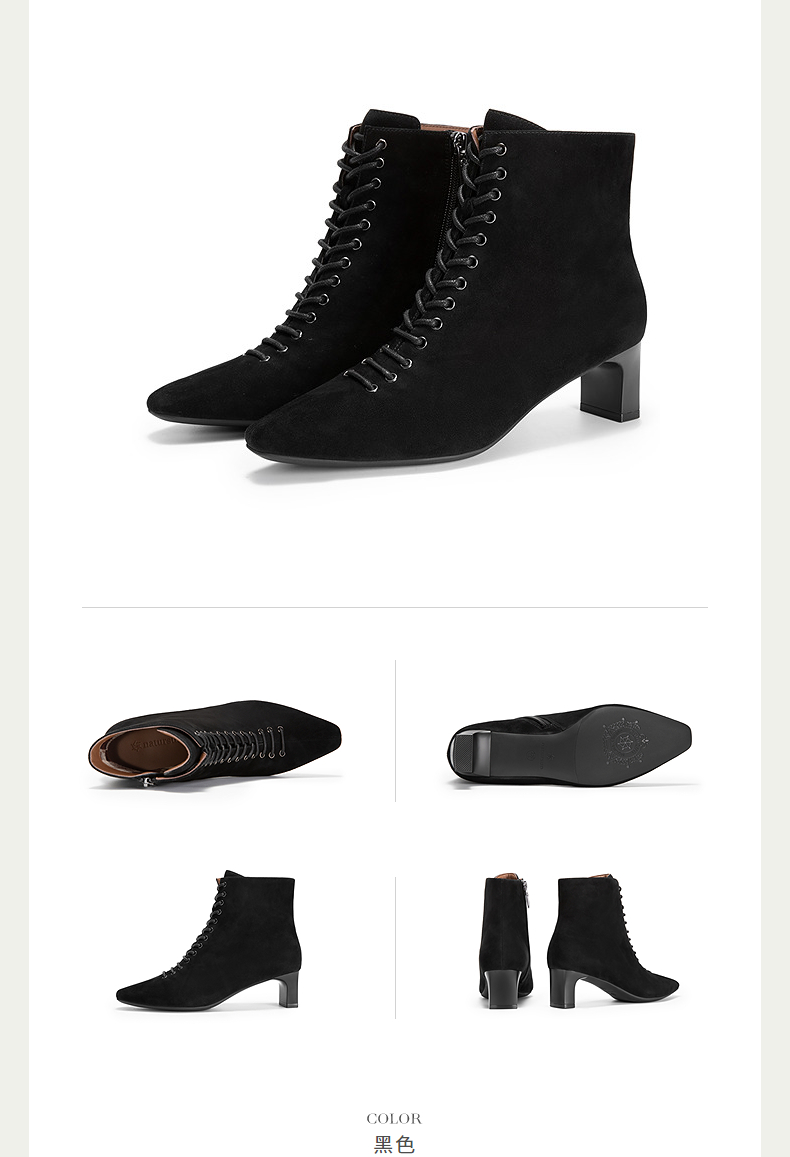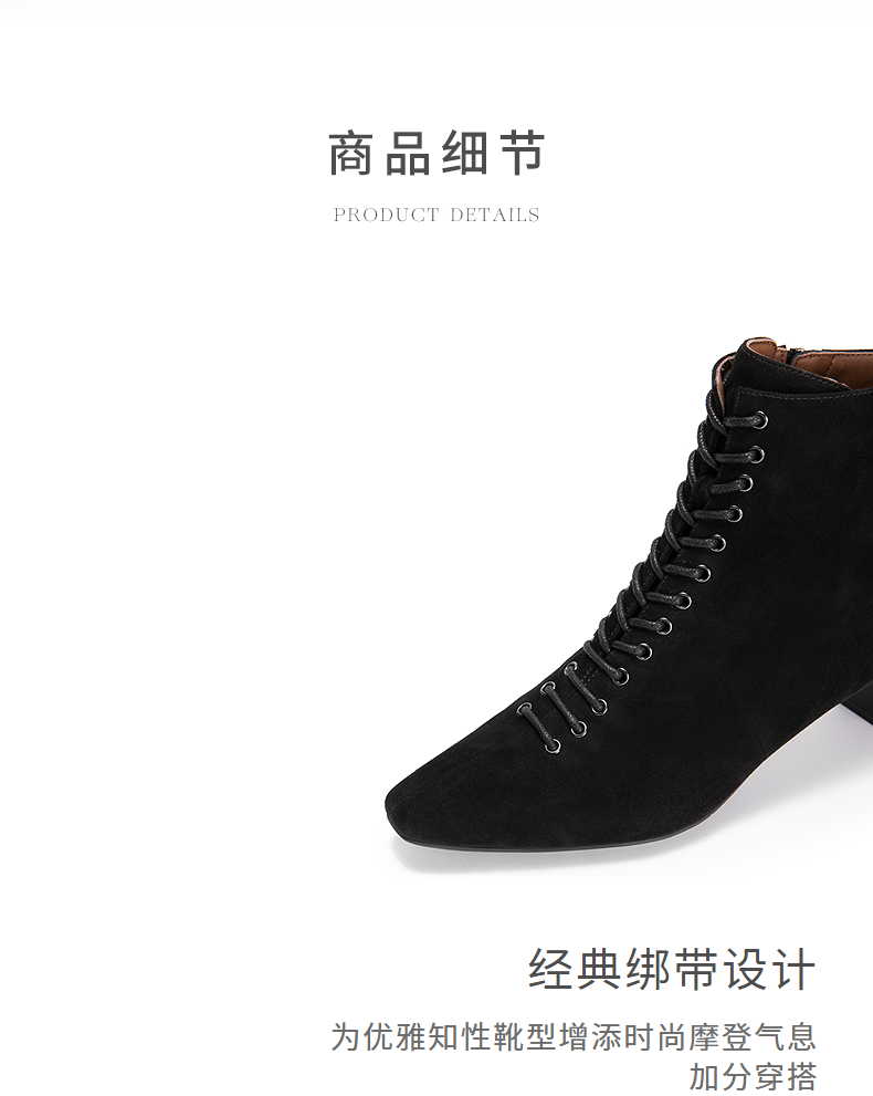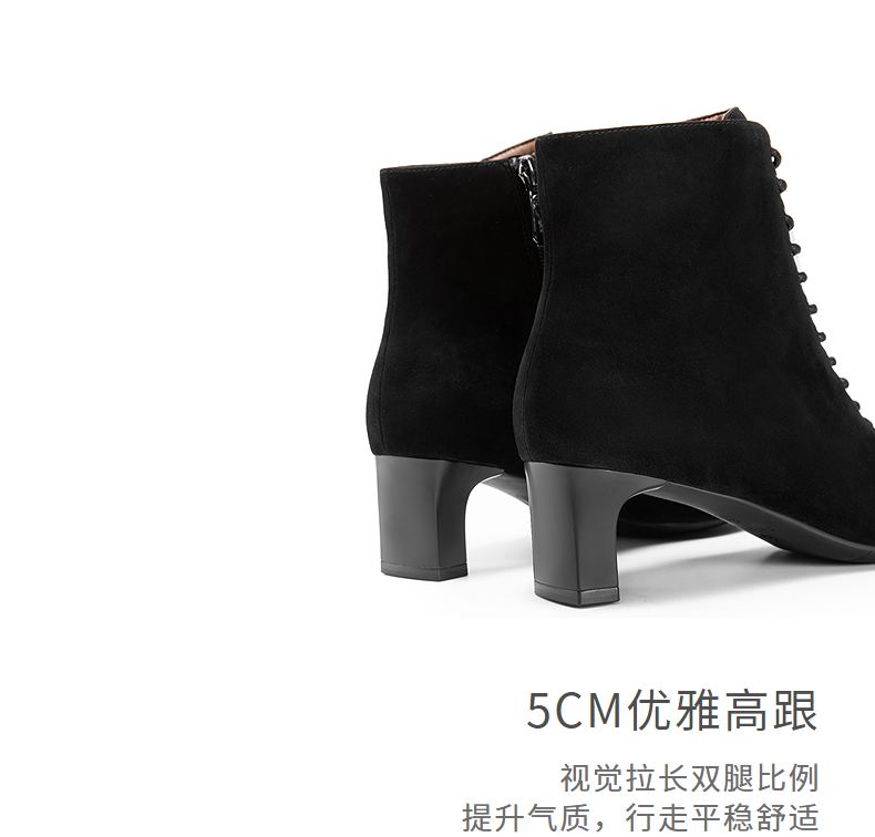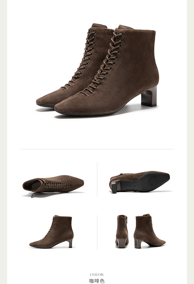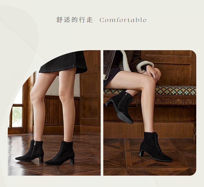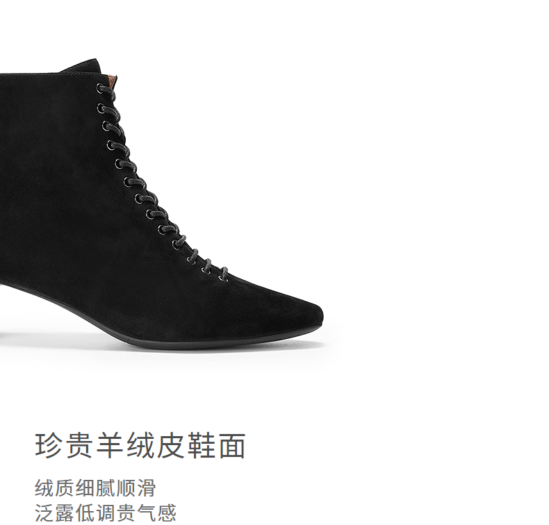 natursun复古时装靴女冬季系带绒面时尚气质短靴显瘦高跟靴子N25546019