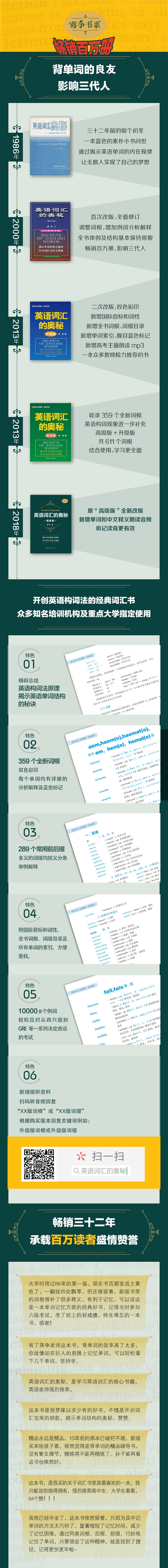 1.背单词的“圣经”,百万畅销书作者蒋争书系,开创英语构词记忆法的经典词汇书。2.600个使用频率极高的熟词,派生上万个相关单词,快速累计你的词汇量。3.剖析单词的繁衍与词缀的种类。逐词分析,搭配前后缀记忆,以一识百。4.双色印刷,版面简洁。附国际音标、词性、重点释义,每个单词都用颜色标明,好看易背。5.新增微信小程序和试听资料,扫描封底小程序二维码,或在微信小程序上搜索“英语词汇的奥秘”即可收听纯真美音朗读,边听边学。